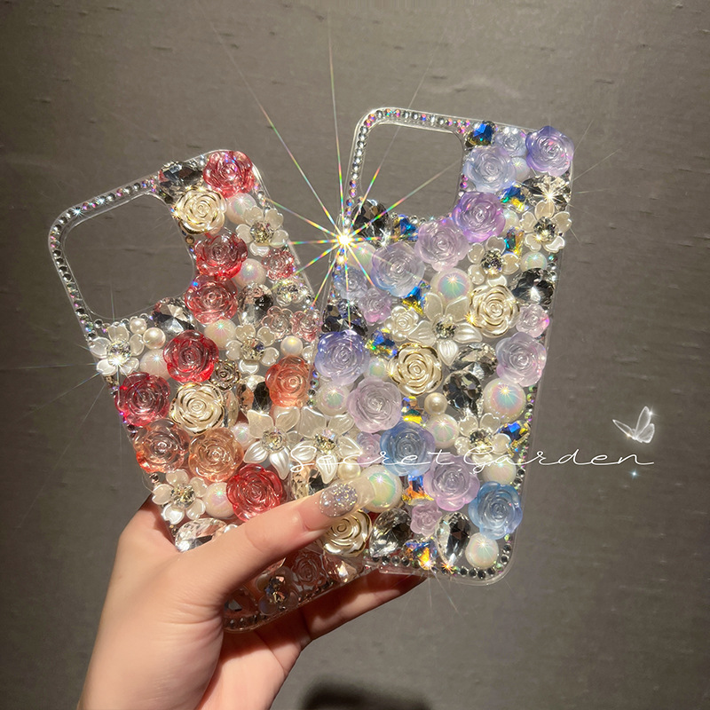 适用苹果14promax手机壳水钻玫瑰抖音同款iPhone13奢华全包保护套