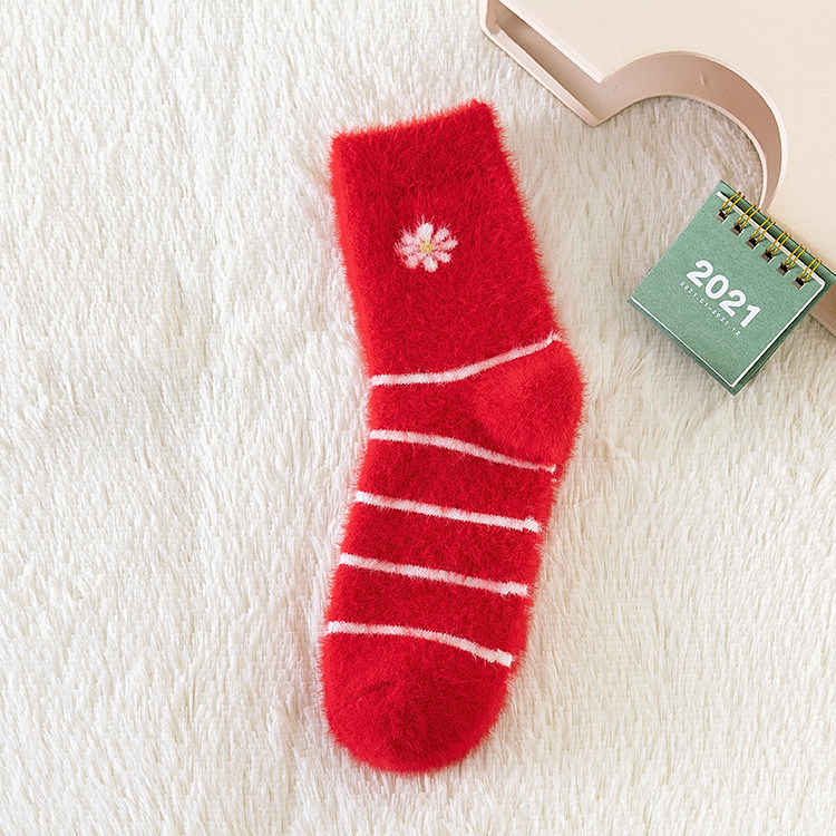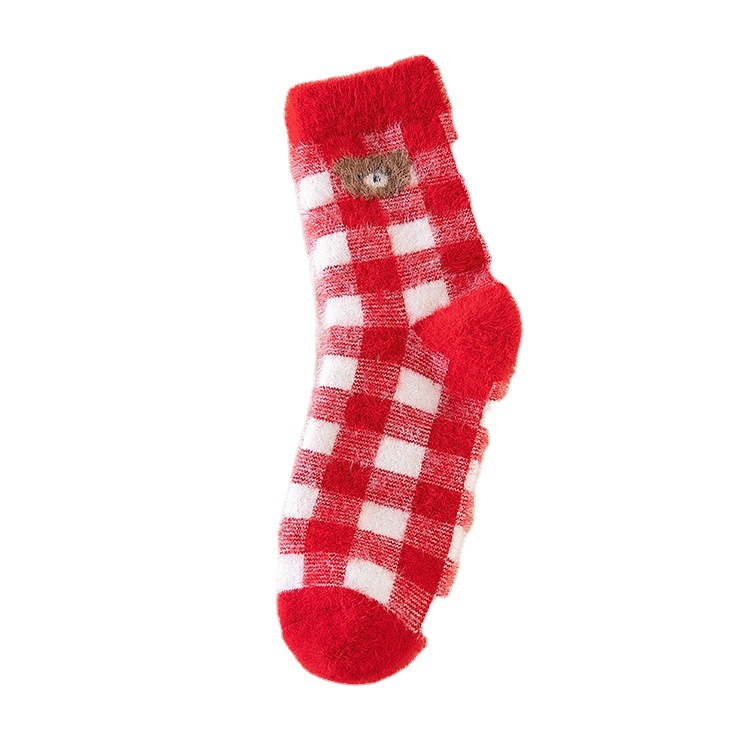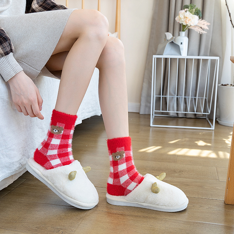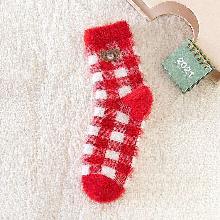 新款袜子女秋冬加厚保暖大红袜仿貂绒刺绣卡通小熊本命年红袜子