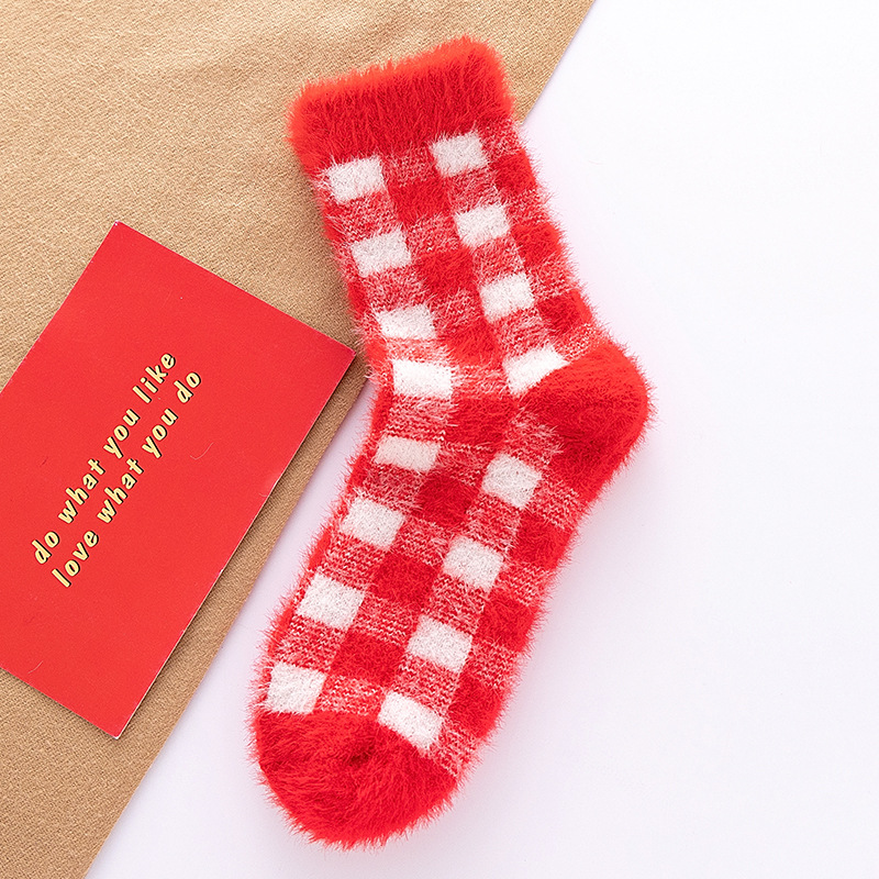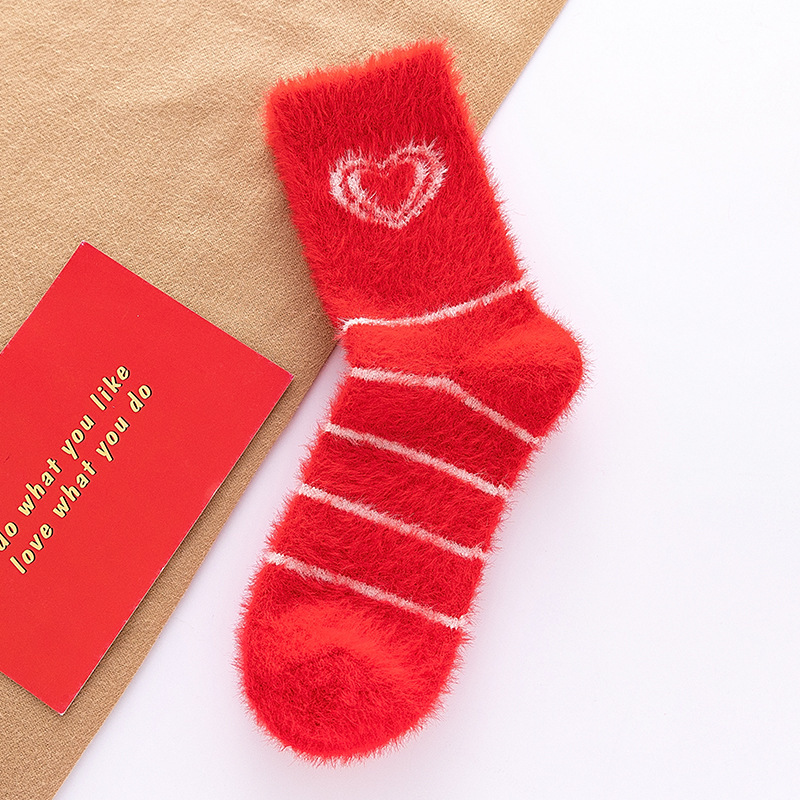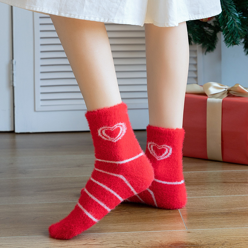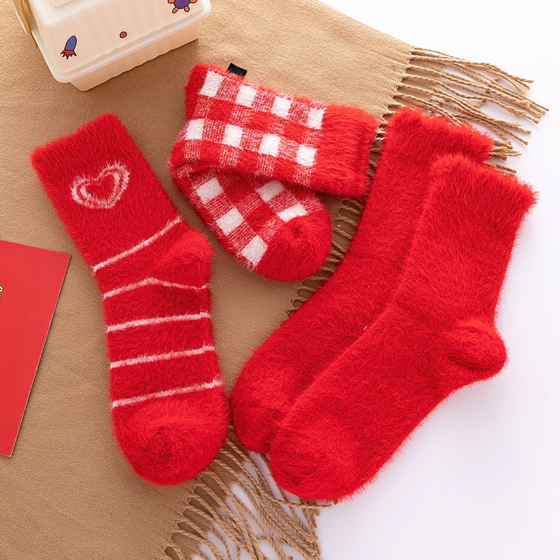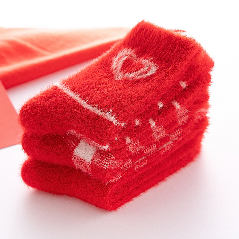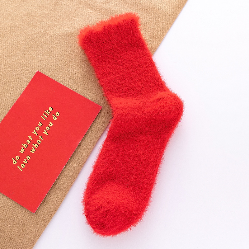 袜子女秋冬季毛绒加厚保暖水貂绒中筒袜大红色结婚新年居家睡眠袜