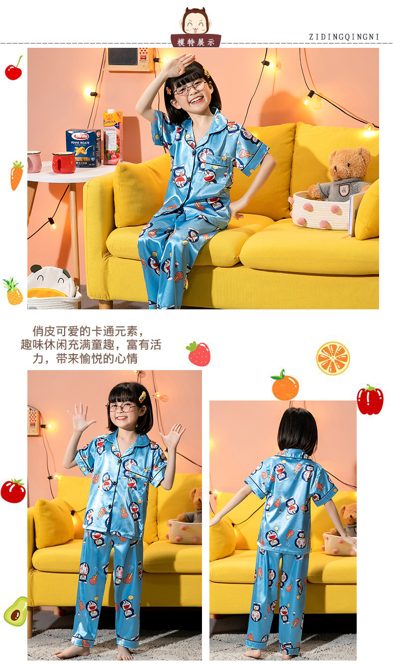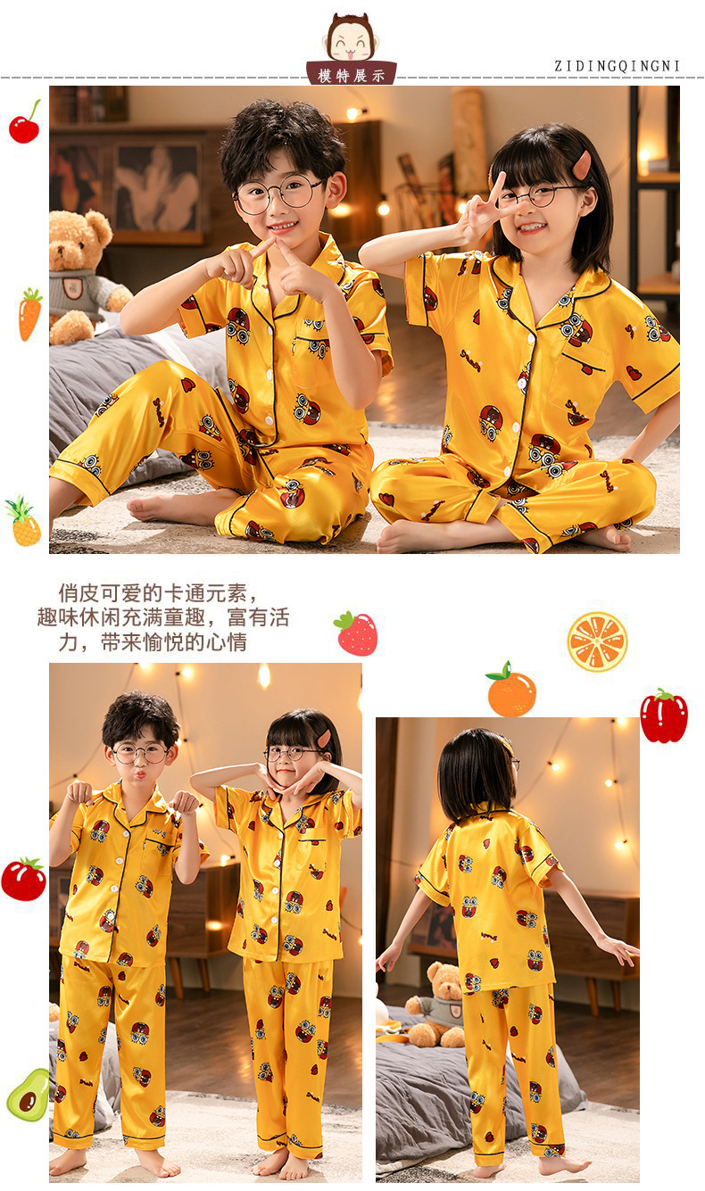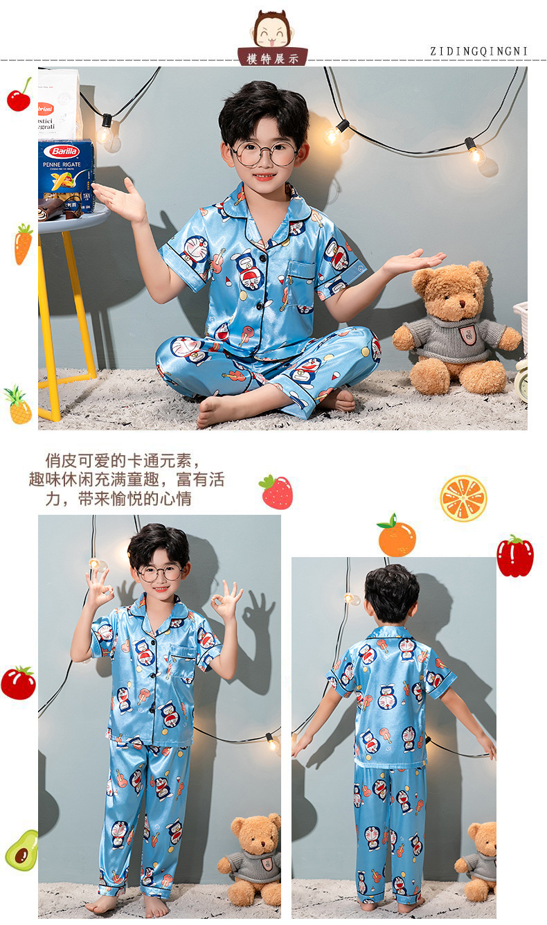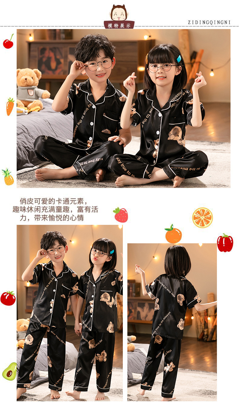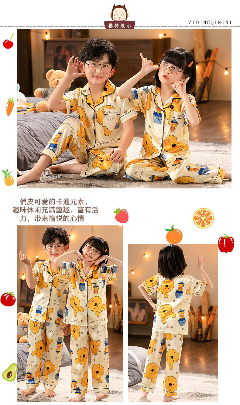 外贸夏季儿童睡衣男童女童冰丝开衫短袖长裤宽松薄款仿真丝家居服