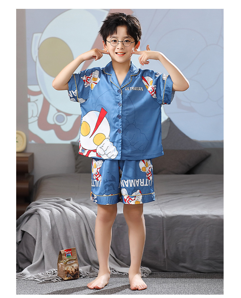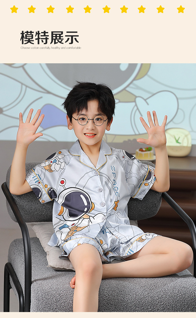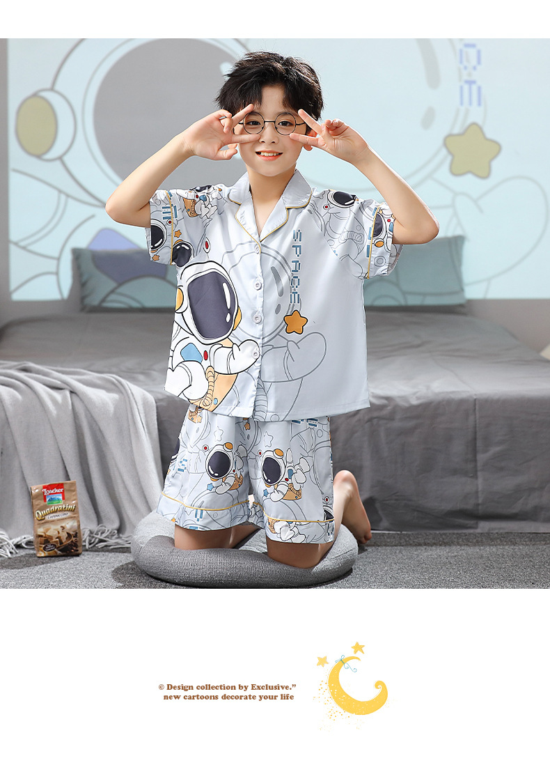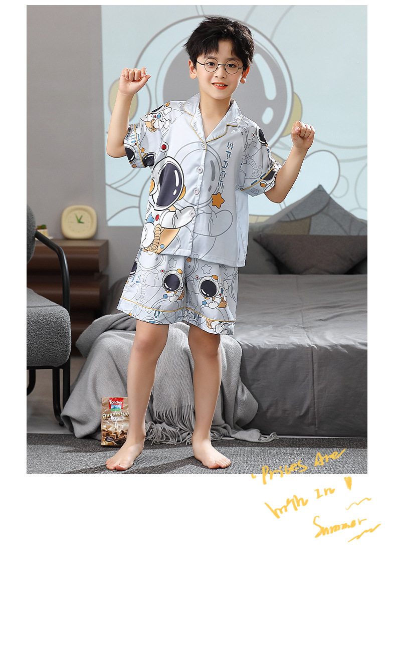 男童夏季儿童睡衣短袖翻领冰丝男孩卡通开衫夏天空调服套装家居服