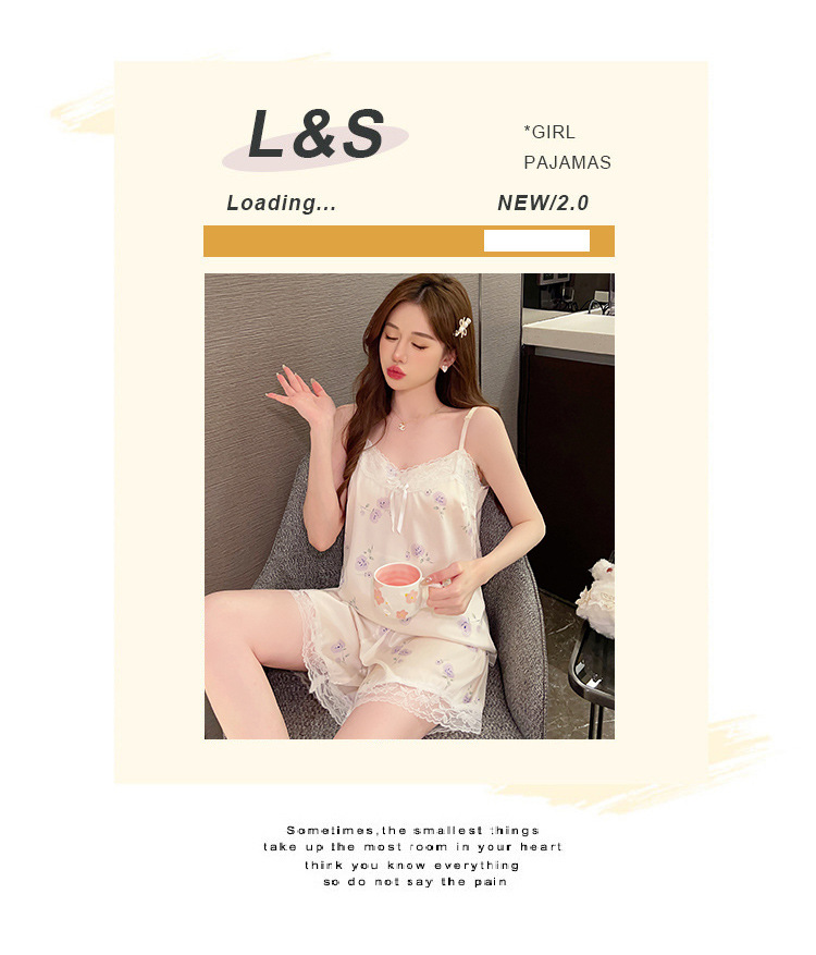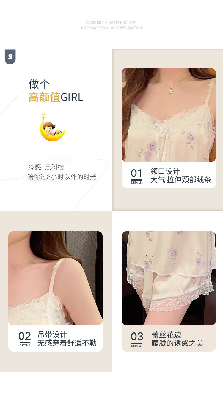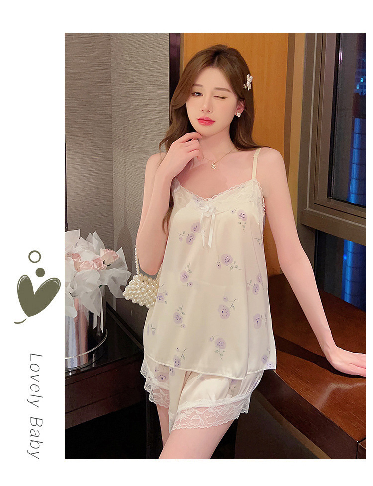 夏季新款冰丝雪睡衣女纯欲风吊带短裤蕾丝V领性感抚媚薄款家居服