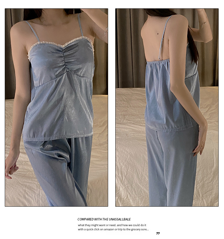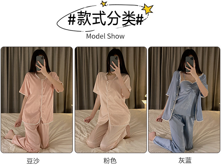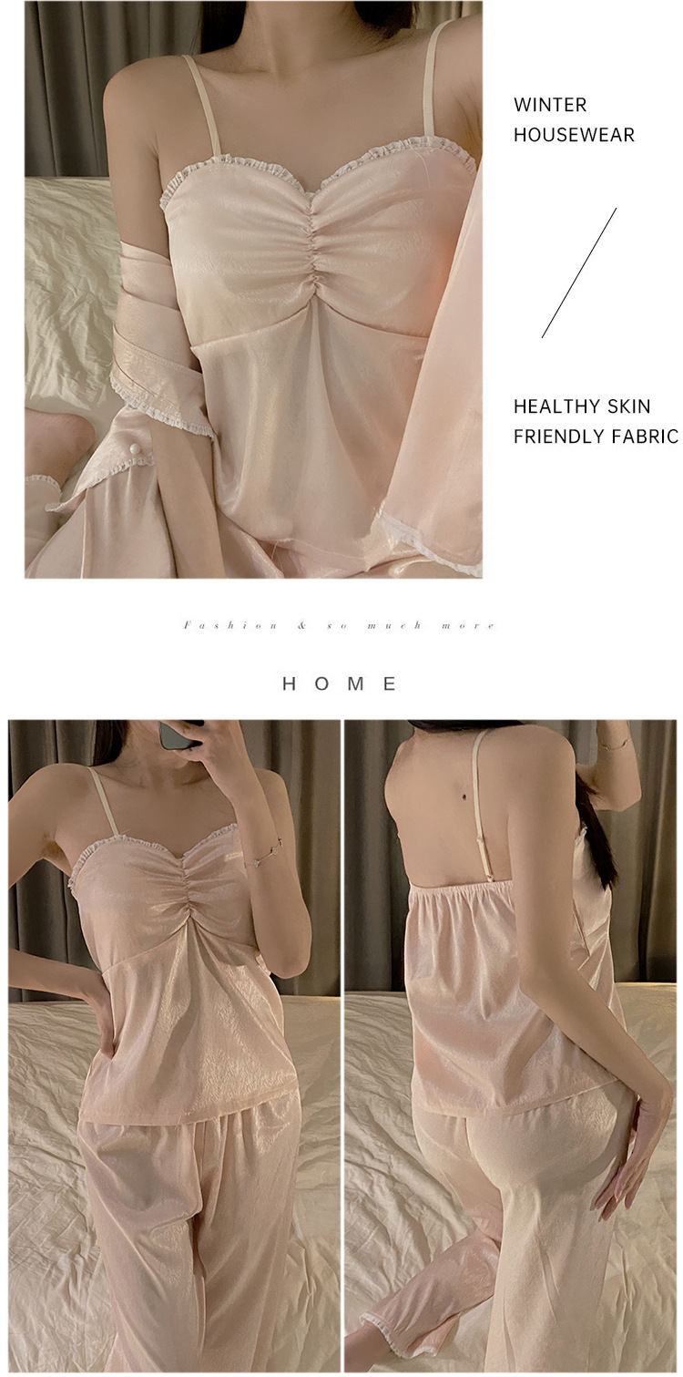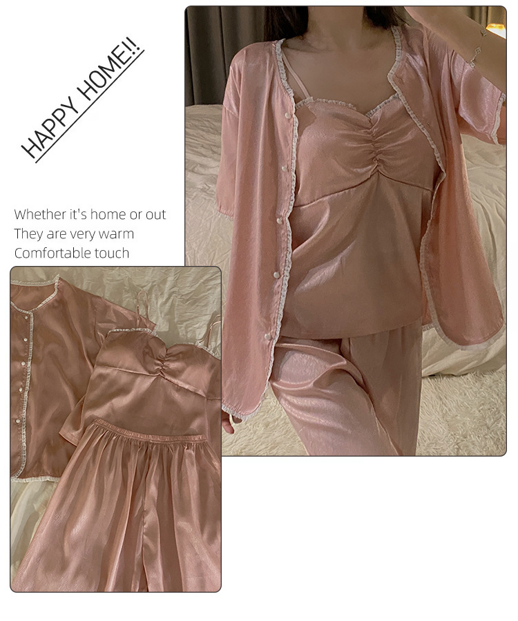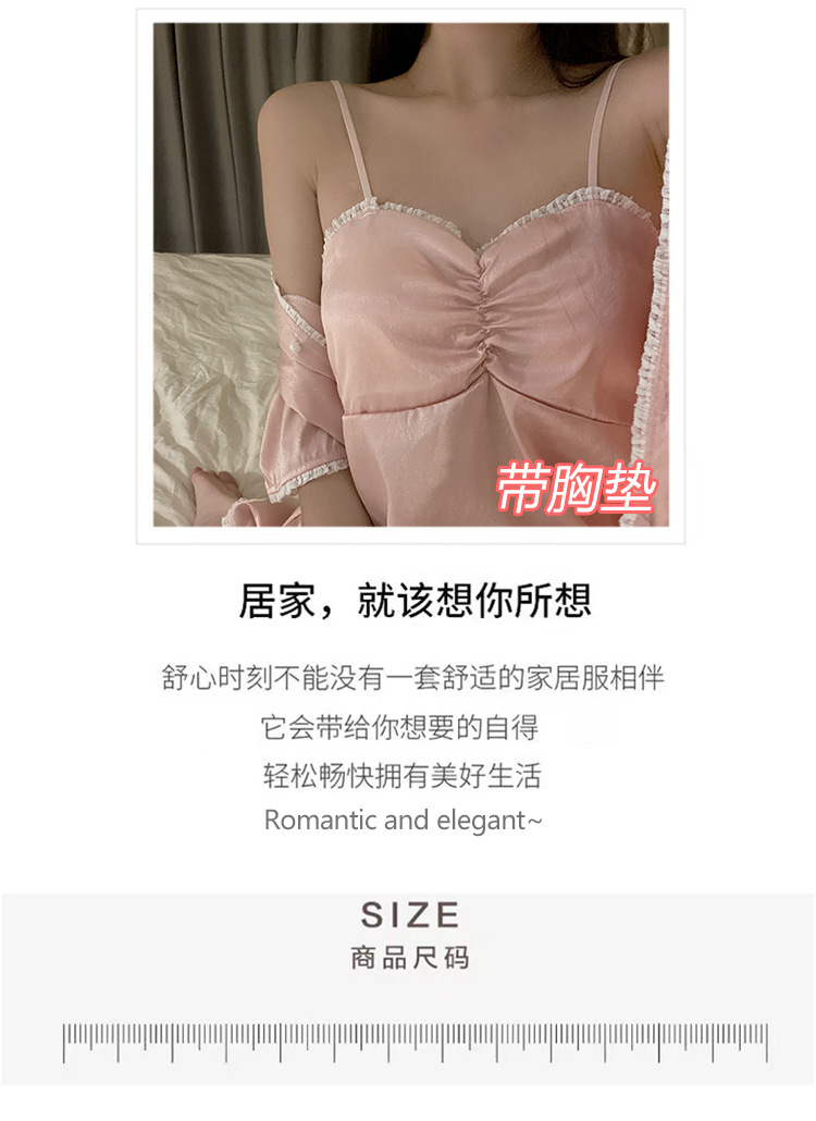 夏季新款睡衣女甜美风吊带带胸垫开衫短袖长裤三件套家居服可外穿