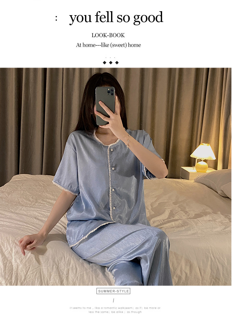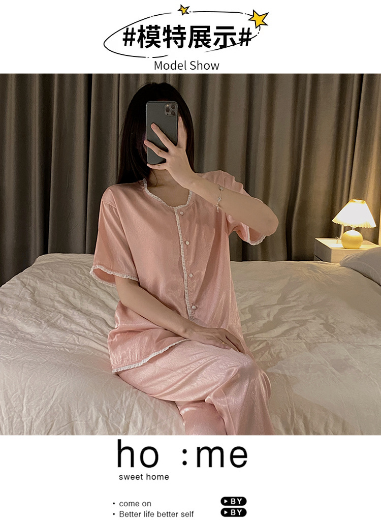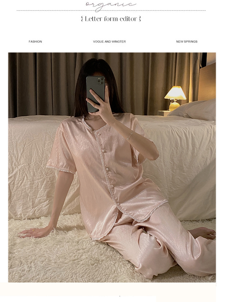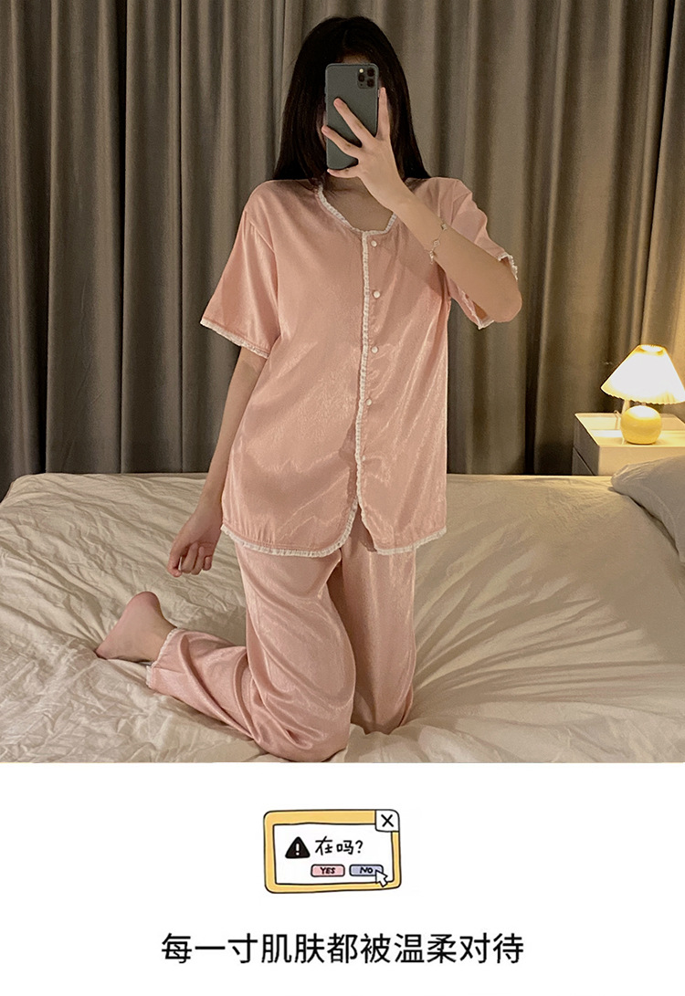 夏季新款睡衣女甜美风吊带带胸垫开衫短袖长裤三件套家居服可外穿