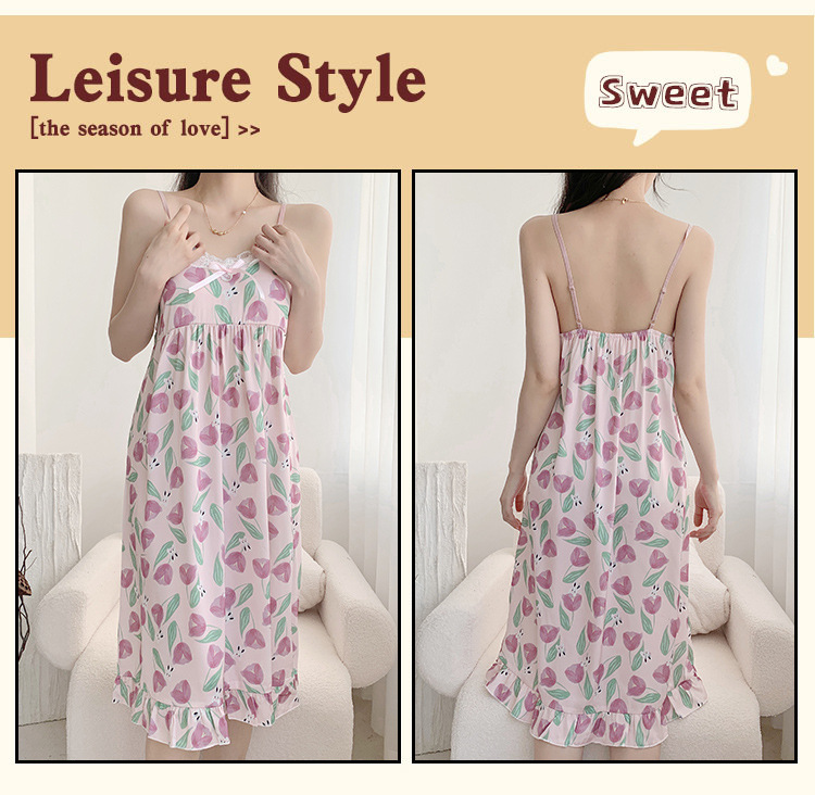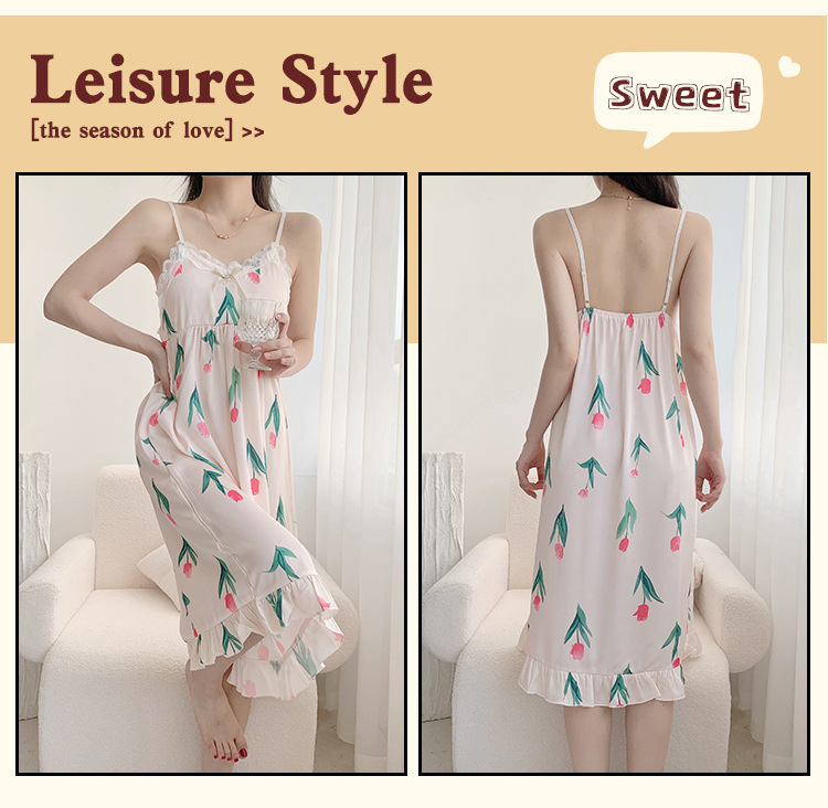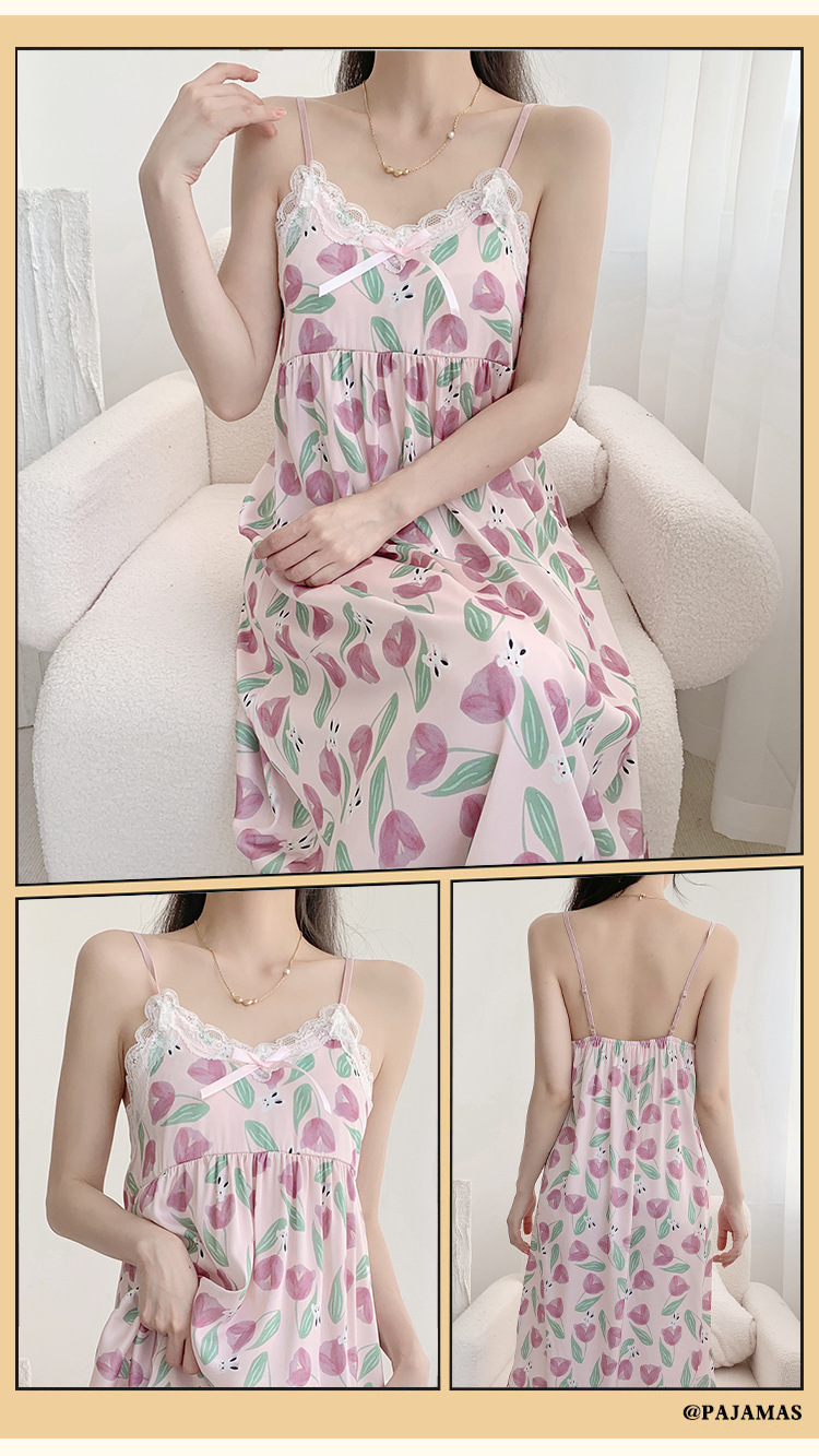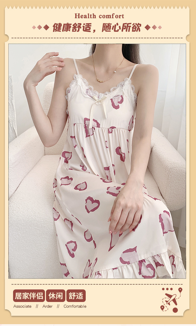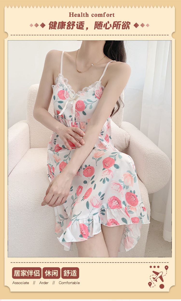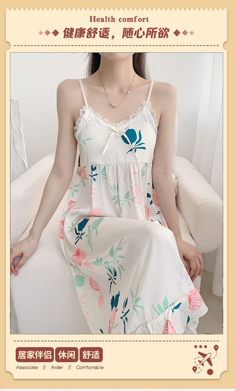 夏季新款冰丝带胸垫可拆卸吊带睡裙女薄款蕾丝性感中长睡裙家居服
