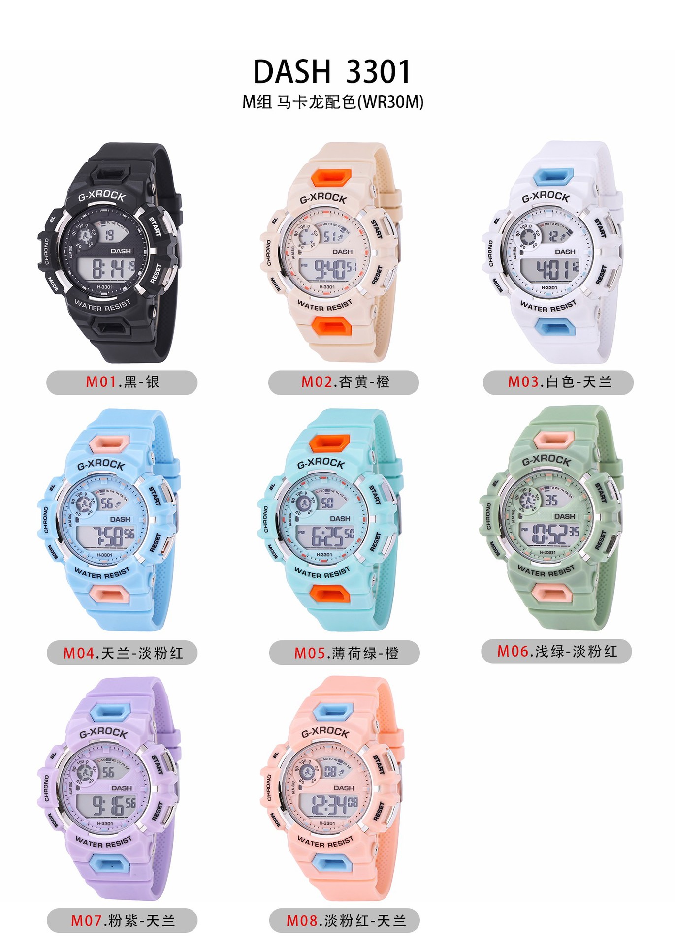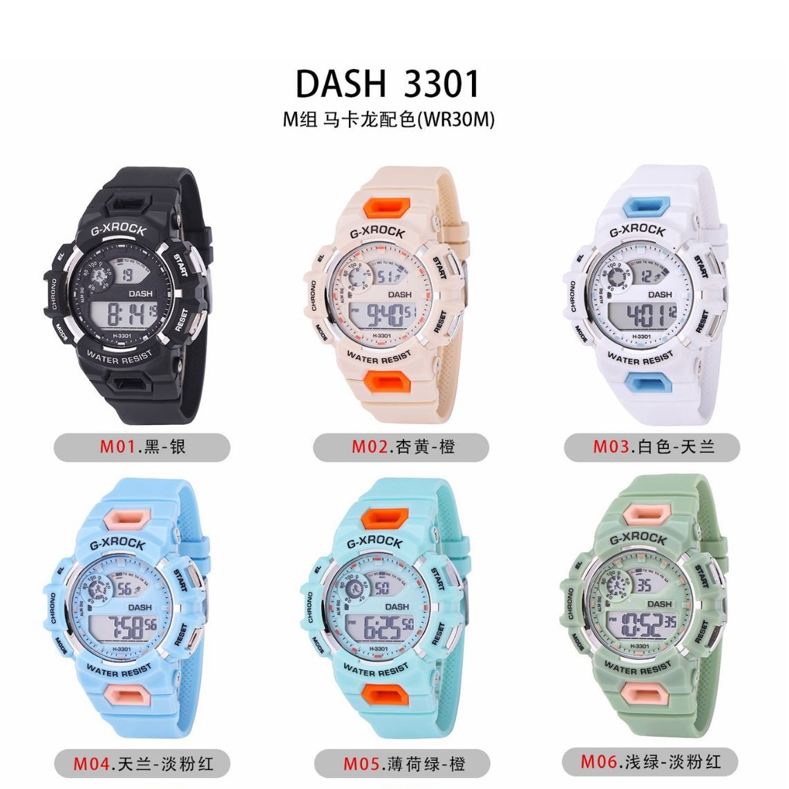 DASH 3301防水盒装电子表学生独角兽潮流运动计时手表夜光闹铃