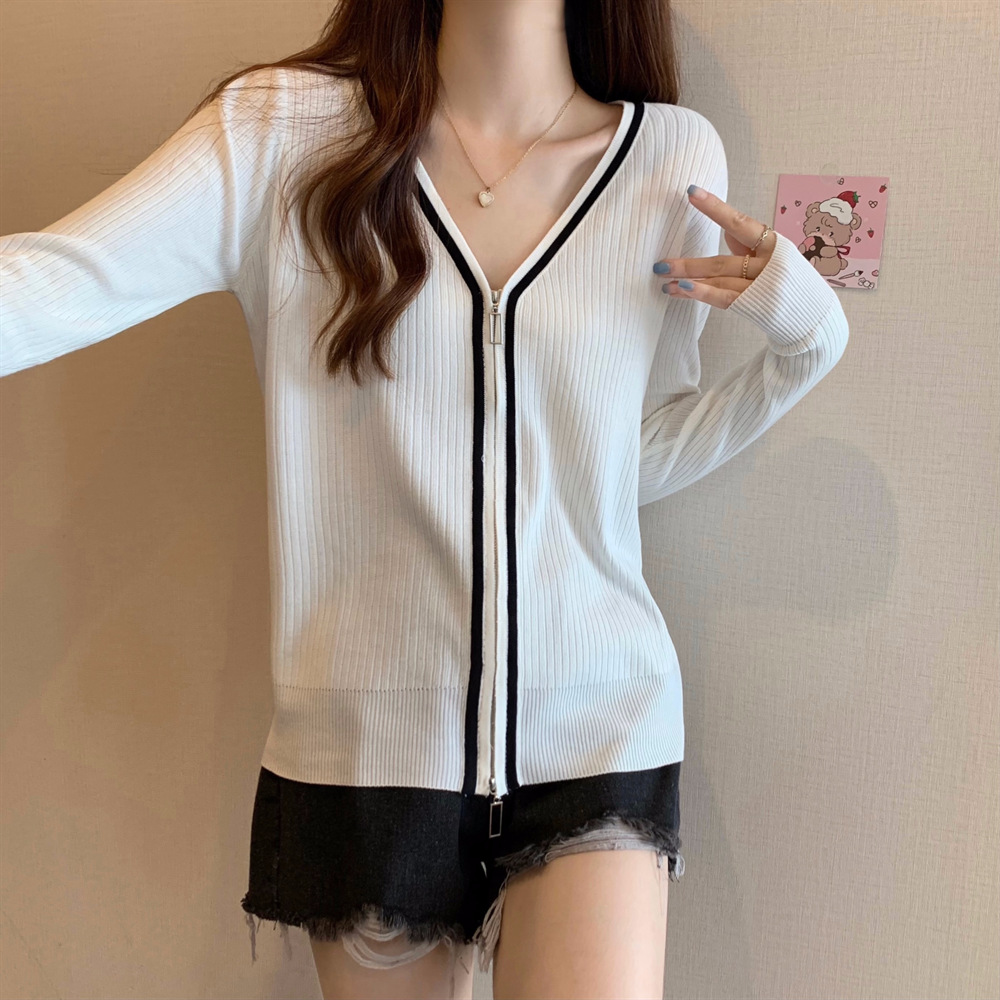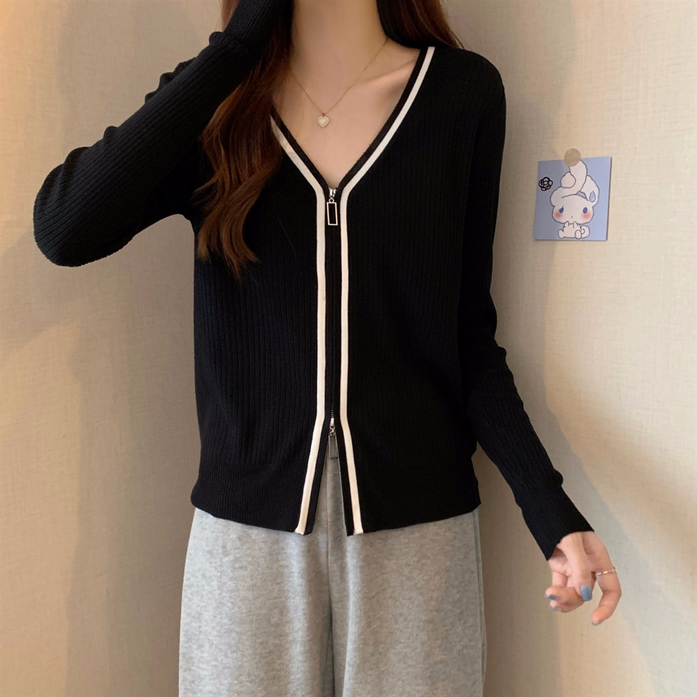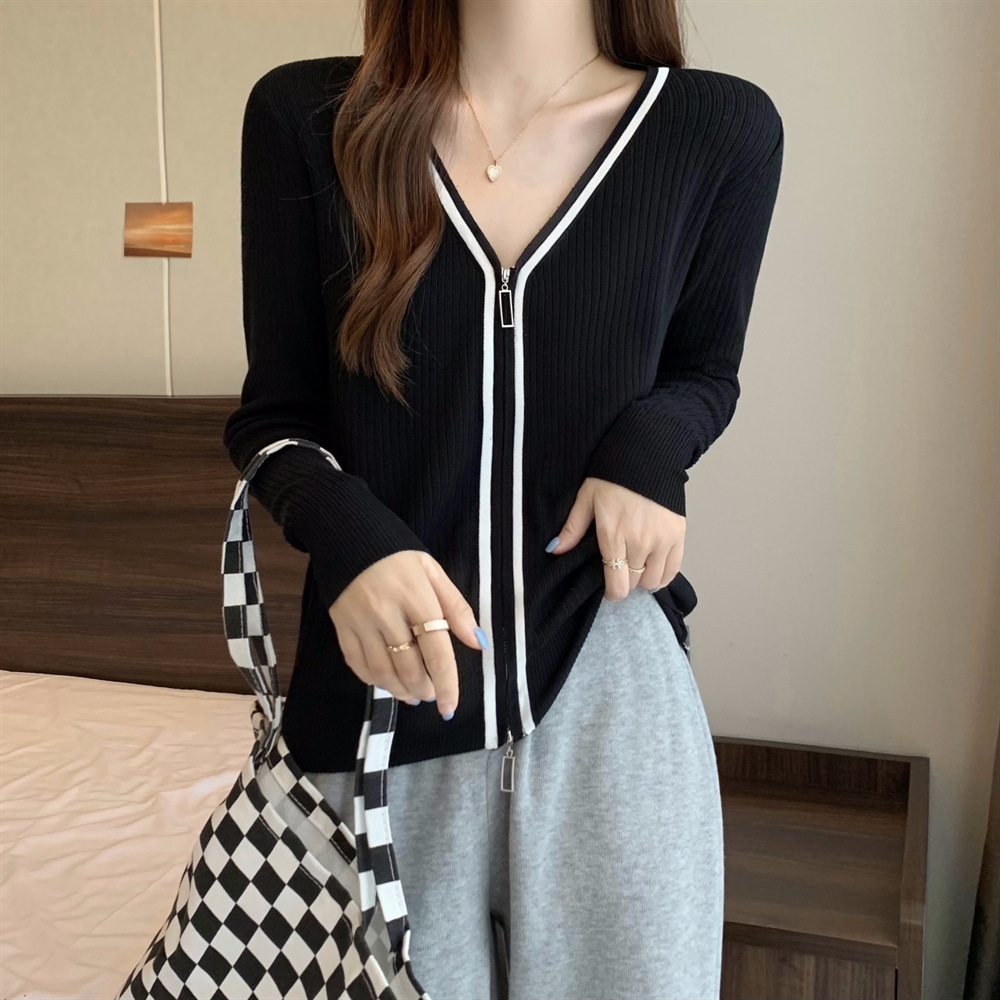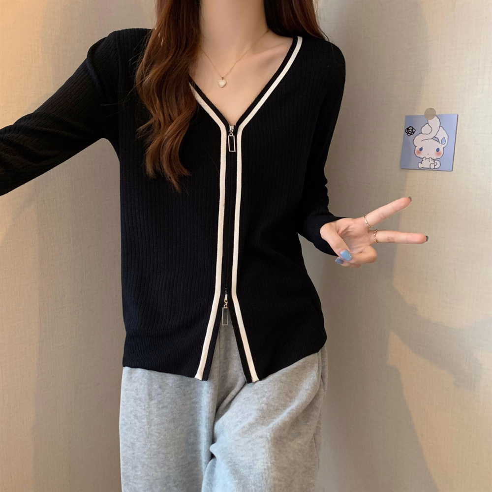 2023新款双拉链V领遮肚长袖针织开衫女春秋时尚显瘦打底洋气上衣