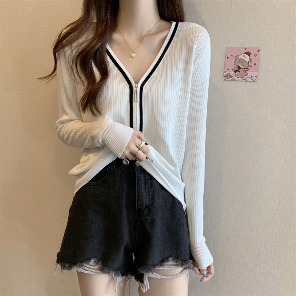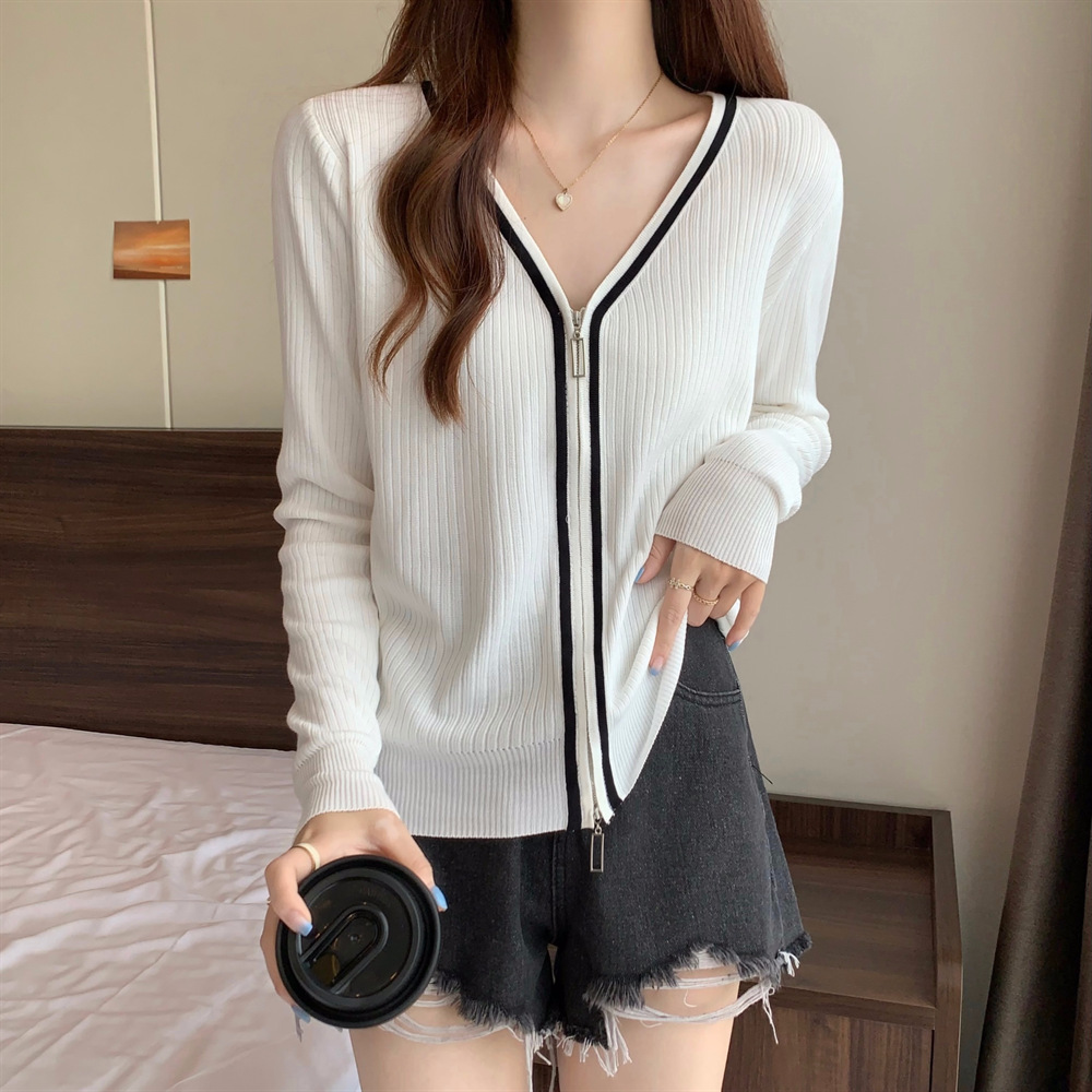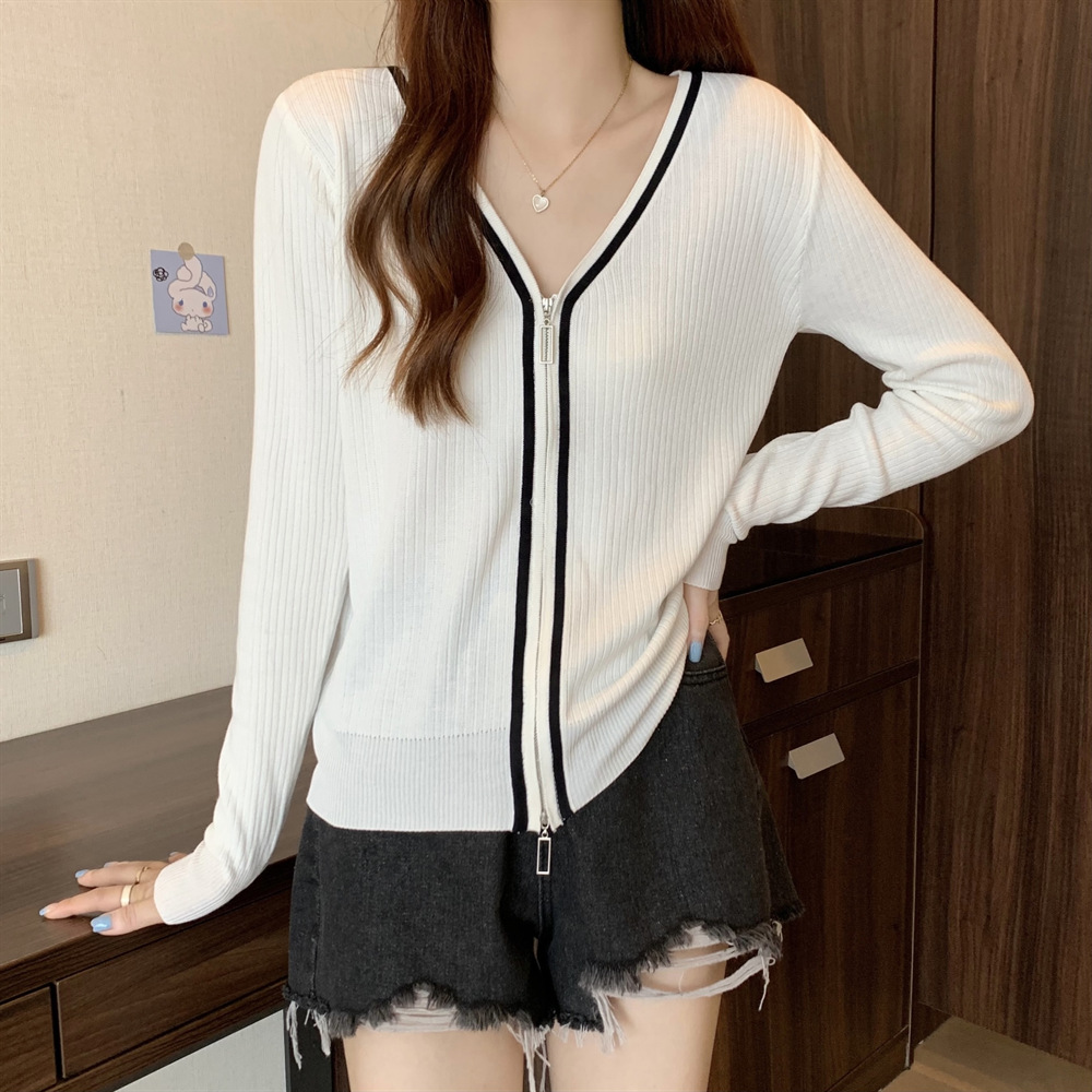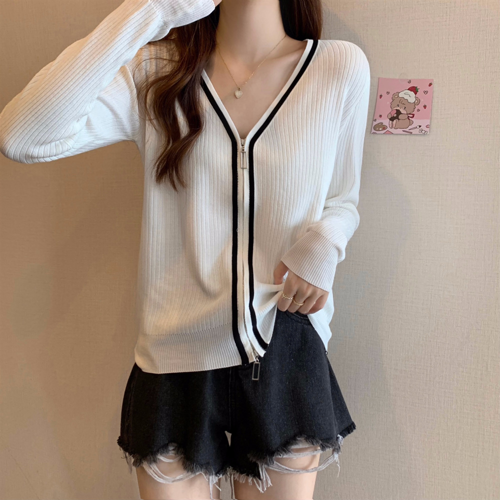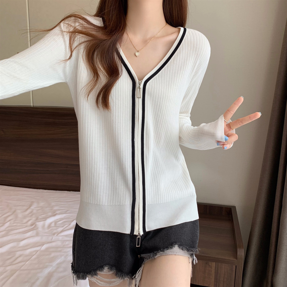 2023新款双拉链V领遮肚长袖针织开衫女春秋时尚显瘦打底洋气上衣