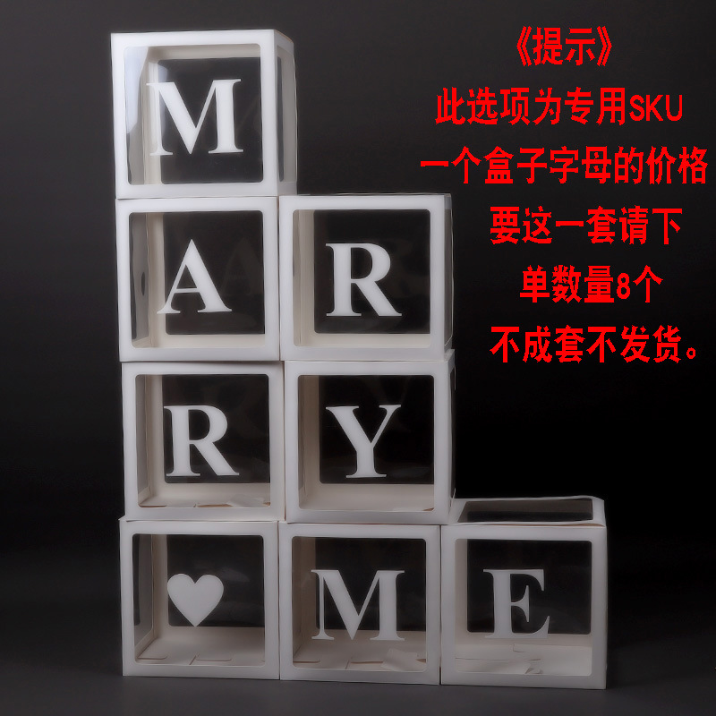 提示:气球字母盒子可组成为BABY和LOVE,MARRY ME 等下单的都是单个字母单个数量的价格,需要组成一套4个盒子,或者7个盒子(LOVE YOU),需要下单对应的字母盒子和数量搭配!