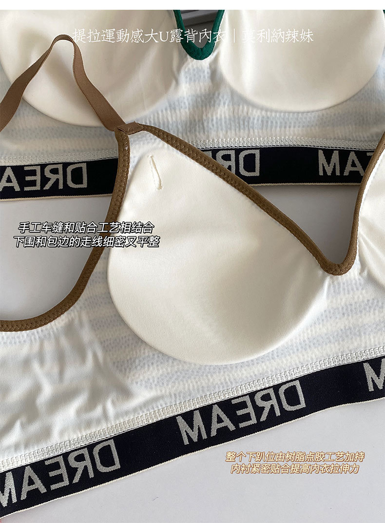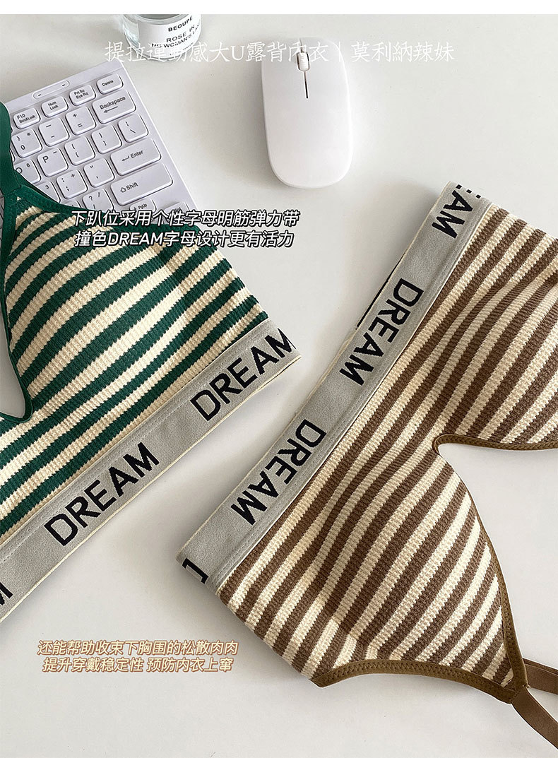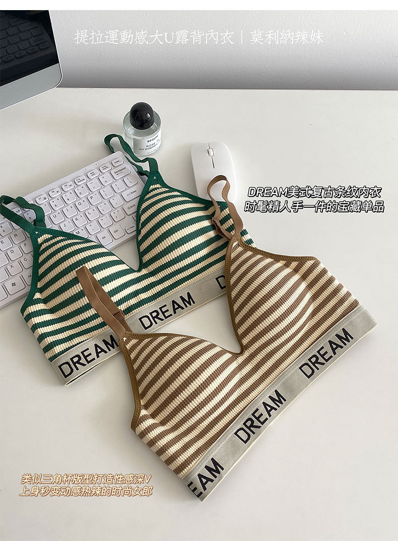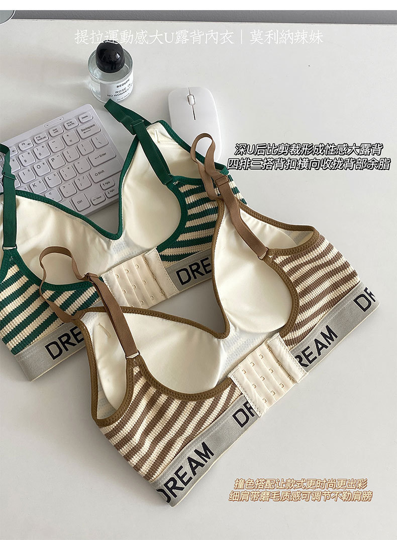 时尚复古条纹内衣女性感辣妹无钢圈大胸显小舒适运动大U露背文胸