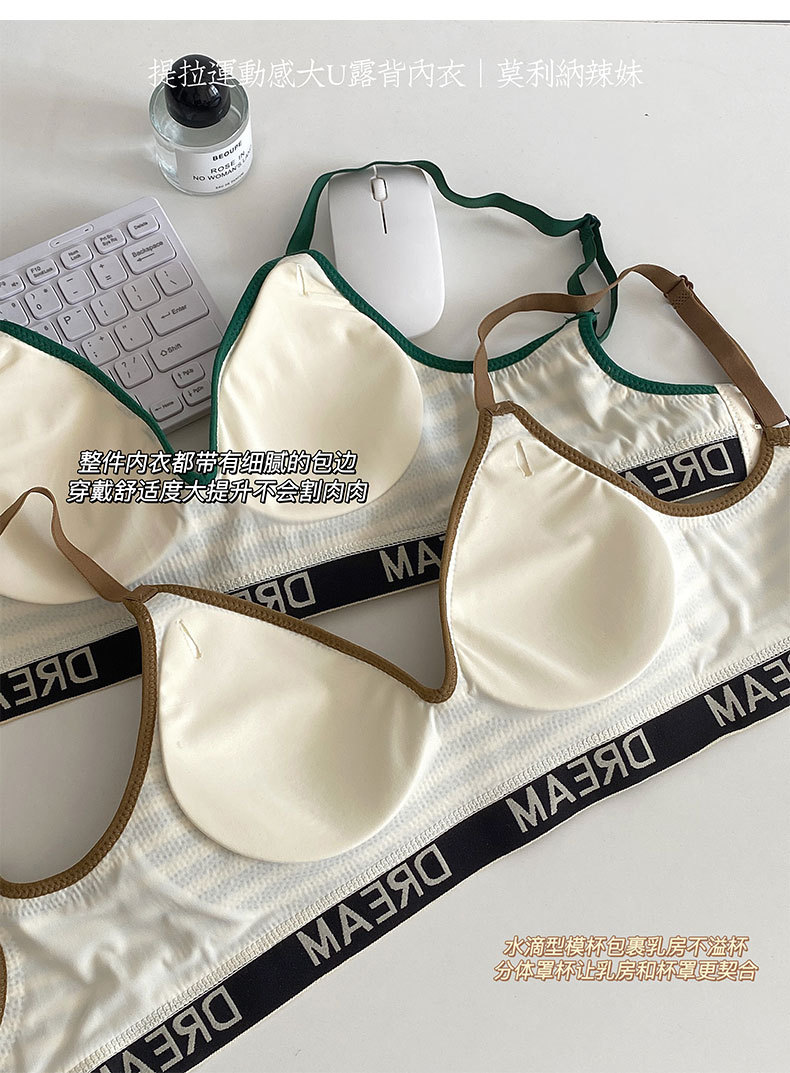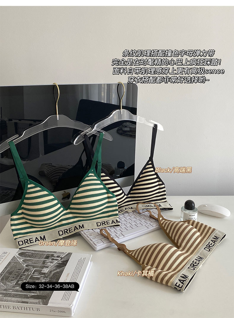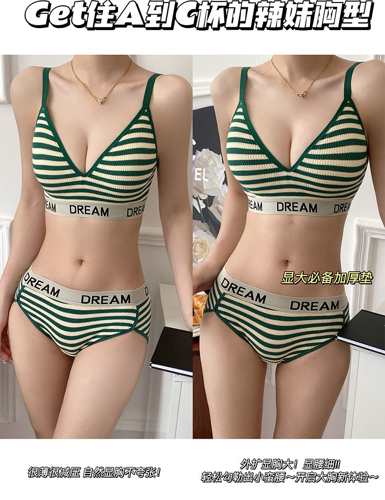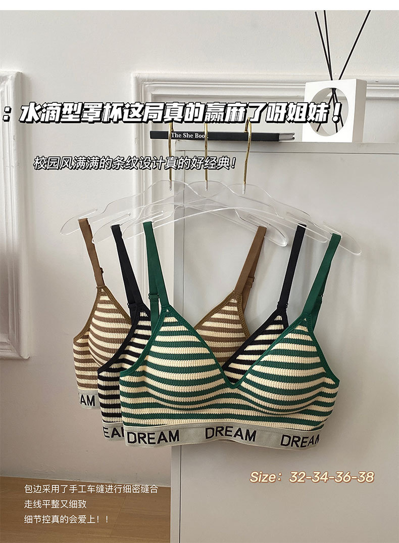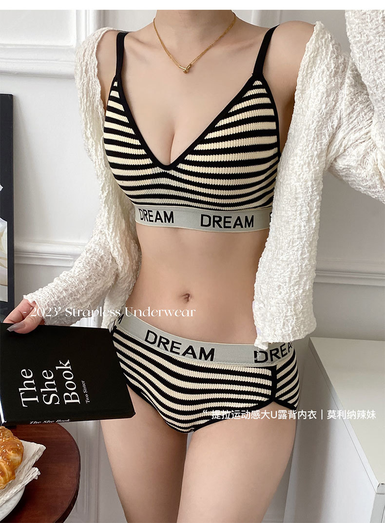 时尚复古条纹内衣女性感辣妹无钢圈大胸显小舒适运动大U露背文胸