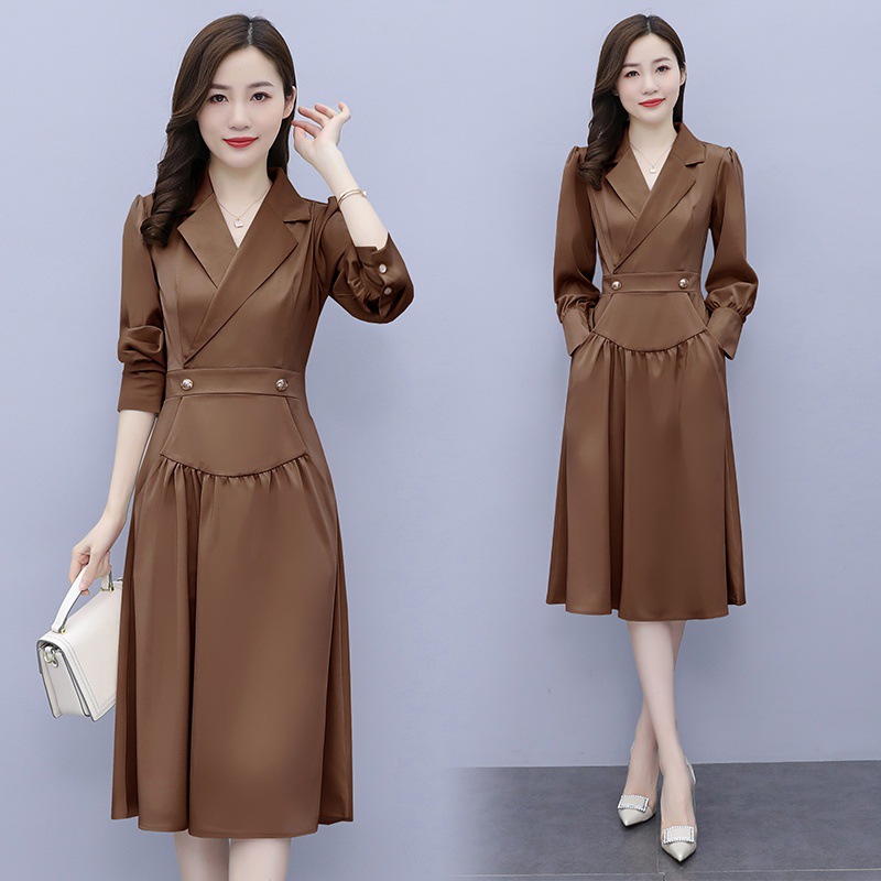 实拍2023春秋新醋酸缎面个性西装领显瘦高端连衣裙女士大码中长裙