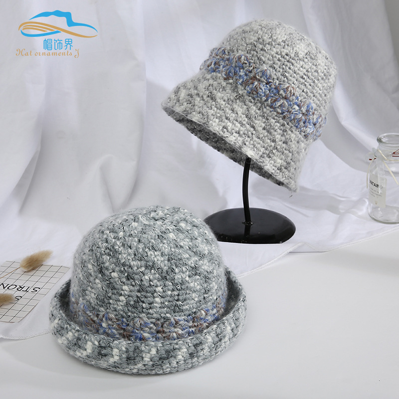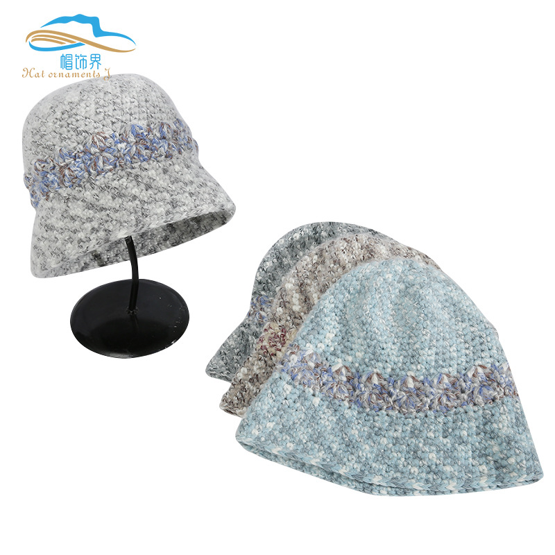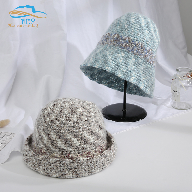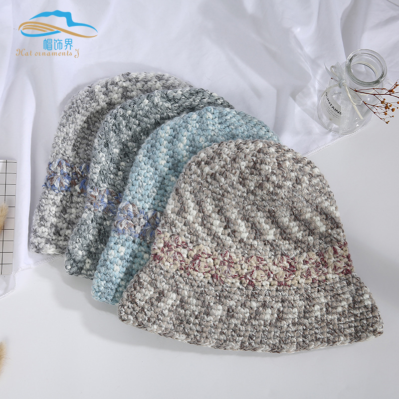 设计师款重工手工编织彩线盆帽 棉质韩版宽檐缎档女士针织帽