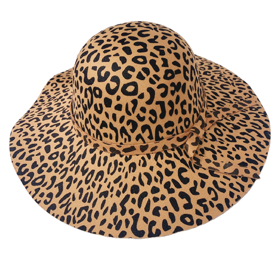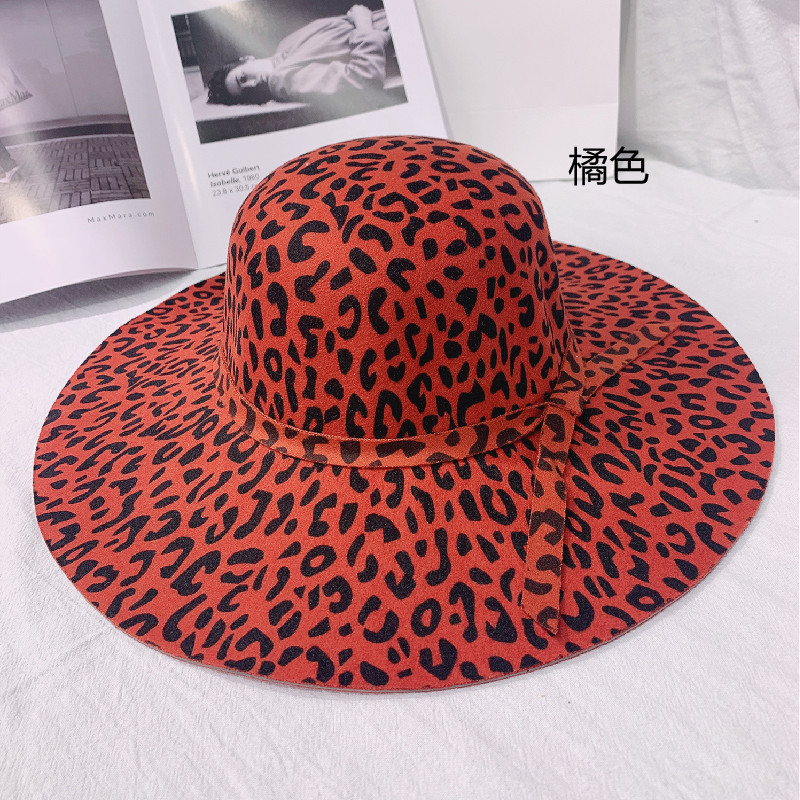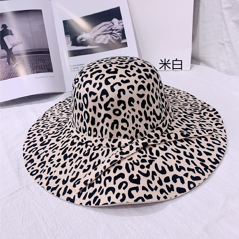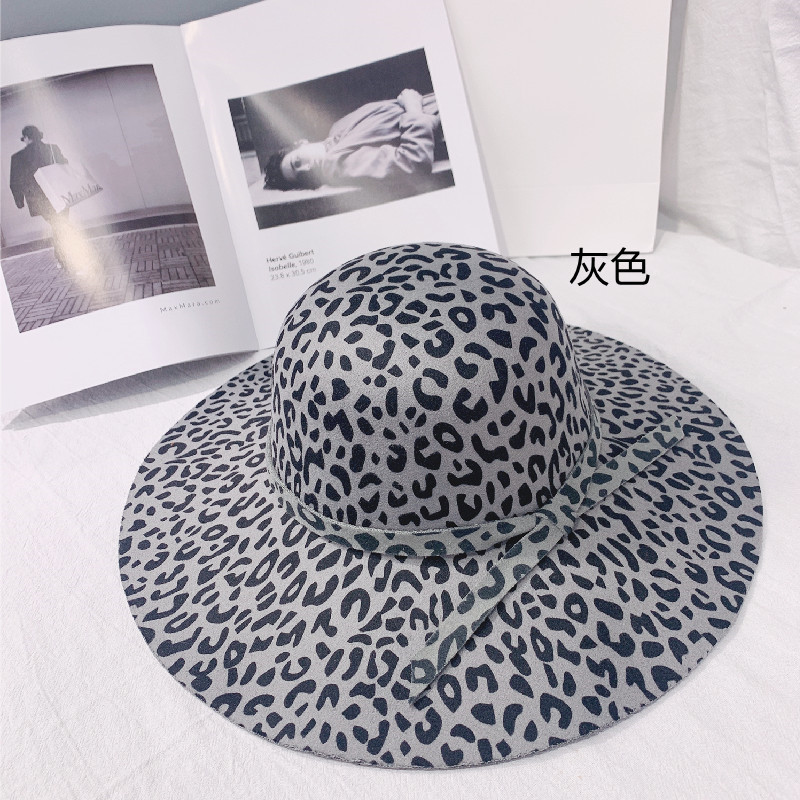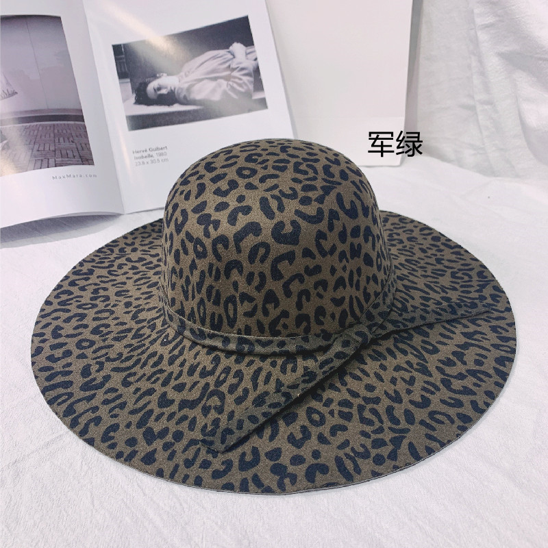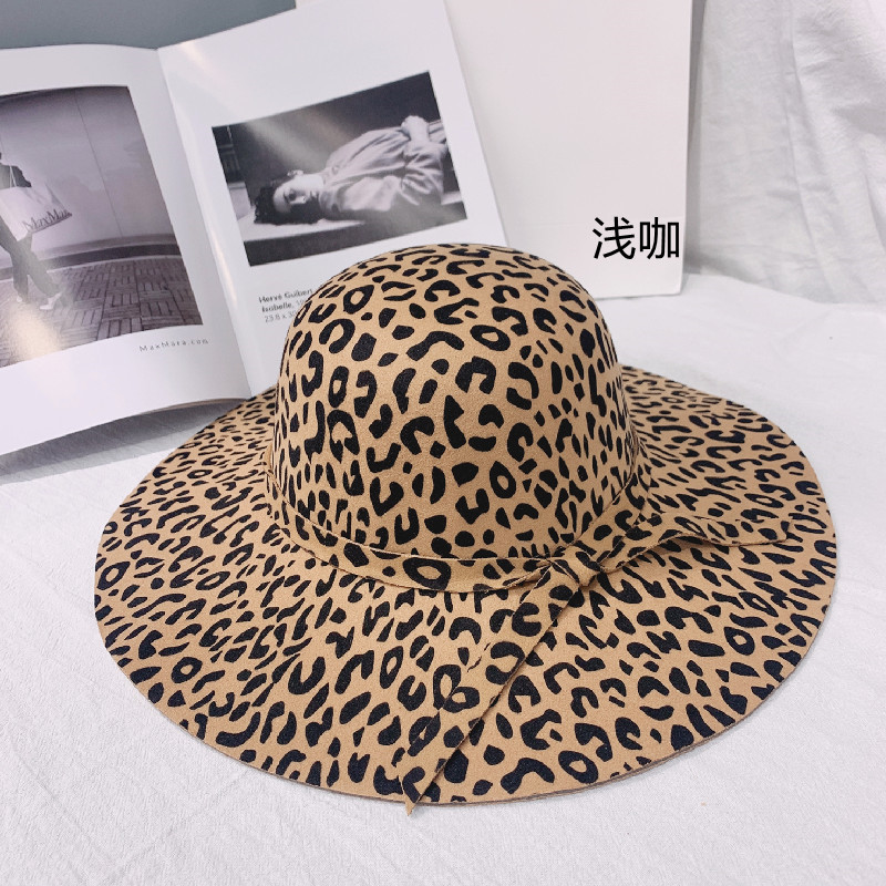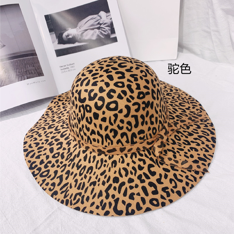 秋冬季英伦风女士新款大檐帽子韩版时尚豹纹毛呢礼帽豹纹大边帽