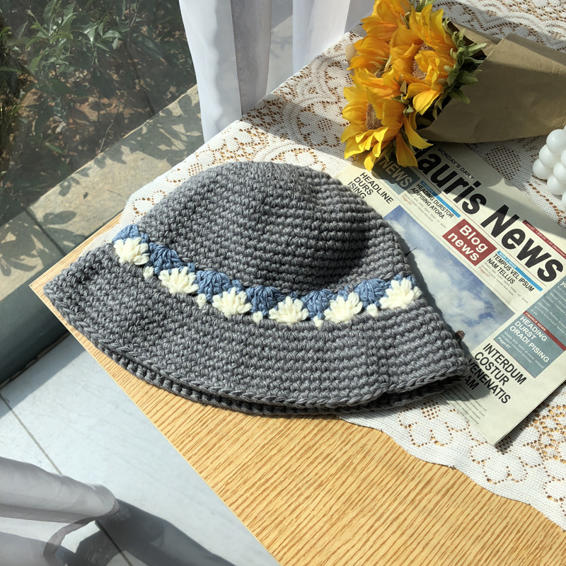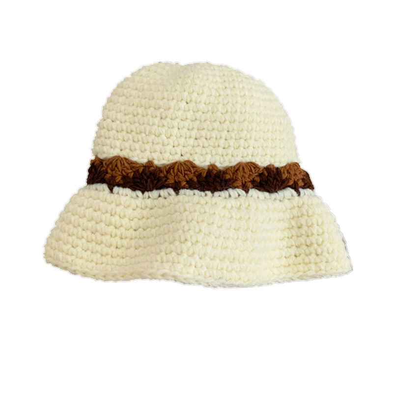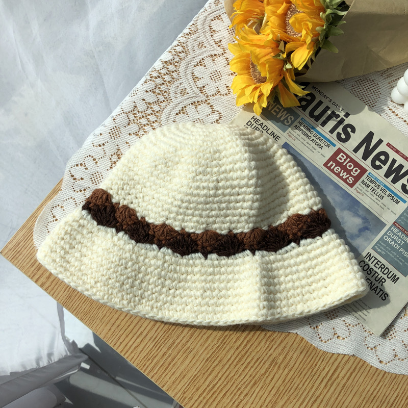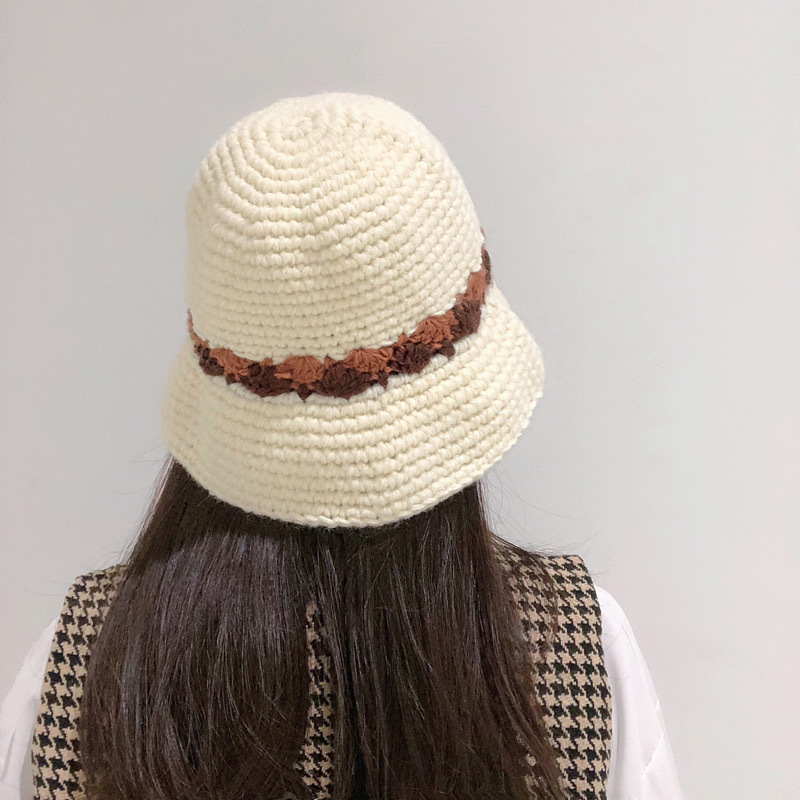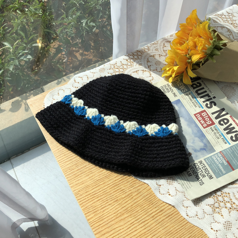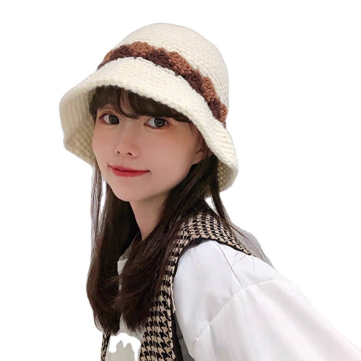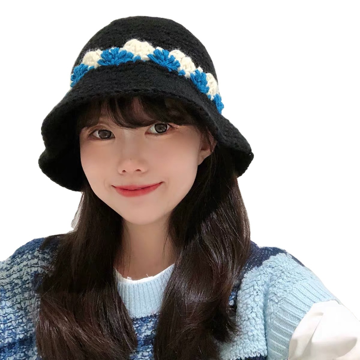 冬季保暖针织帽网红毛线渔夫帽撞色钩花显脸小潮搭盆帽日系水桶帽