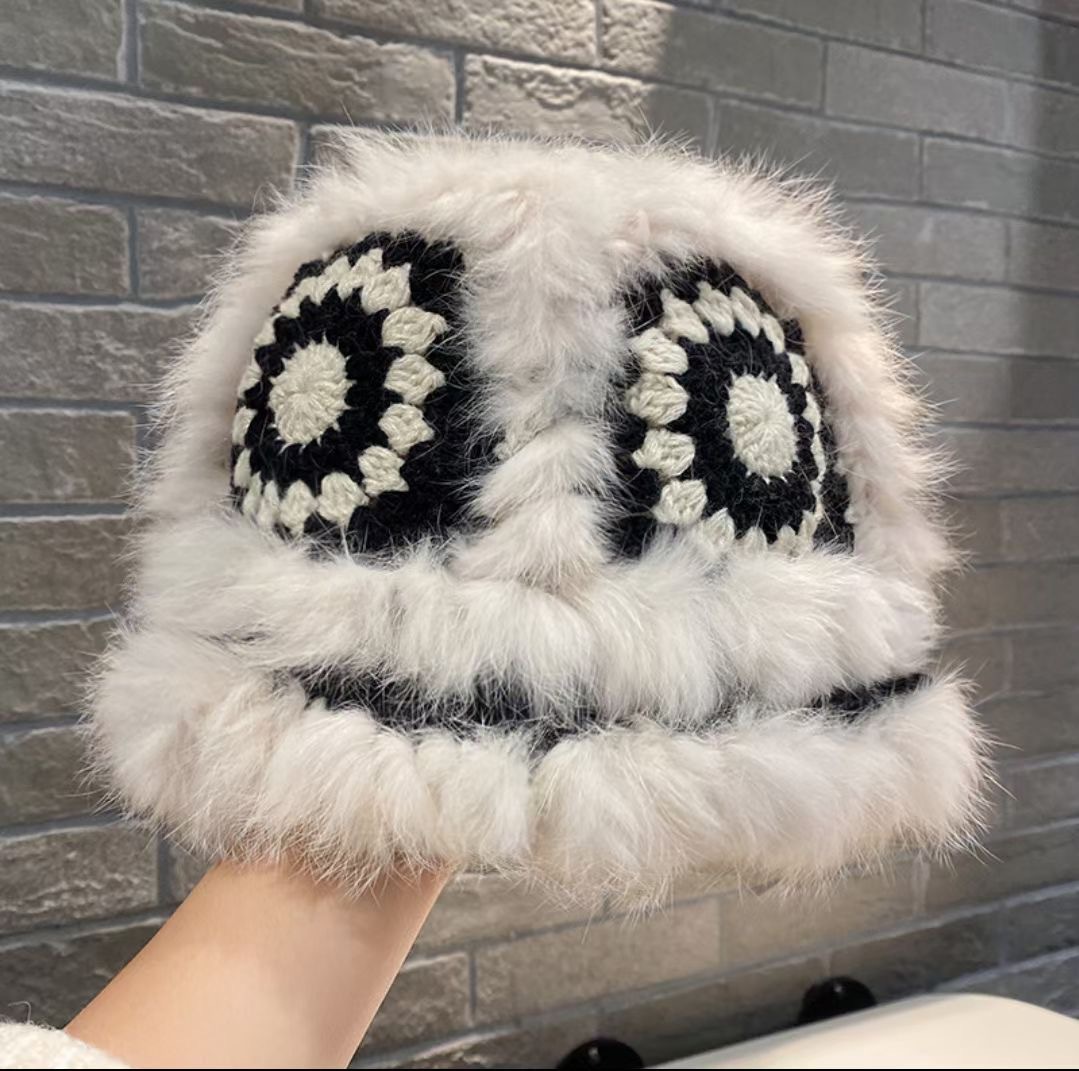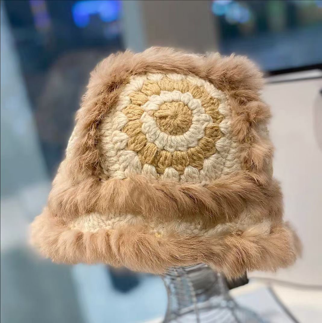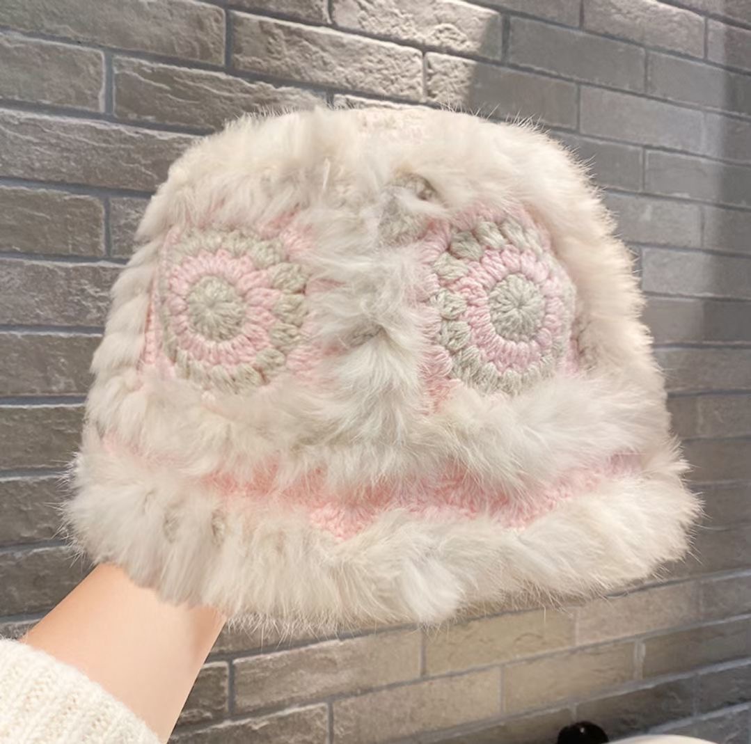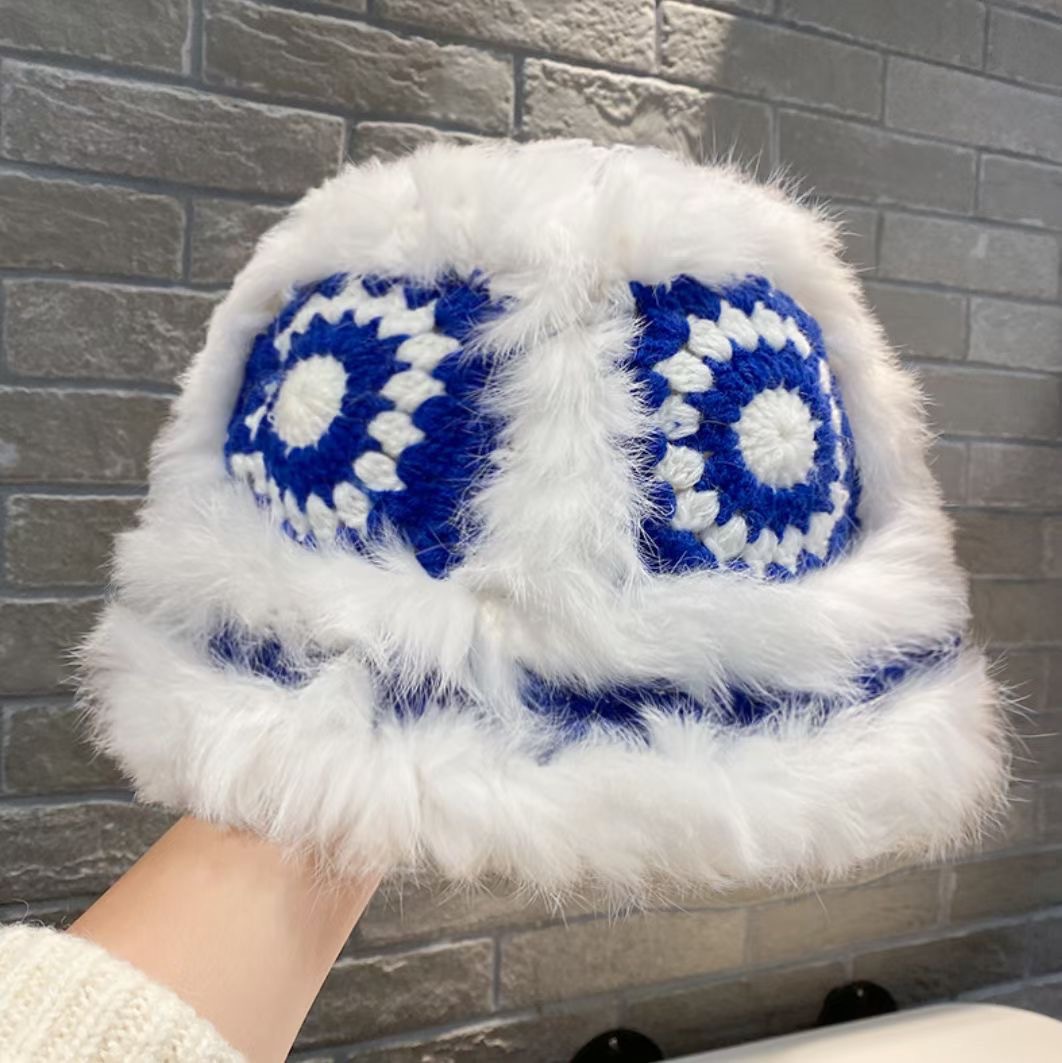 秋冬镂空醒狮手工钩花兔毛皮草针织毛线帽子女韩版镂空花朵渔夫帽