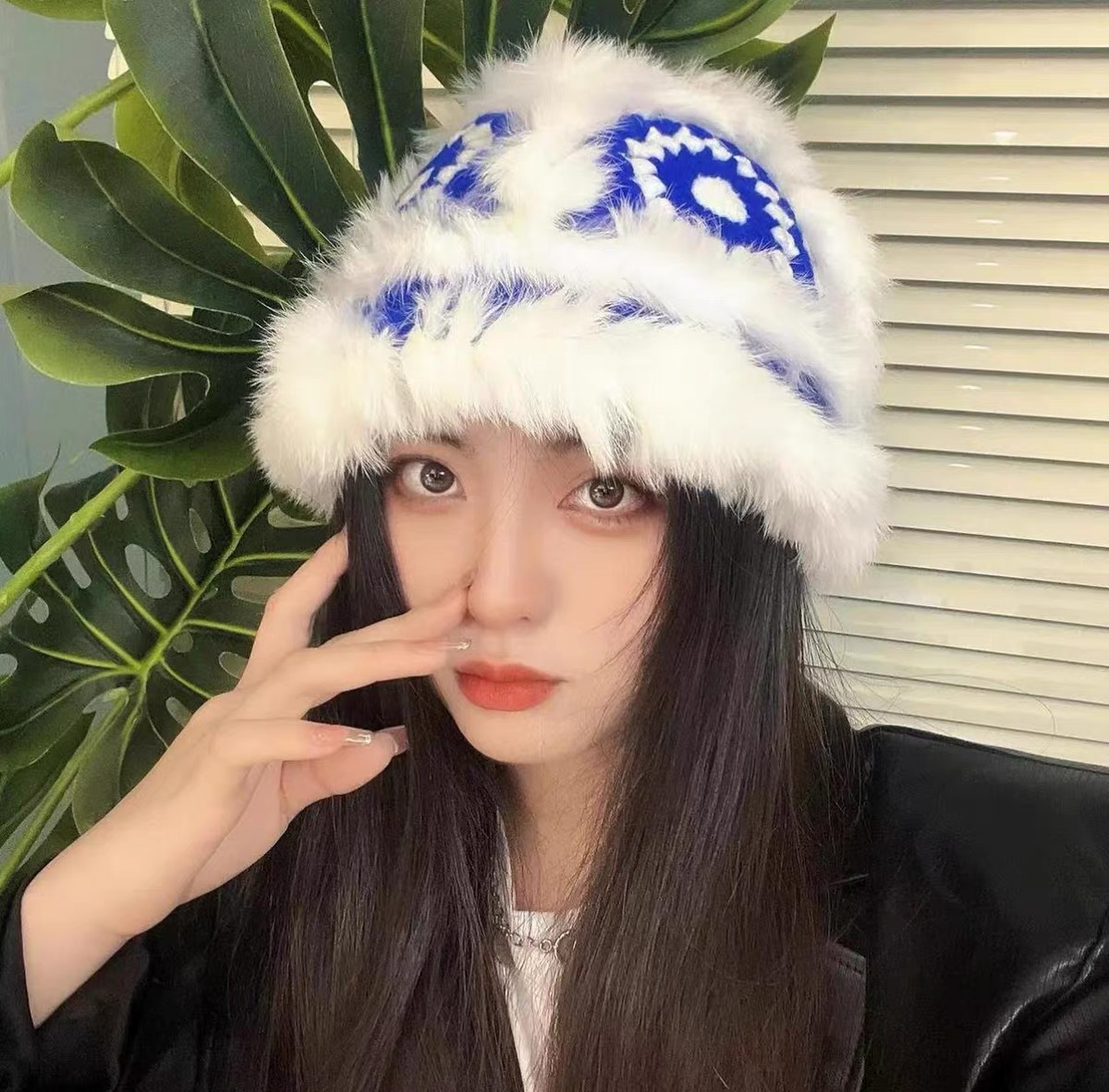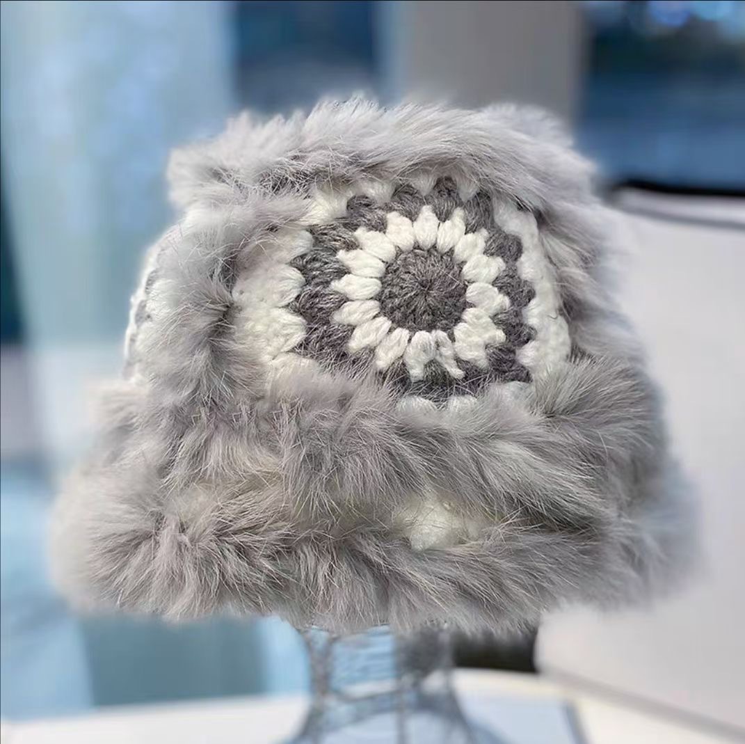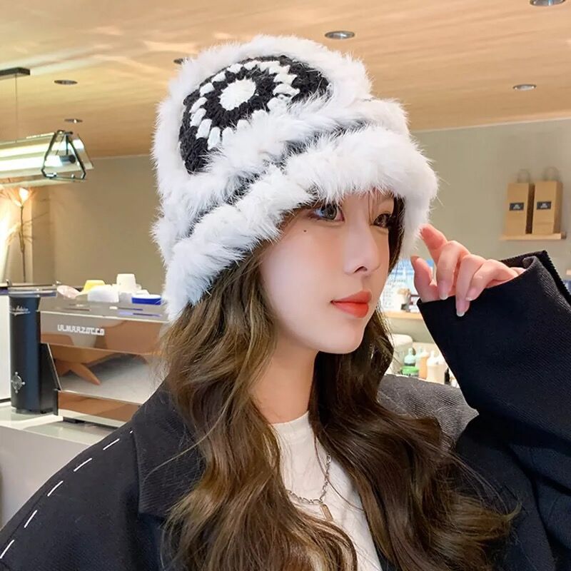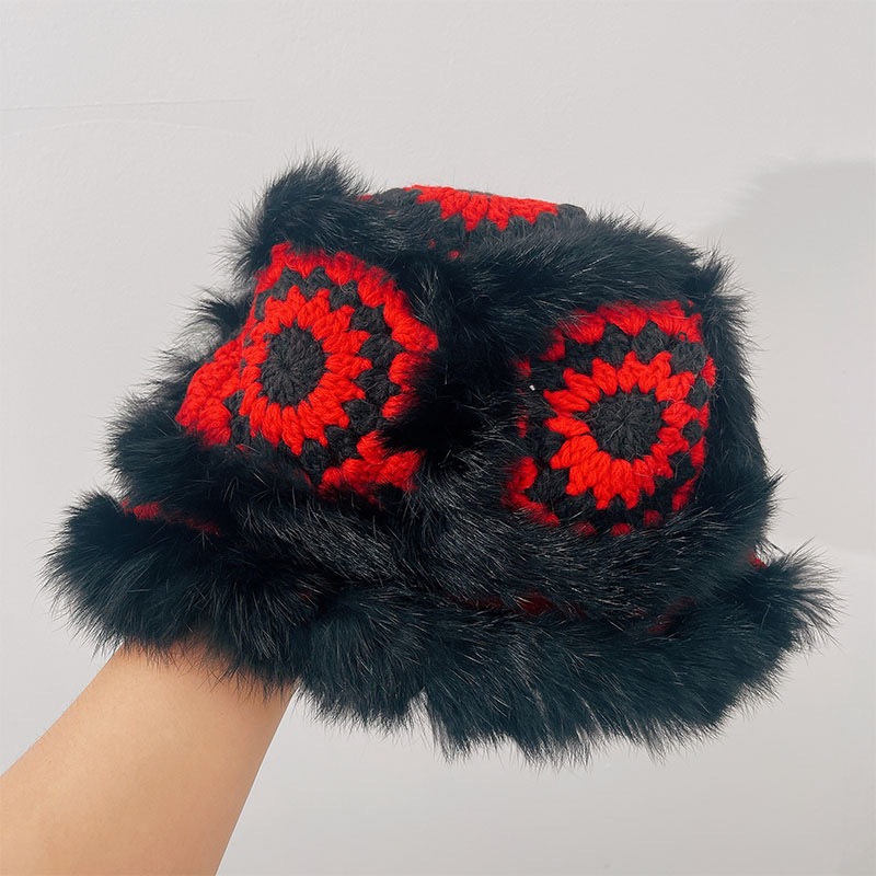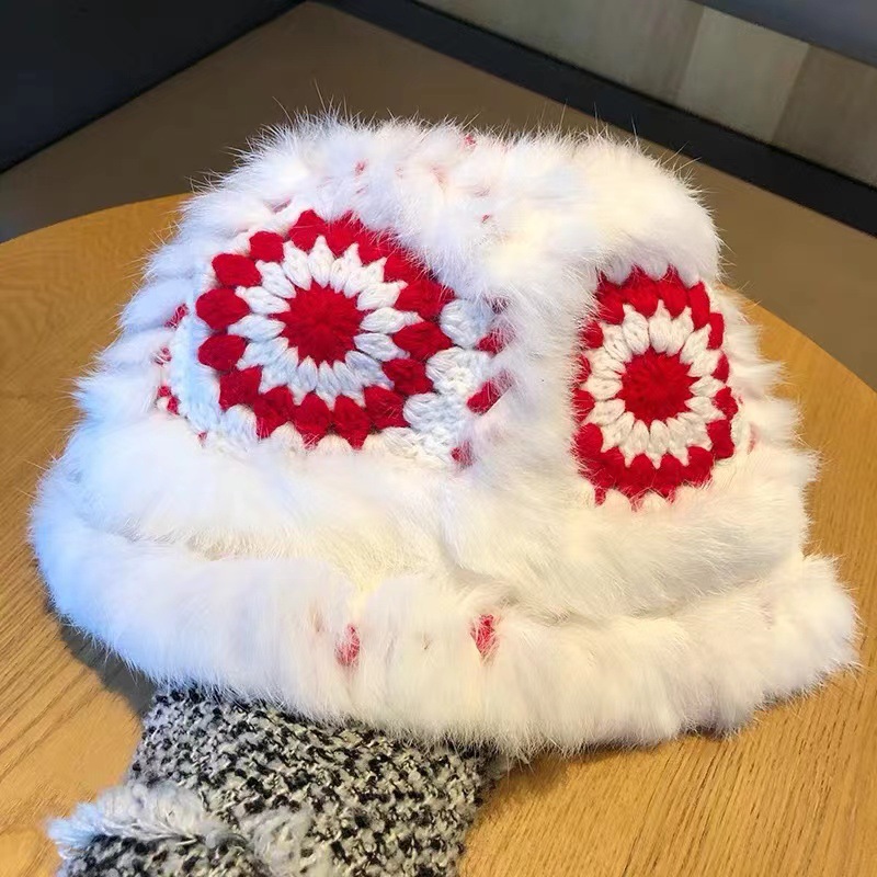 秋冬镂空醒狮手工钩花兔毛皮草针织毛线帽子女韩版镂空花朵渔夫帽