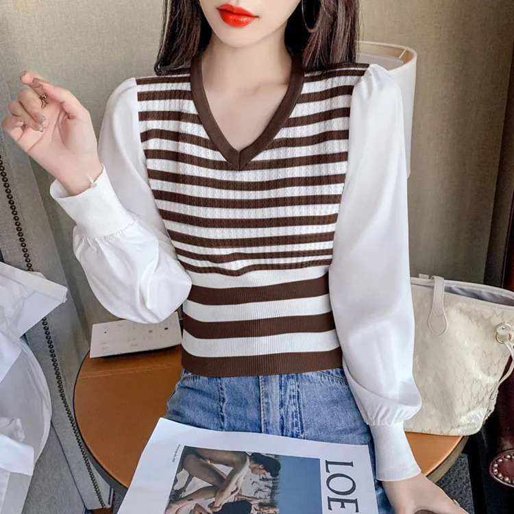 秋季新款收腰小衫雪纺拼接V领条纹针织衫女长袖冰爽针织短款上衣