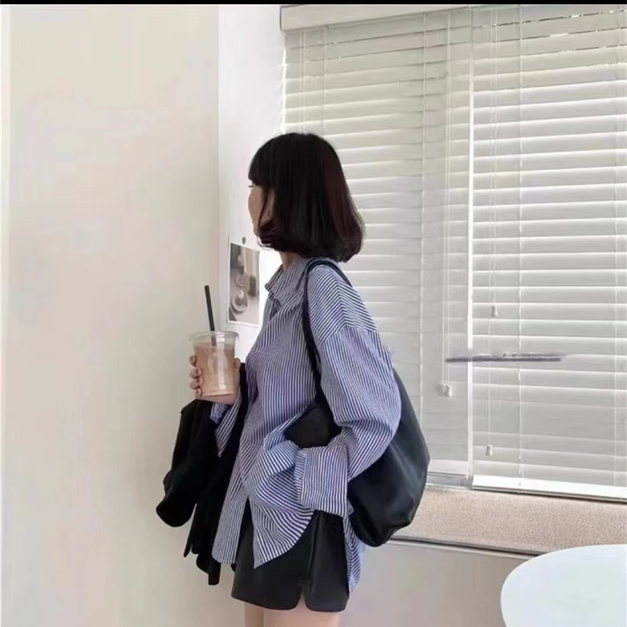 2023早春新款条纹衬衫女韩版宽松休闲时尚百搭单排扣长袖上衣