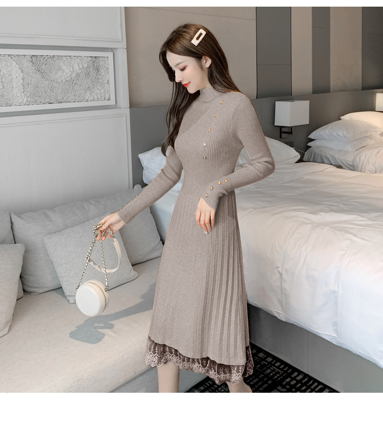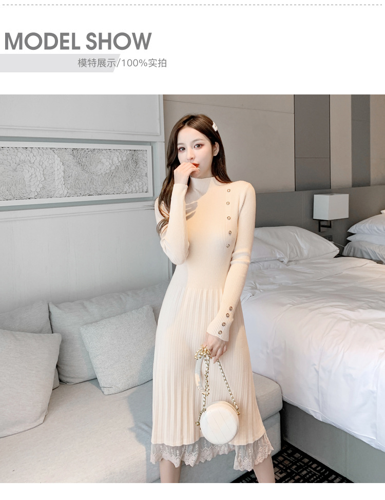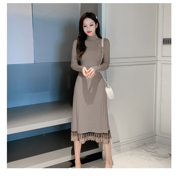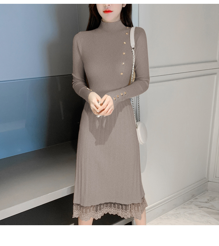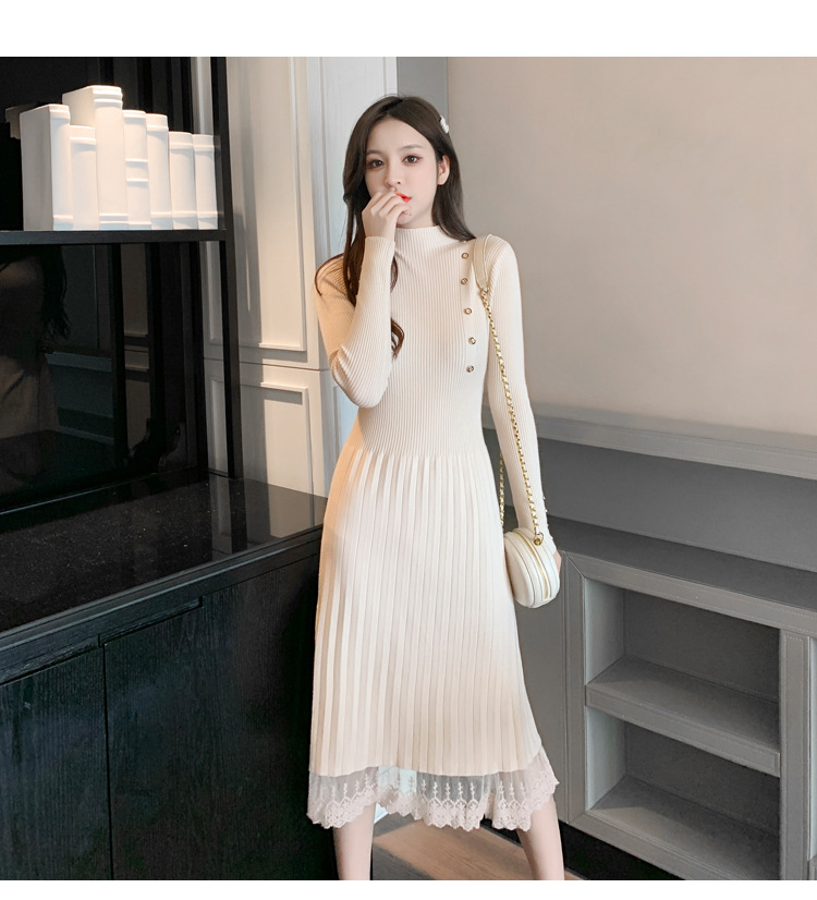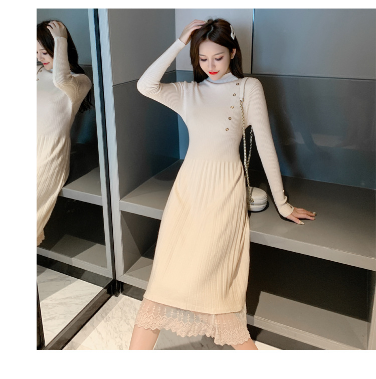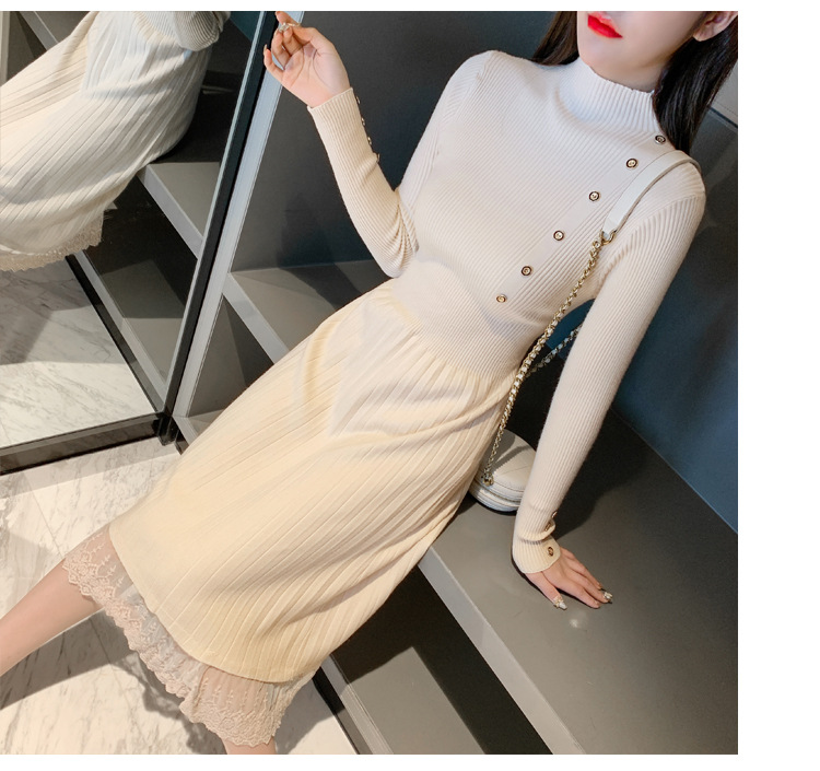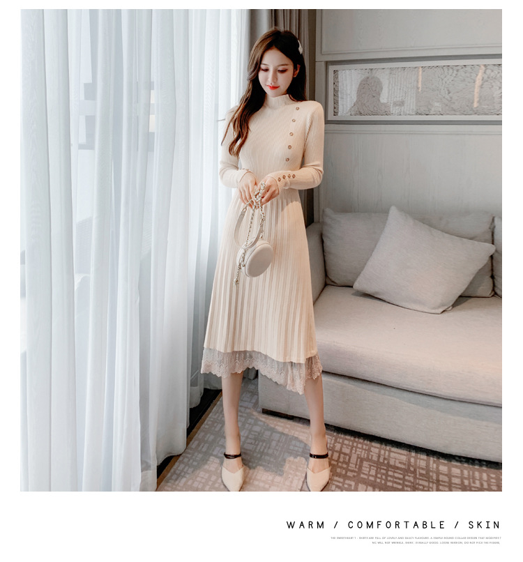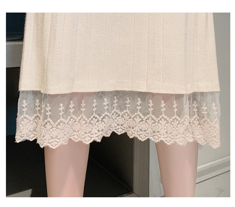 秋冬新款女装针织包芯纱长袖连衣裙女2023宽松蕾丝边气质内搭裙子