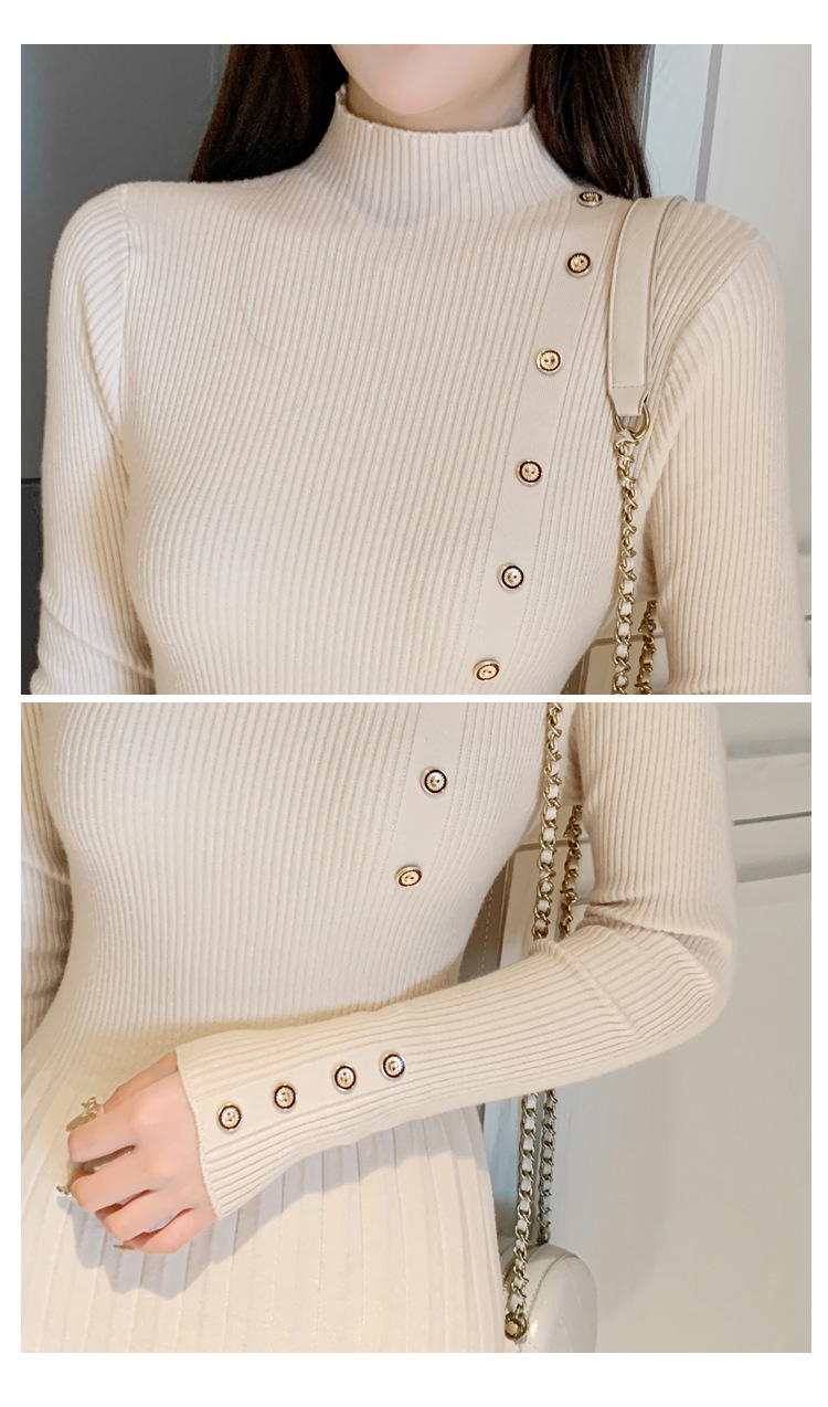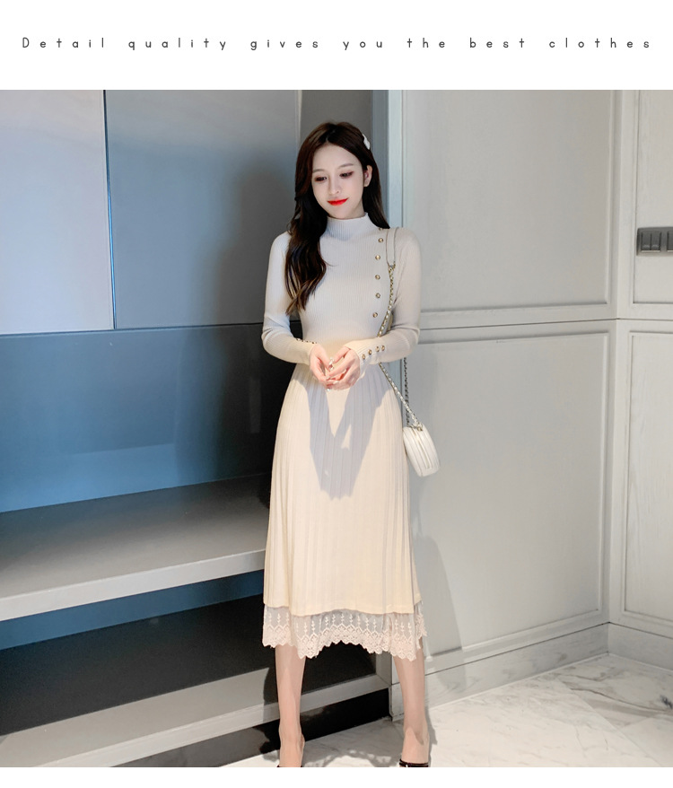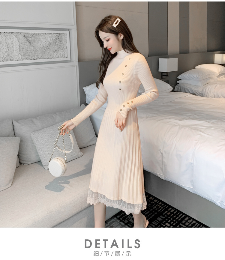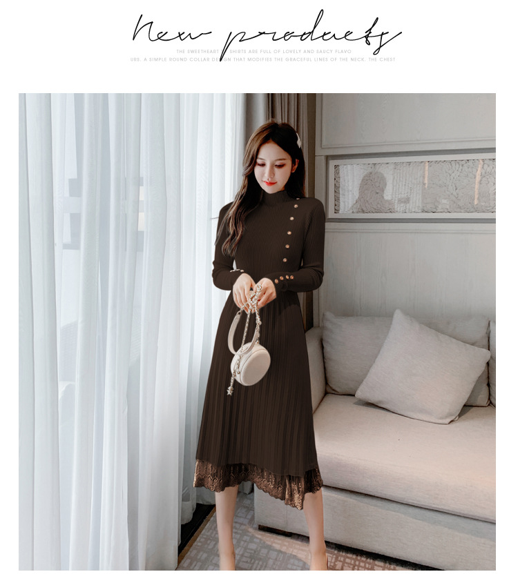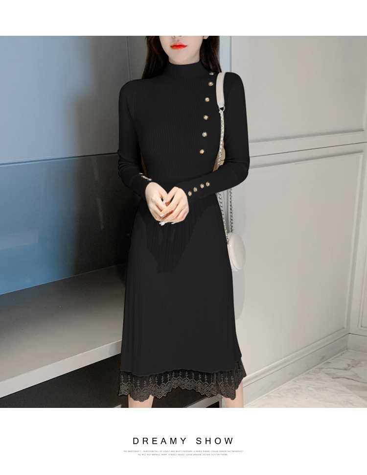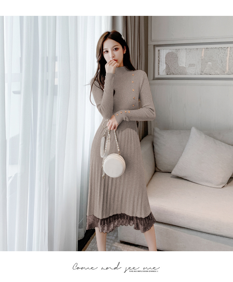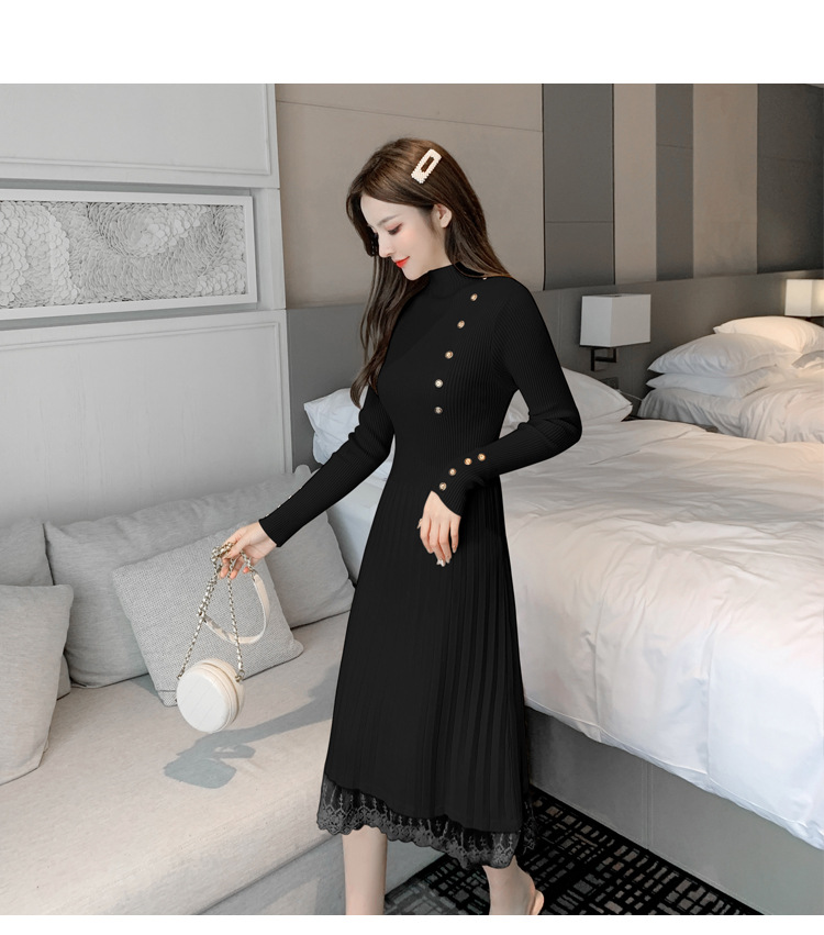 秋冬新款女装针织包芯纱长袖连衣裙女2023宽松蕾丝边气质内搭裙子