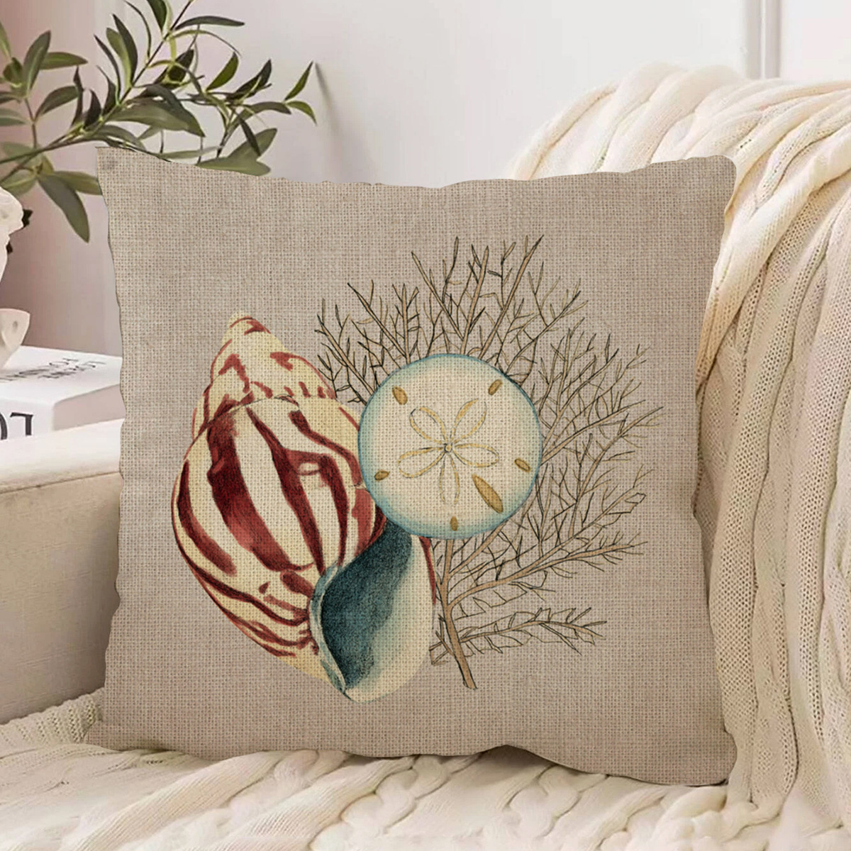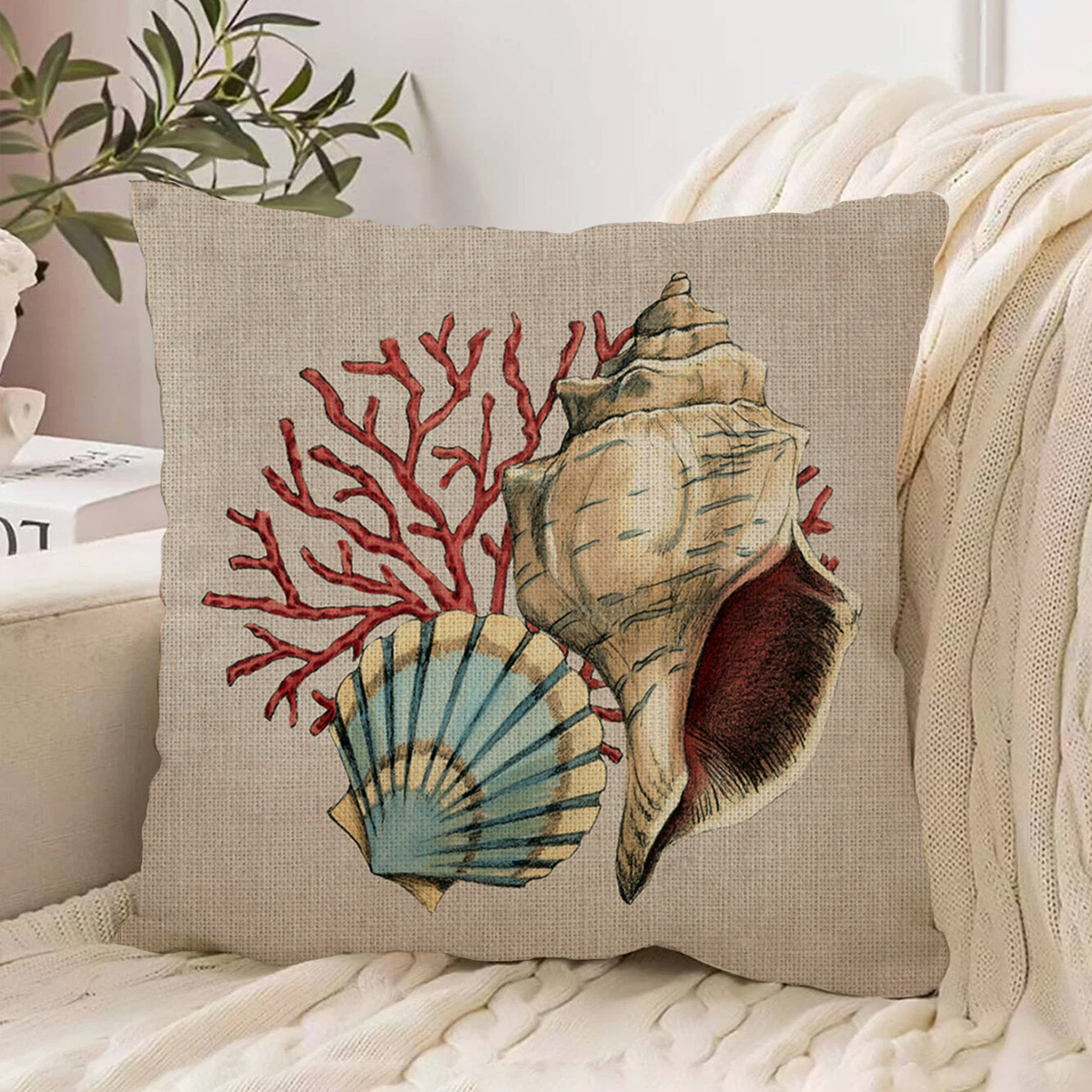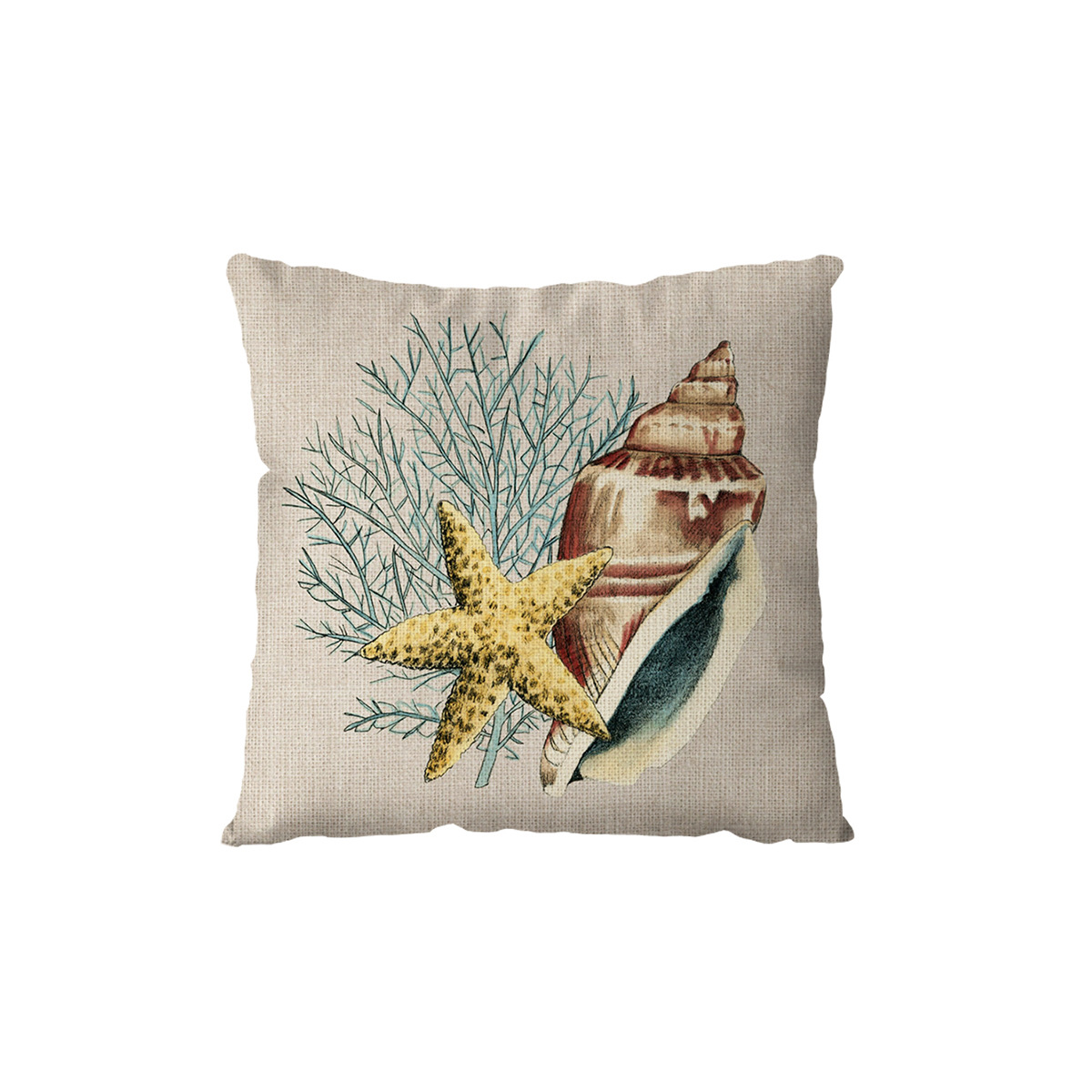 新款地中海风海洋生物贝壳图案印花亚麻抱枕套家居沙发靠垫套