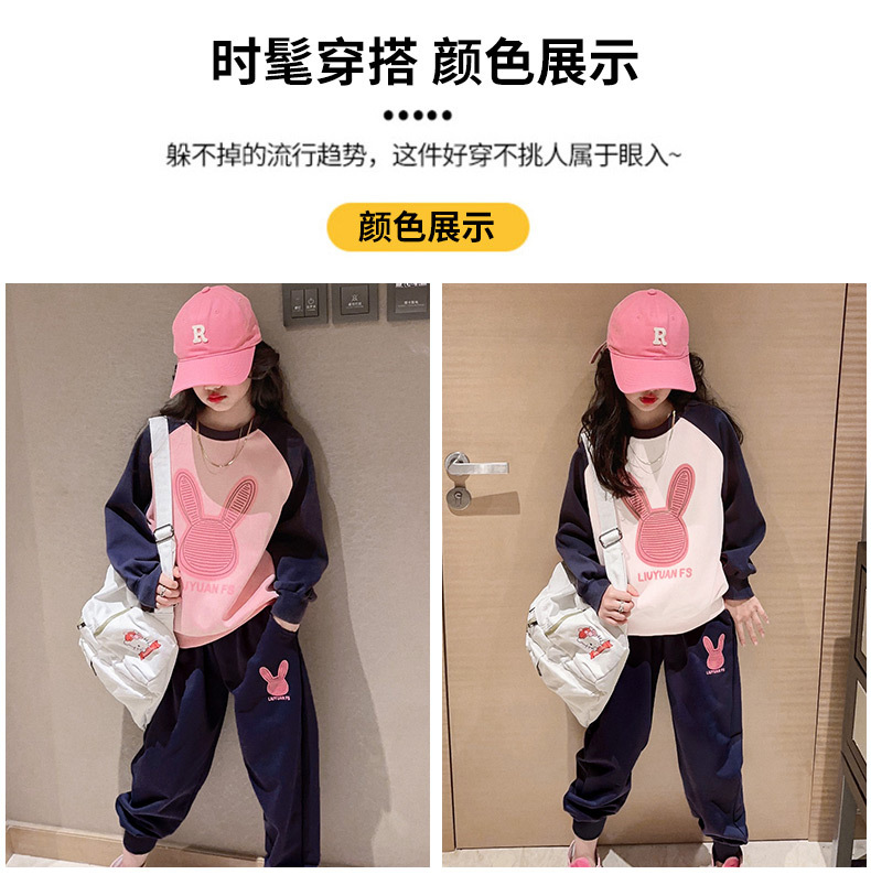 女童套装纯棉韩版拼接撞色兔子2023春季新款中大童两件套厂家直销