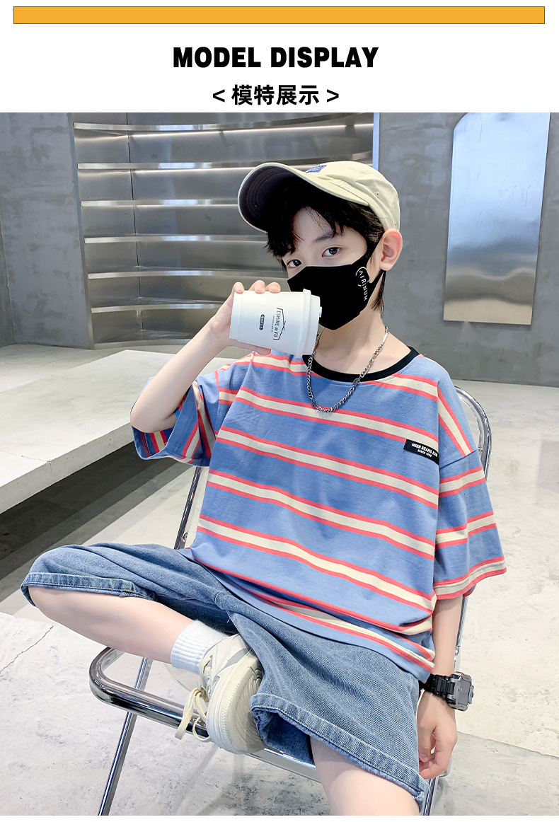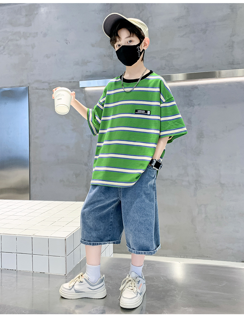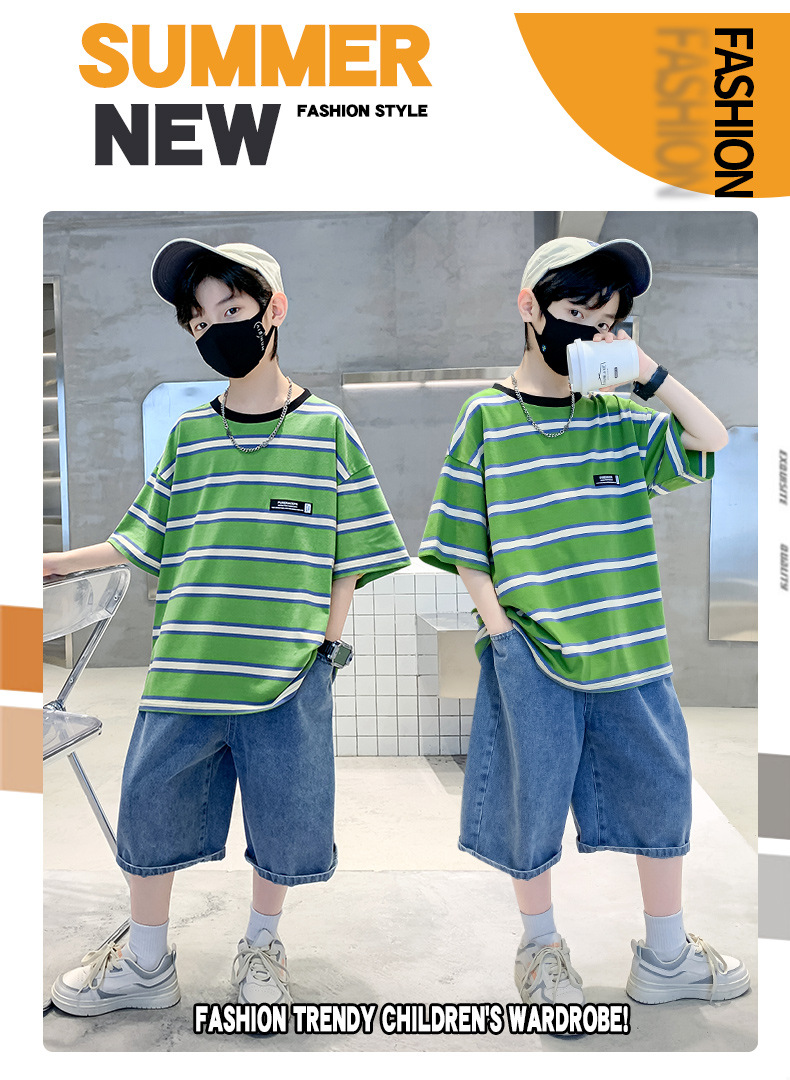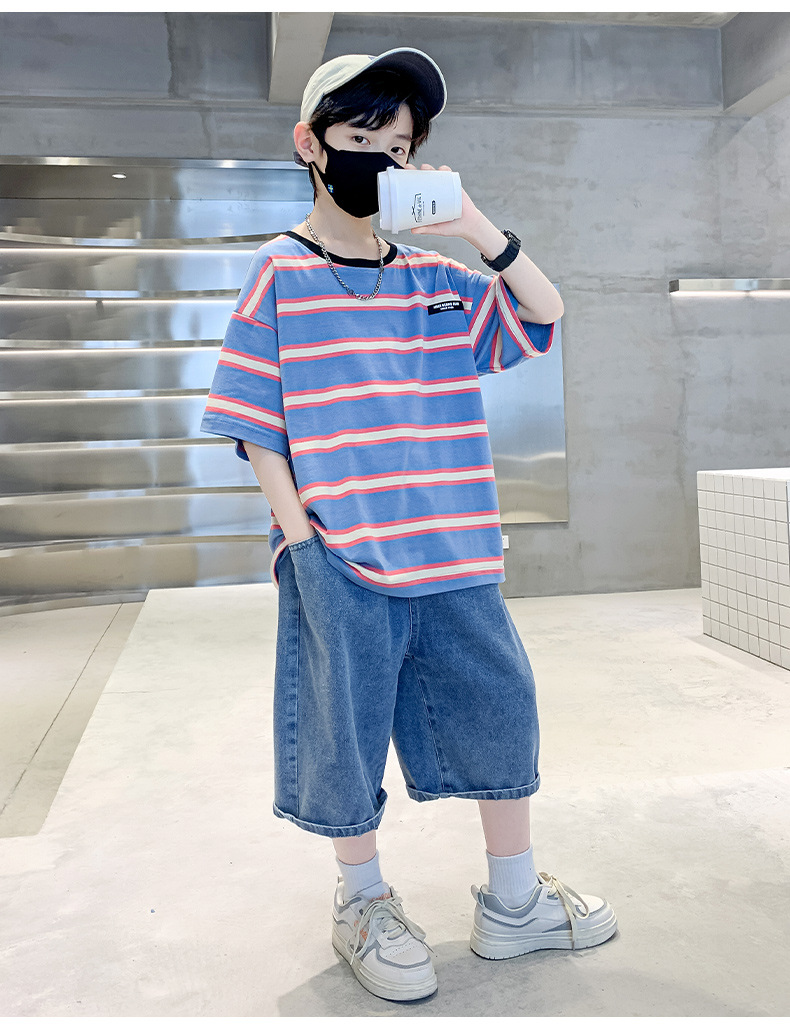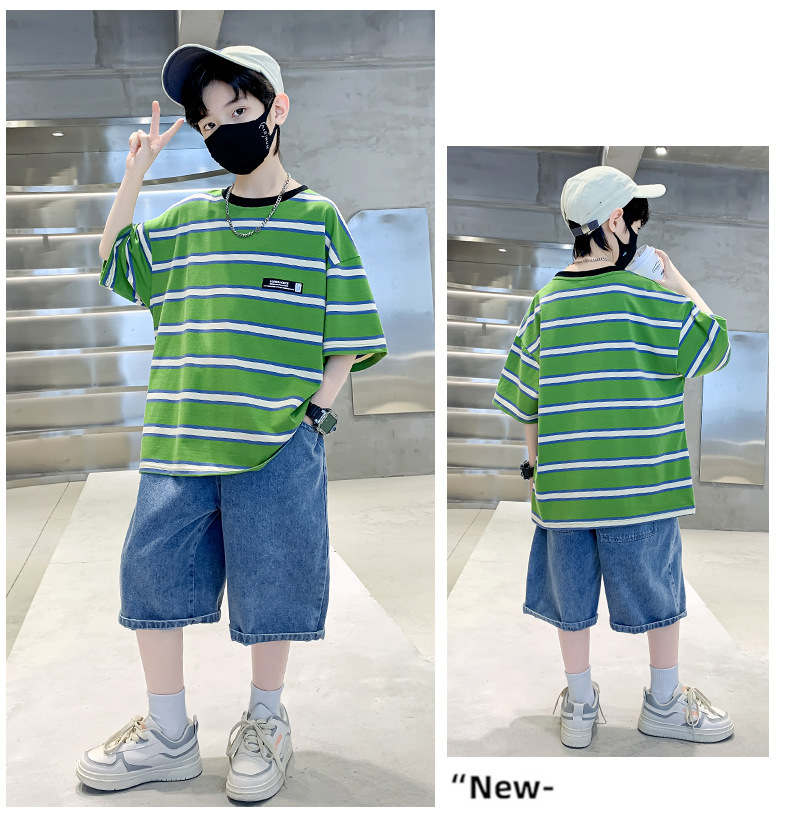 男童夏季套装纯棉透气吸湿2023夏季新款中大童男孩条纹短袖短裤