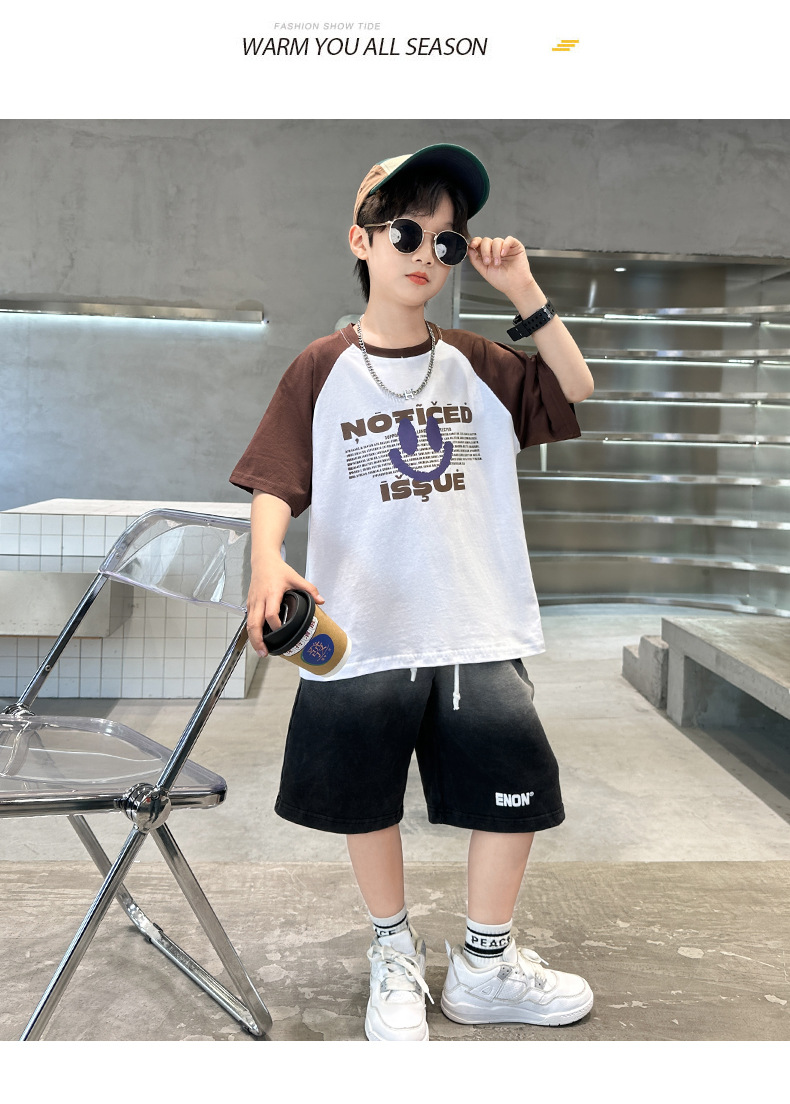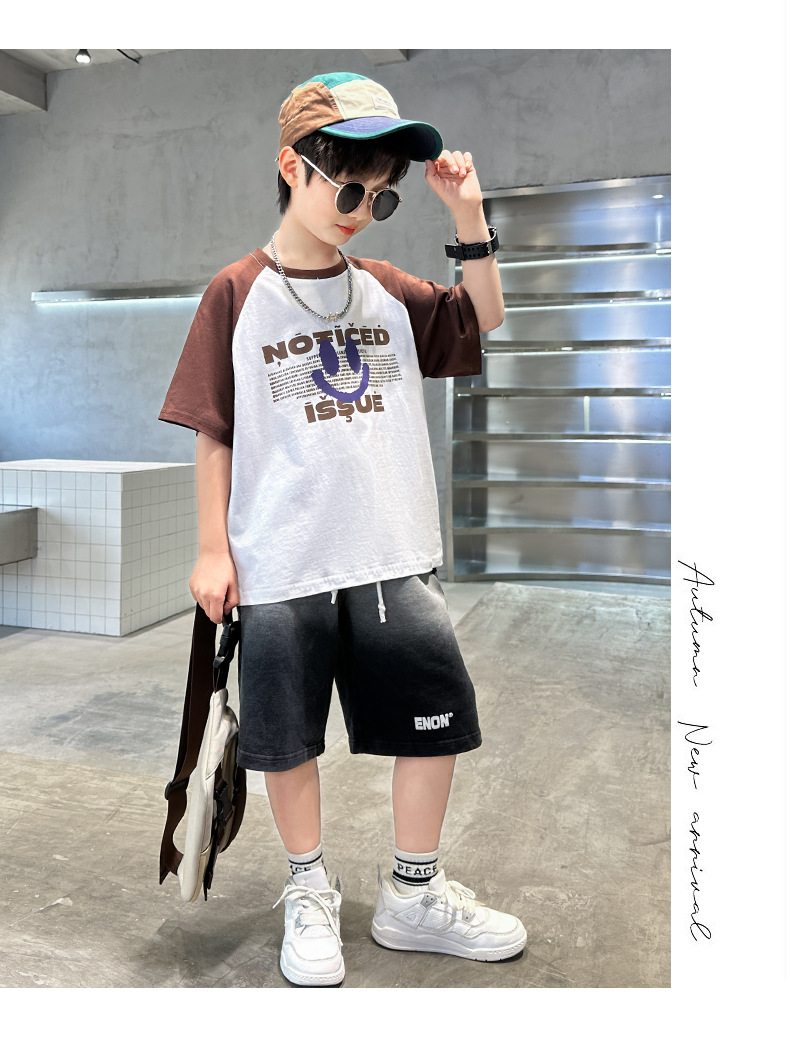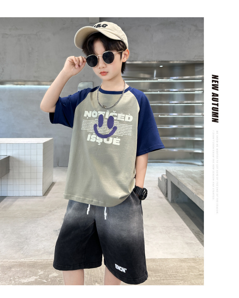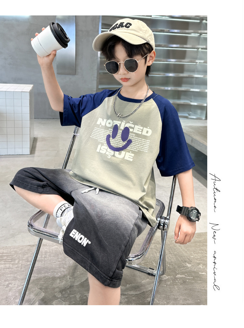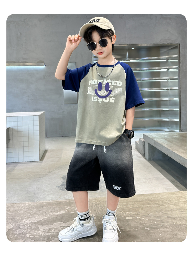 男孩夏季套装纯棉透气吸湿2023新款中大童男童短袖短裤两件套笑脸
