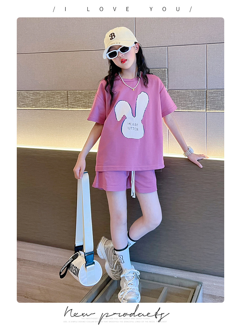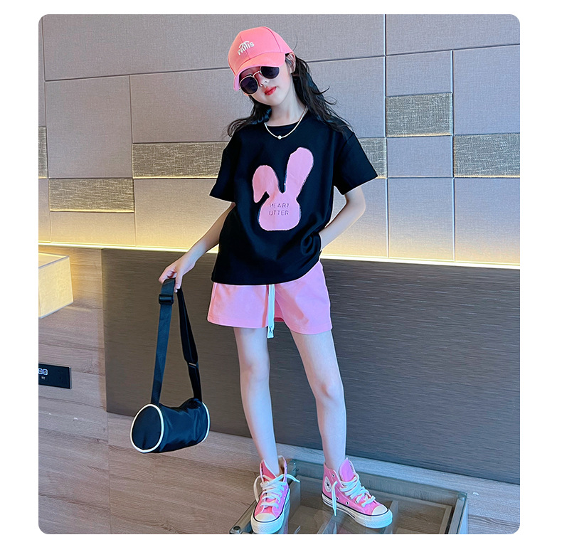 女孩夏季套装透气吸湿2023新款中大童女童短袖短裤两件套朱迪棉