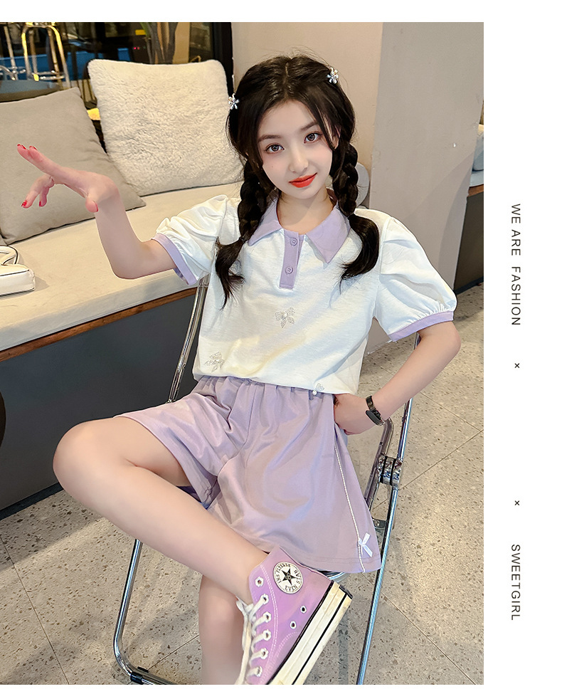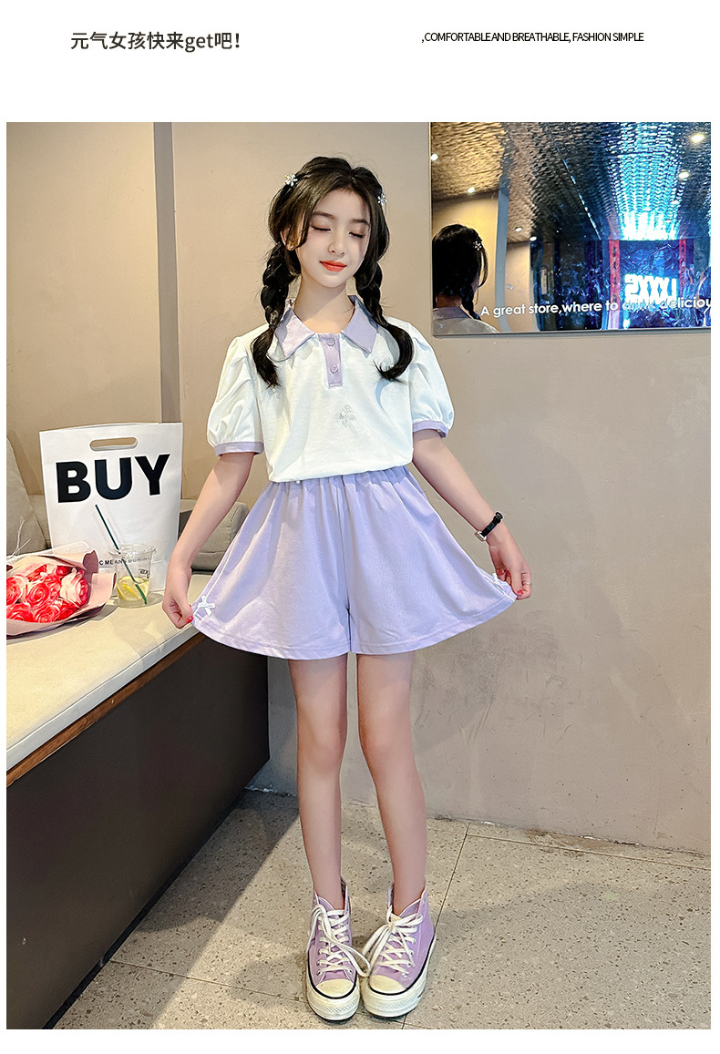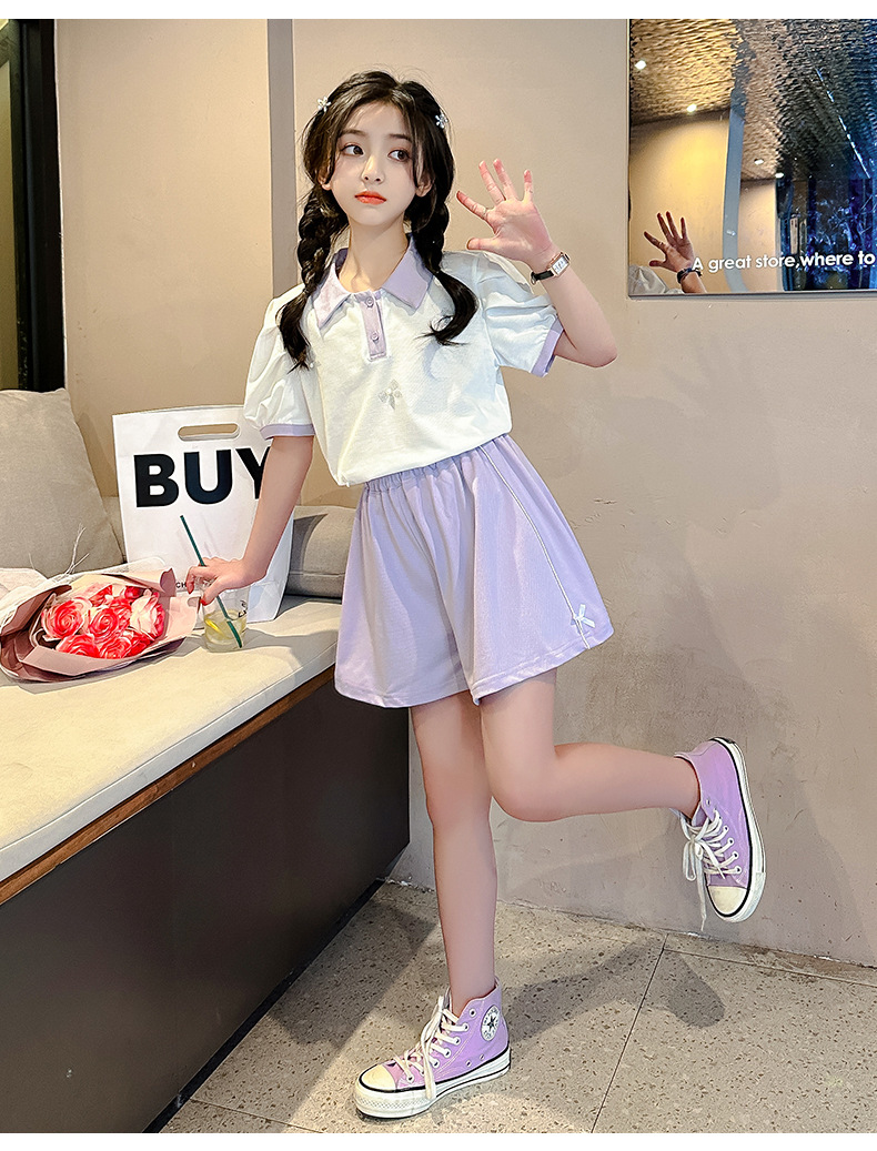 女孩夏季套装朱迪棉透气吸湿2023新款中大童女童polo衫短裤两件套