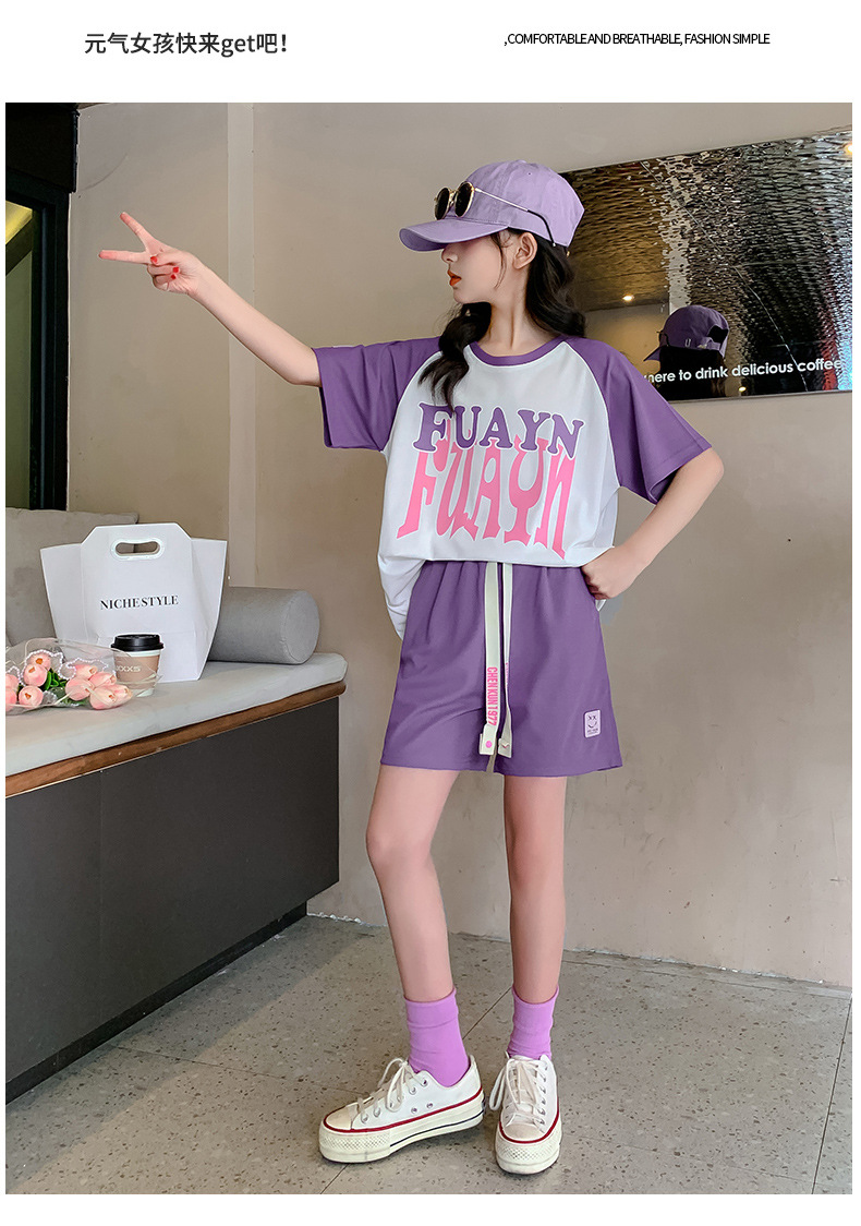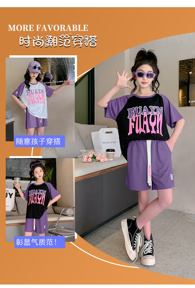 女孩夏季套装透气吸湿2023新款中大童女童短袖短裤两件套字母潮款