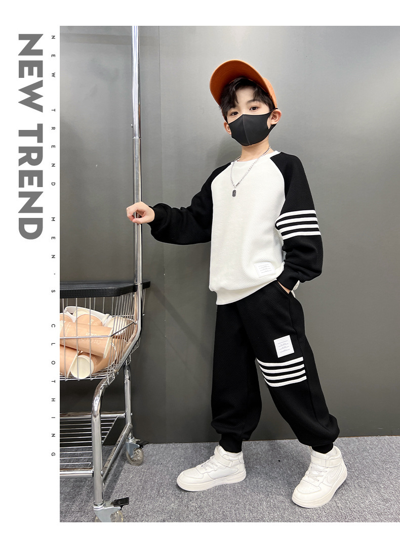男童春款套装纯棉2023春季新款中大童男孩卫衣卫裤两件套拼色条纹
