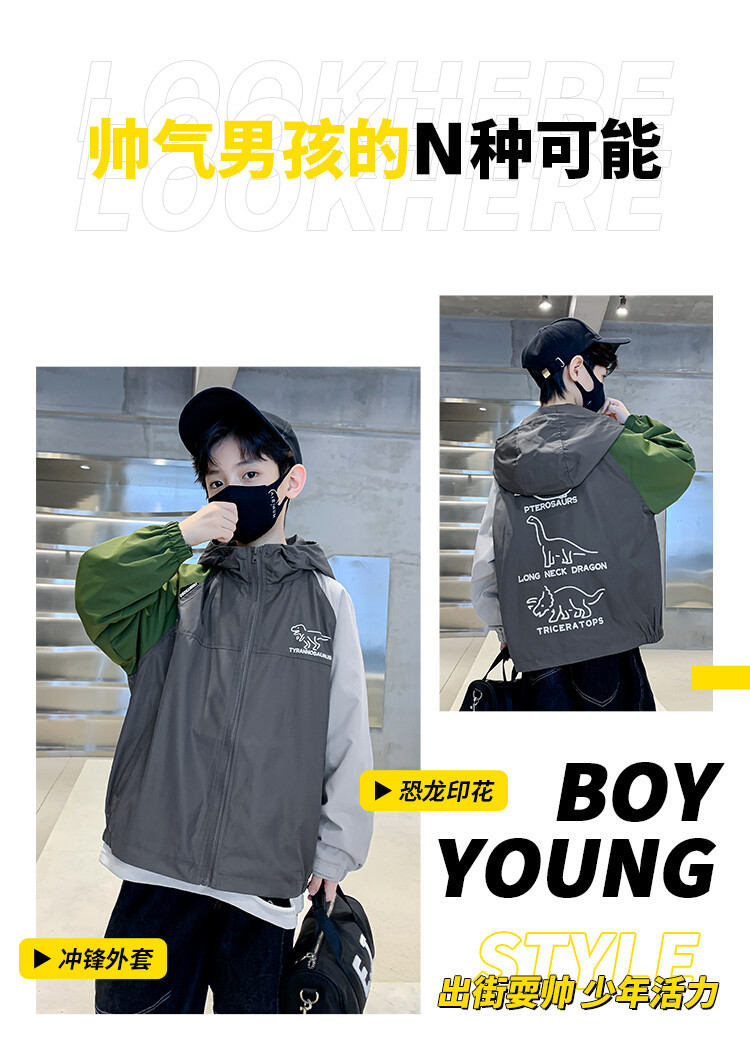厂家直销男童卡通恐龙印花风衣外套潮中大童连帽外套男童风衣批发