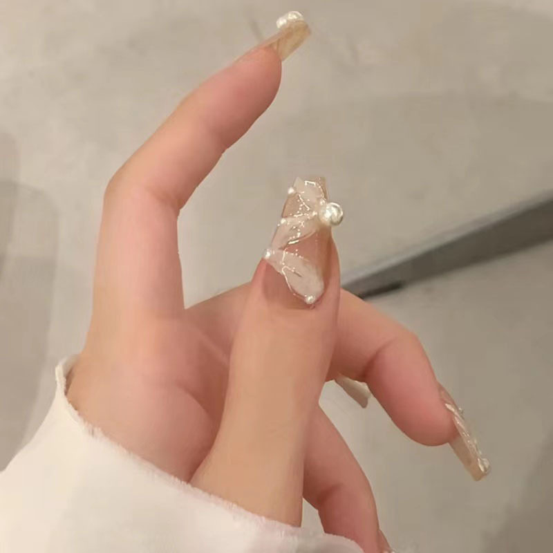 小红书爆款穿戴甲批发美甲中长梯芭蕾甲珍珠丝绸飘带指甲贴假指甲