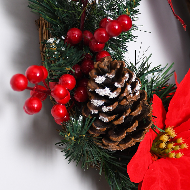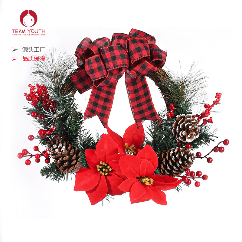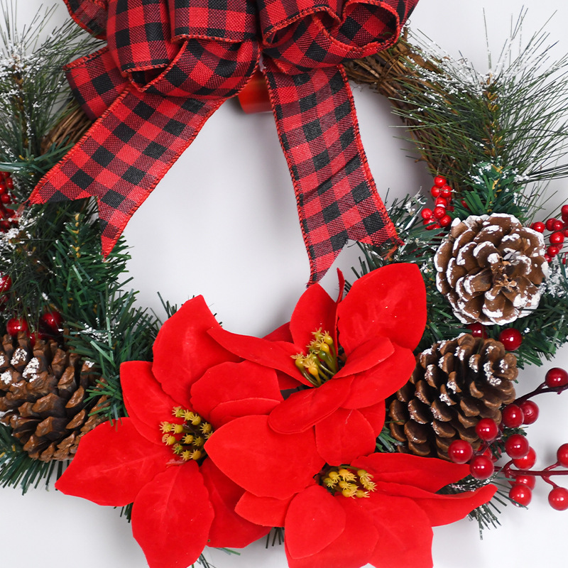 跨境新款45cm松针天然藤圈红黑格子蝴蝶结门挂橱窗装饰品圣诞花环
