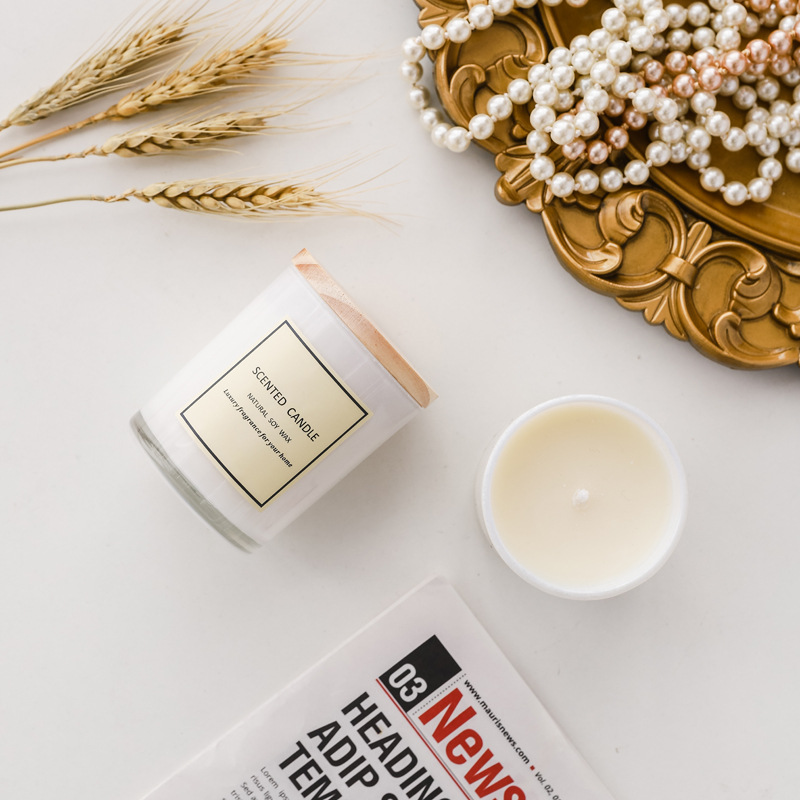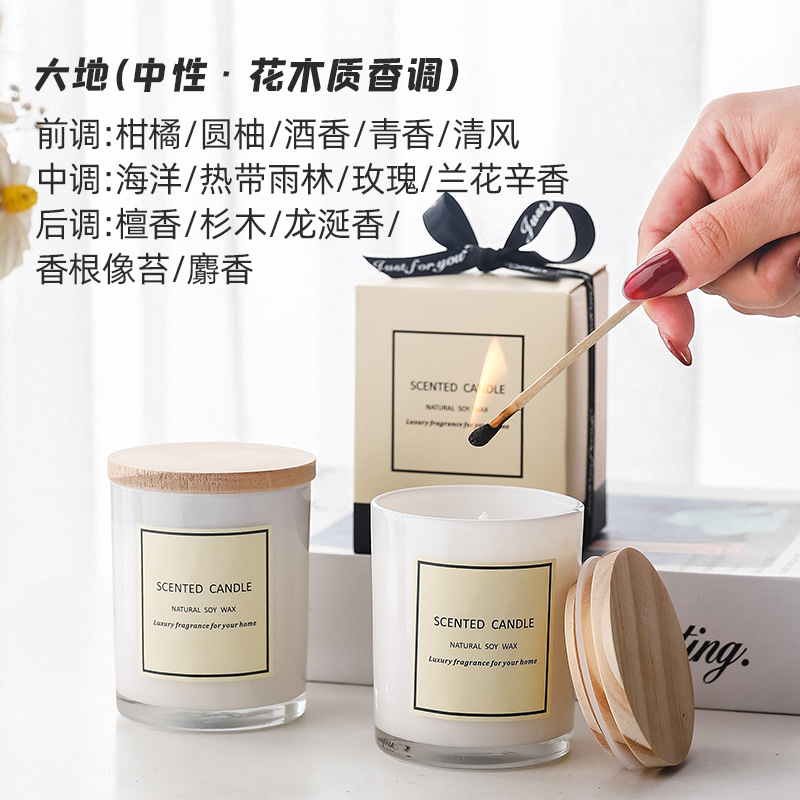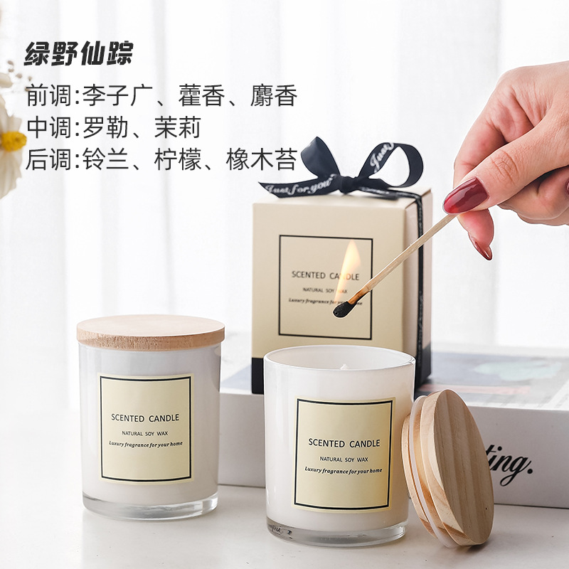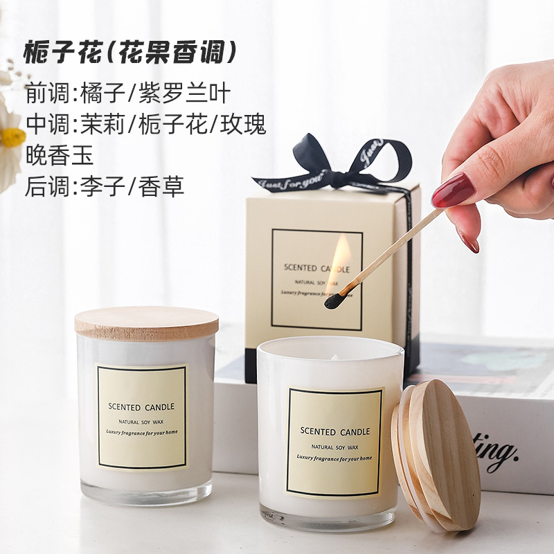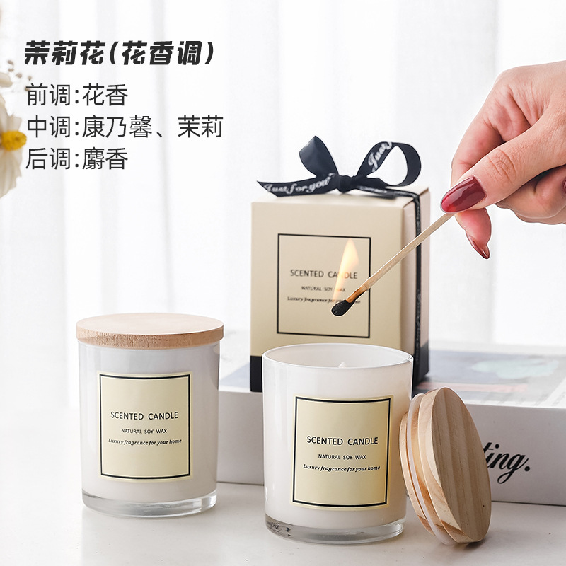 新款白色玻璃杯带木盖香薰蜡烛 彩带礼盒香氛蜡烛 现货香味蜡烛