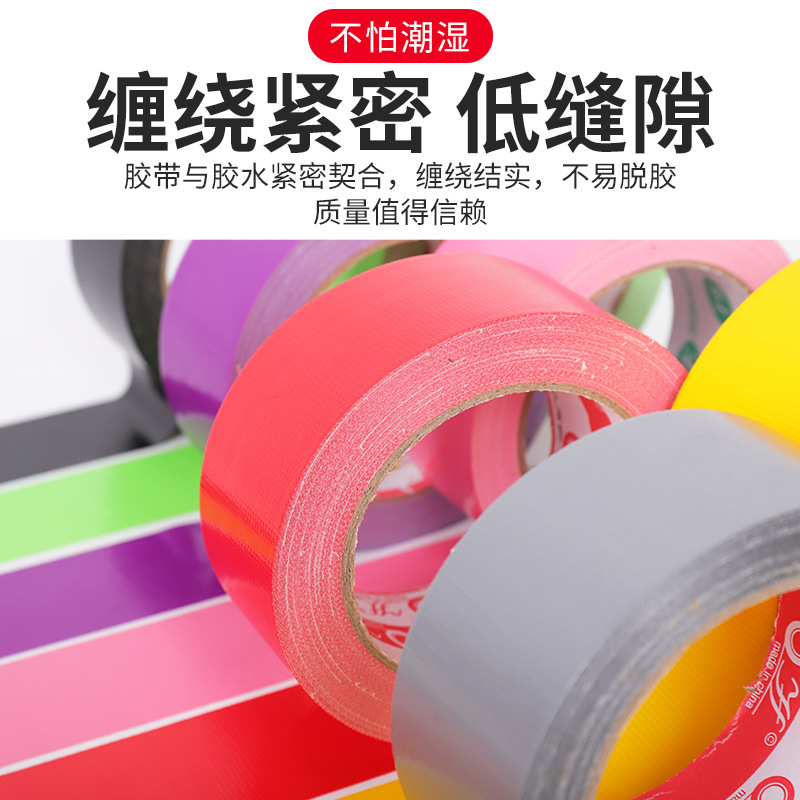 本公司生产的彩色布基胶带拥有高粘性.不易断.耐磨损.颜色鲜艳等特点多用于地毯拼接美缝,工厂地面走廊标识,线束捆扎,汽车内饰粘贴,防水绝缘等!规格多样颜色种类全支持定制!