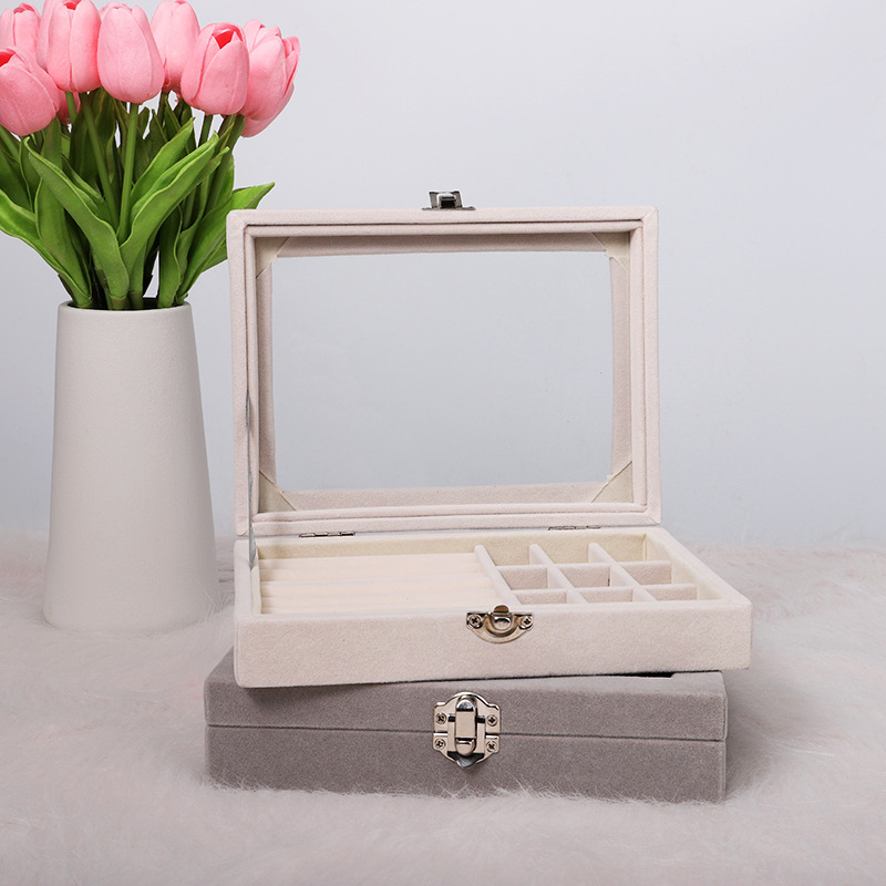 首饰盒小巧精致透明玻璃防氧化耳饰盒带锁耳钉项链绒布饰品收纳盒