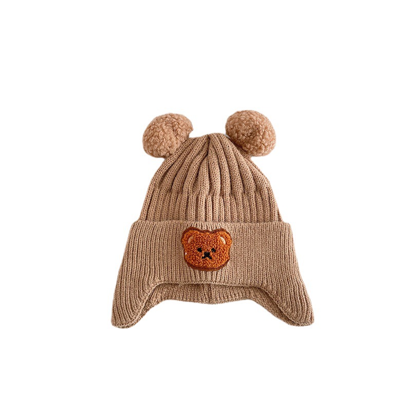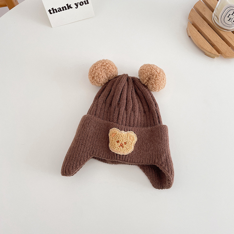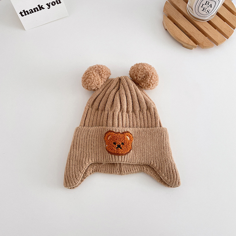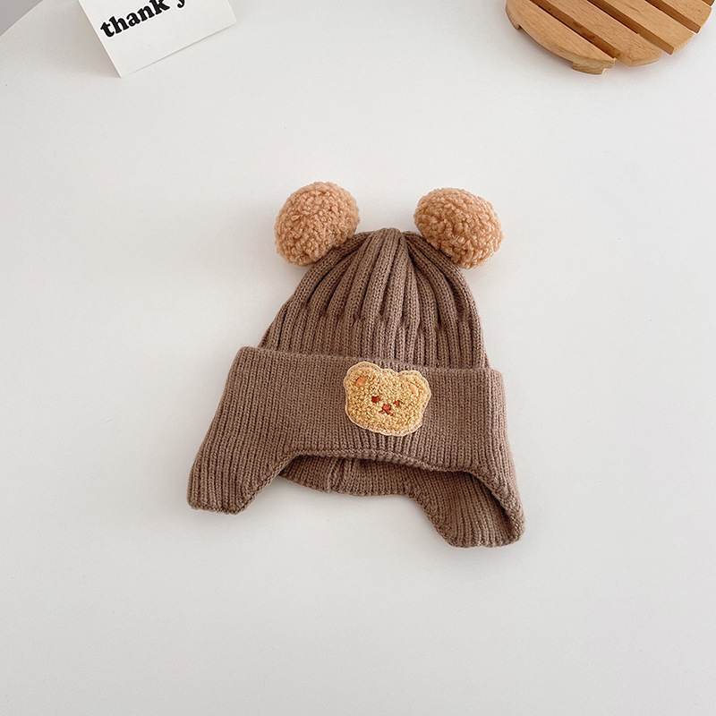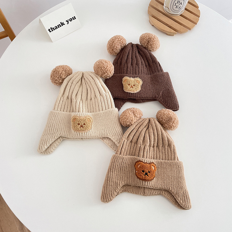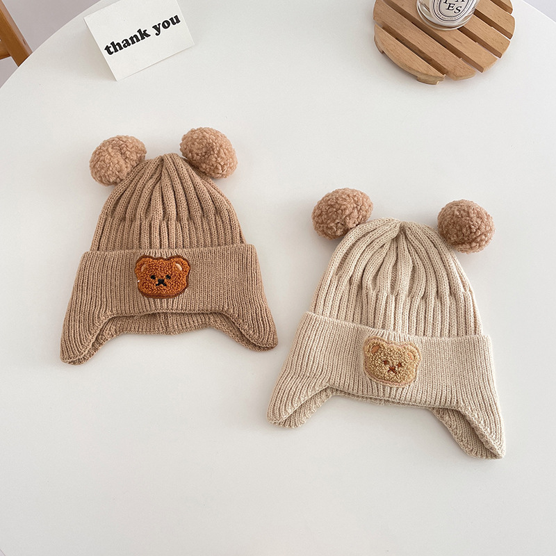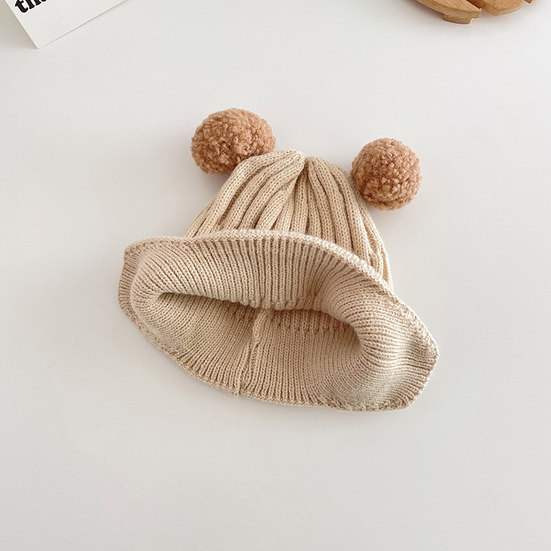 小熊双球宝宝帽子春秋儿童毛线帽婴幼儿毛球针织帽秋冬保暖护耳帽