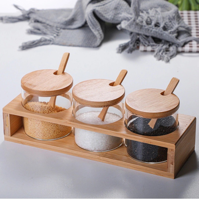 日式玻璃竹木调料盒套装家用厨房盐罐调料调味瓶罐收纳盒套装