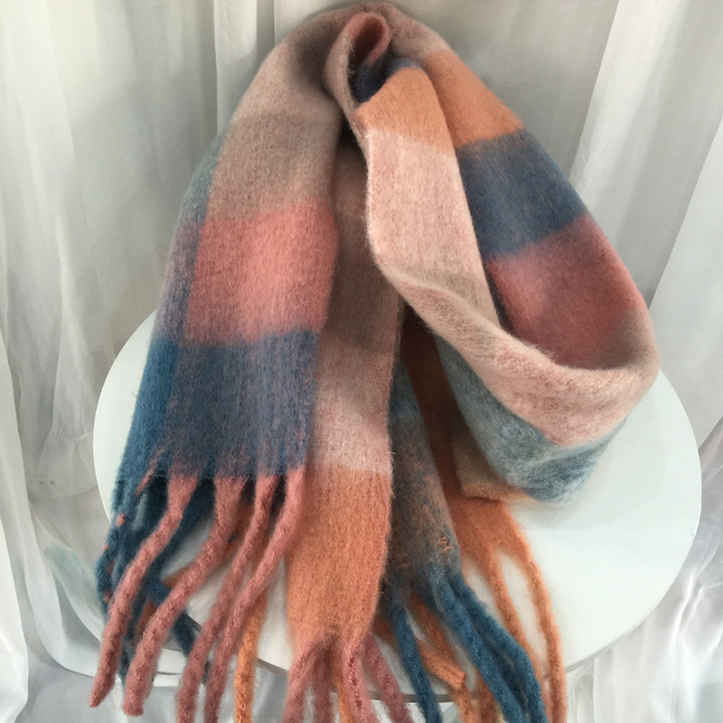 新彩虹格子围巾女冬季克莱因蓝粗辫子彩色格子保暖加厚ins潮可爱