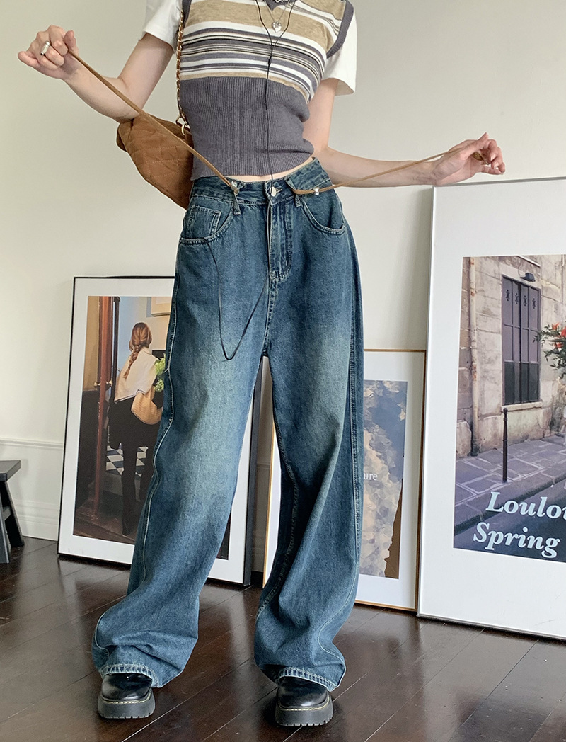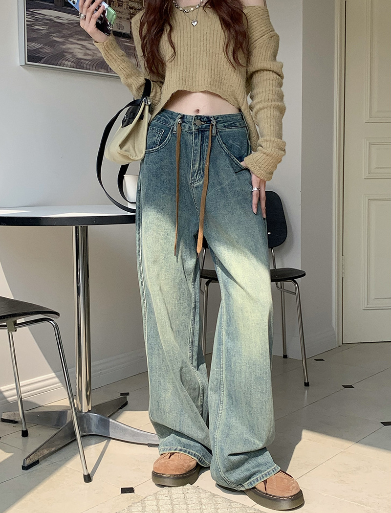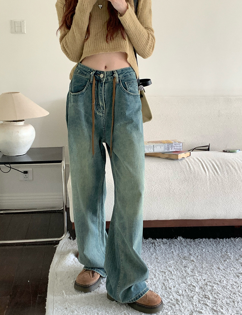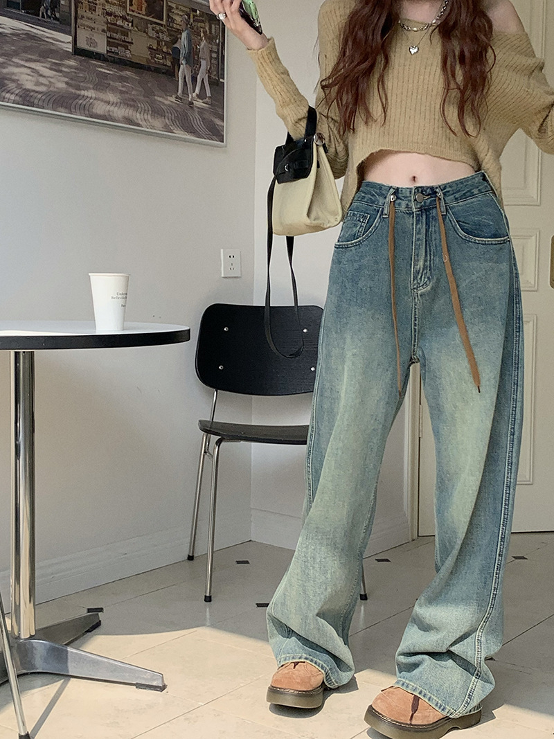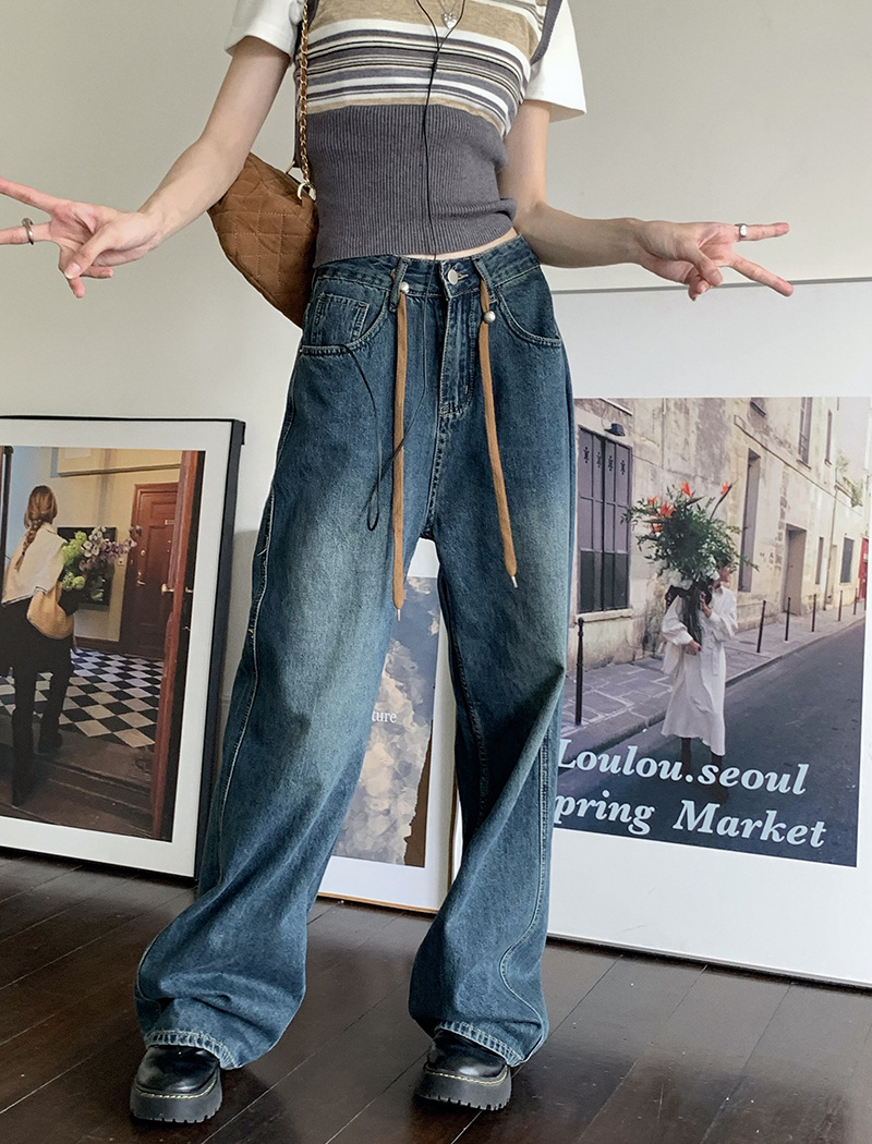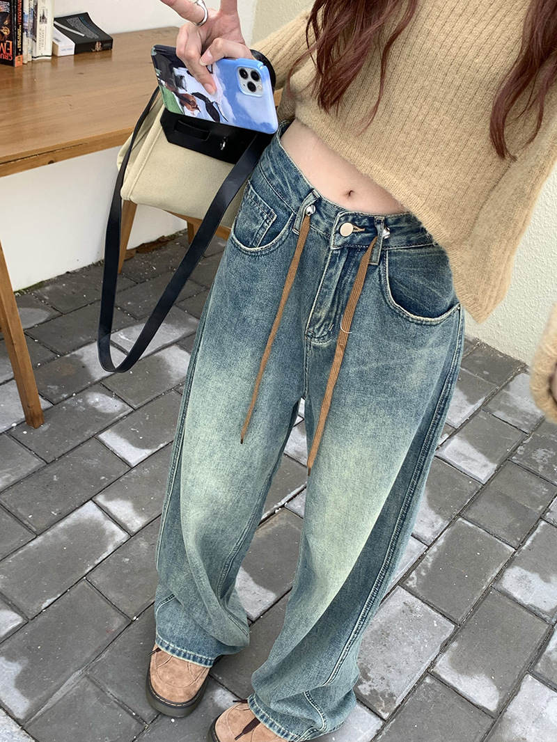 实拍2023早秋新品复古怀旧抽绳牛仔直筒高腰阔腿拖地长裤女