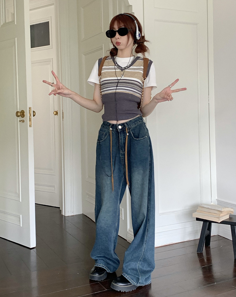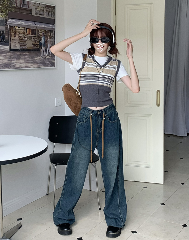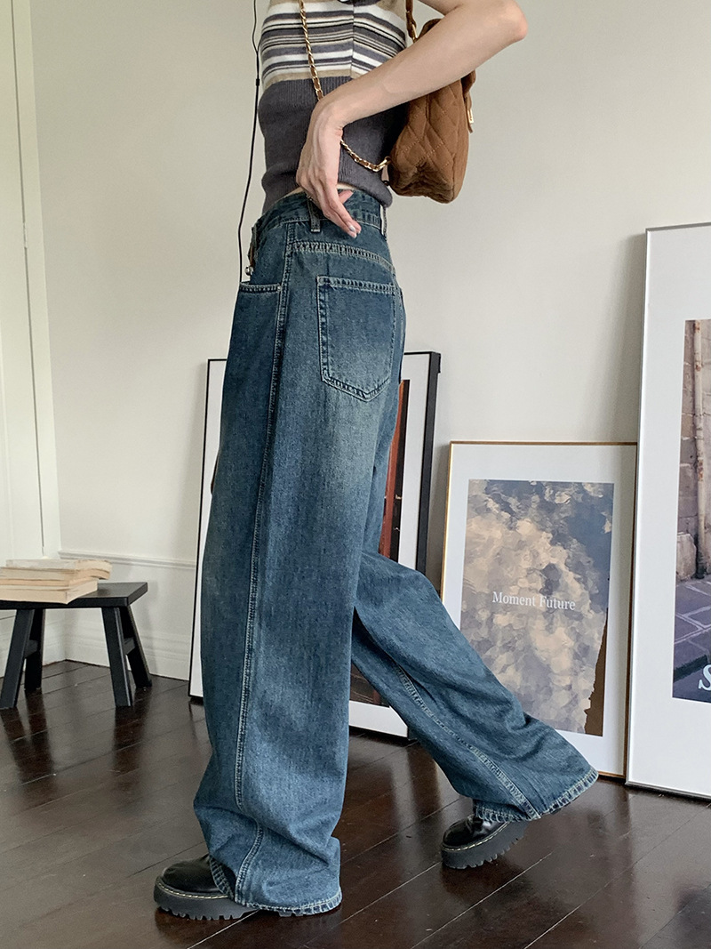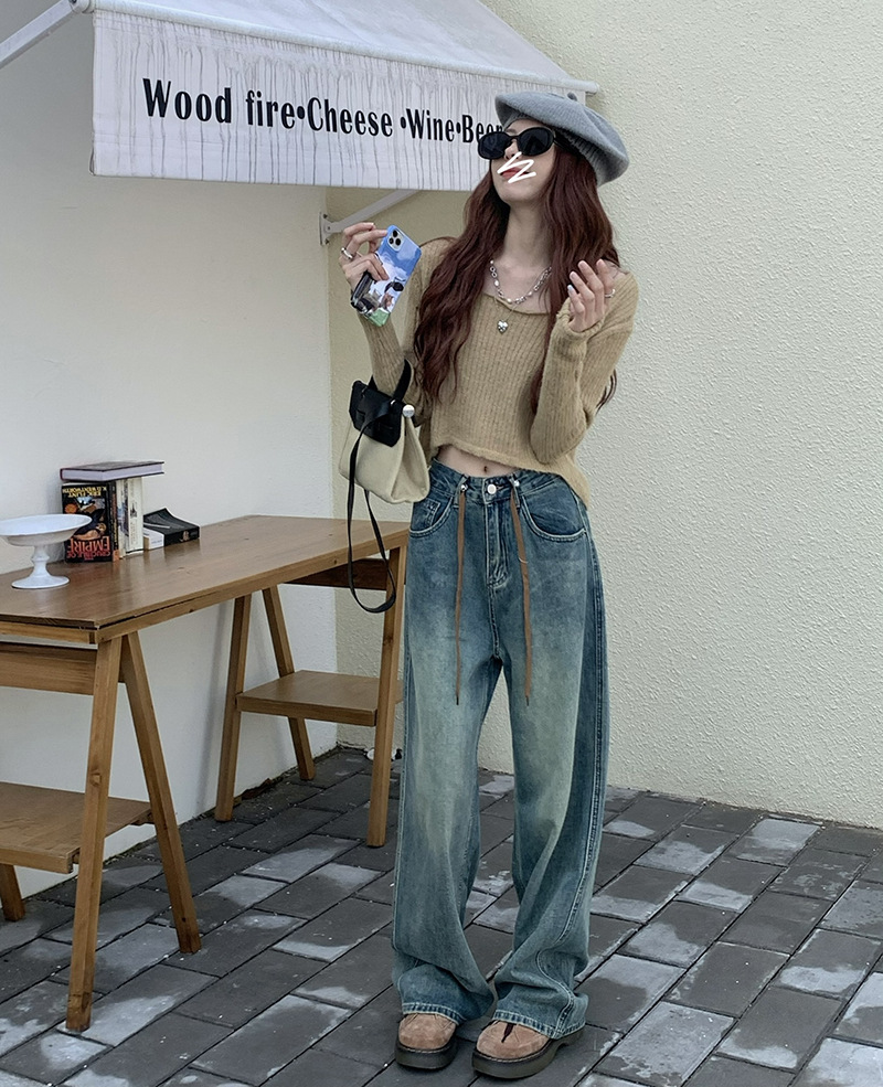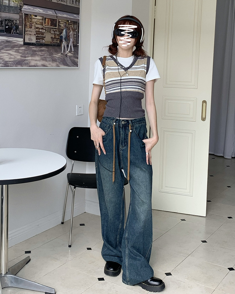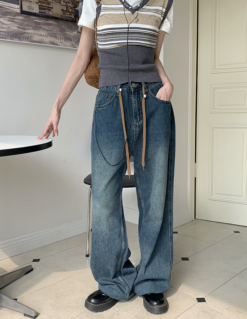 实拍2023早秋新品复古怀旧抽绳牛仔直筒高腰阔腿拖地长裤女