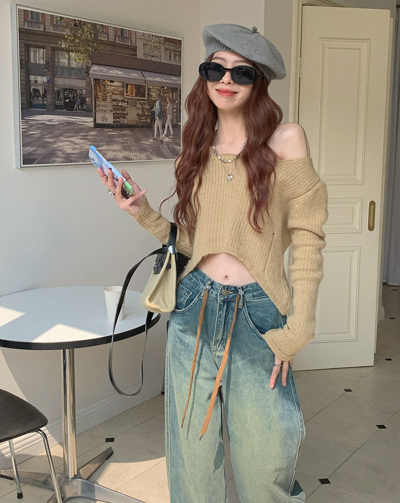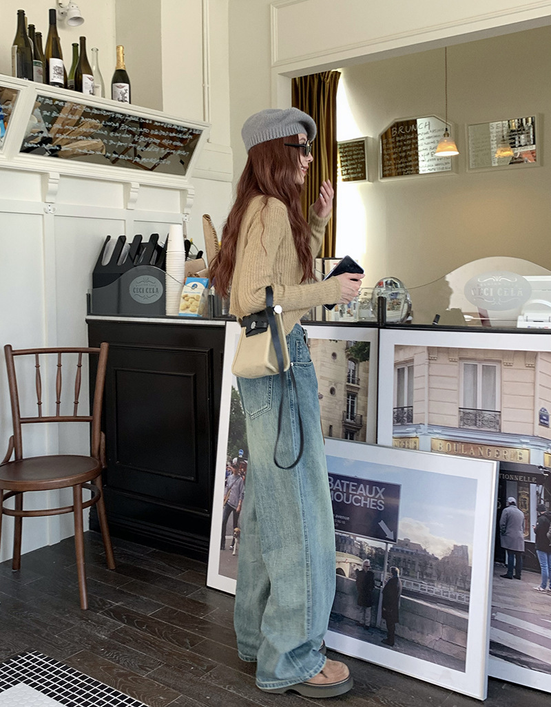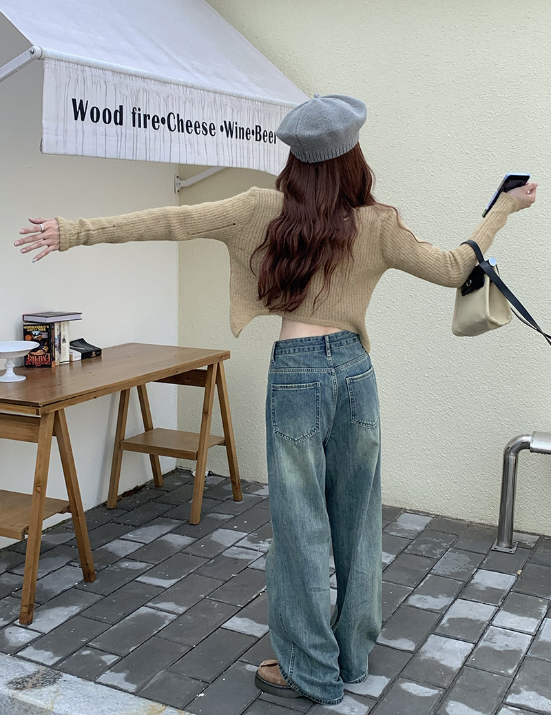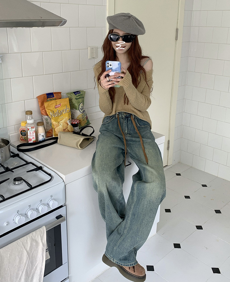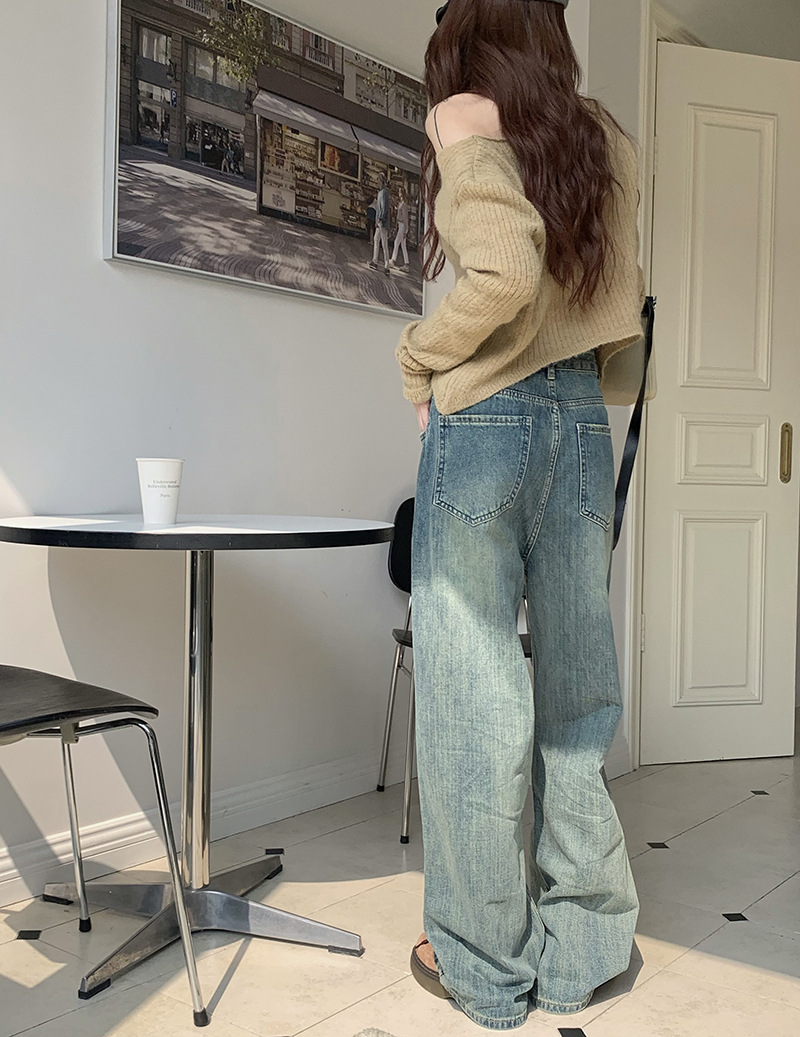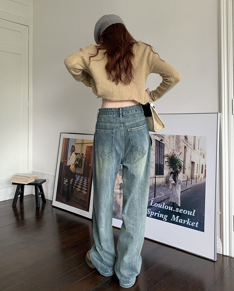 实拍2023早秋新品复古怀旧抽绳牛仔直筒高腰阔腿拖地长裤女