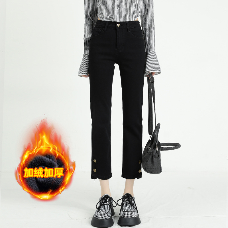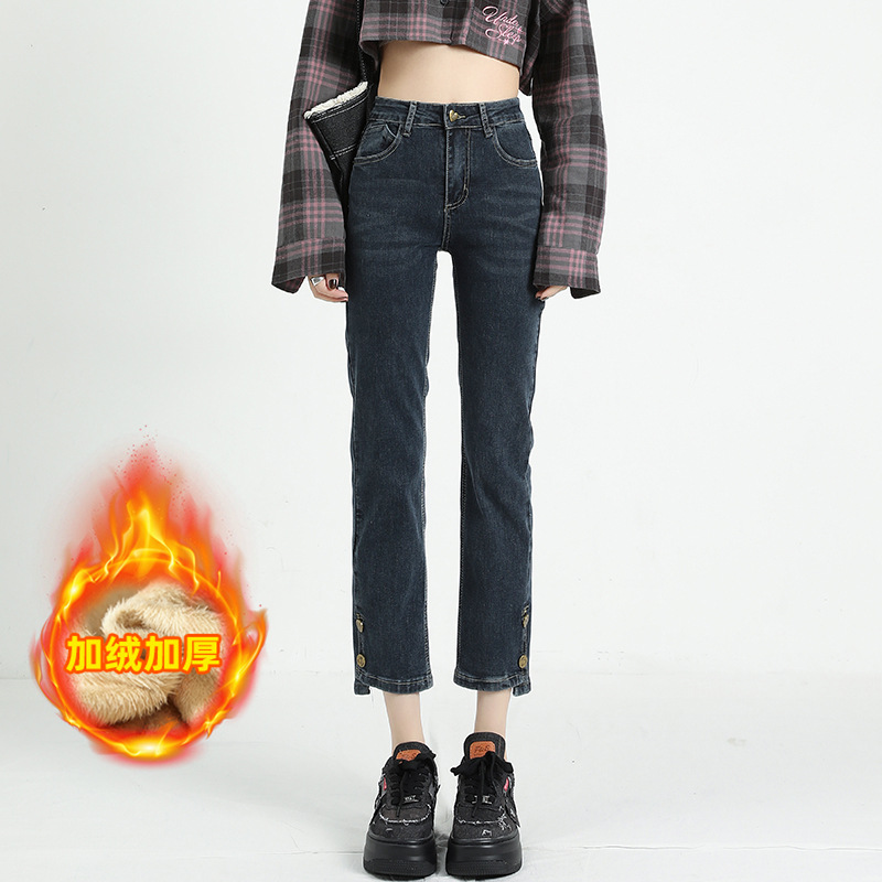 秋冬新款高腰直筒牛仔裤女加绒宽松小个子九分显瘦烟管裤八分