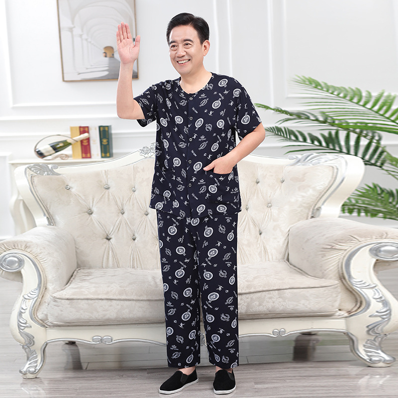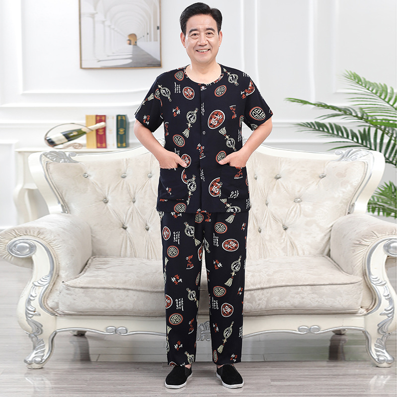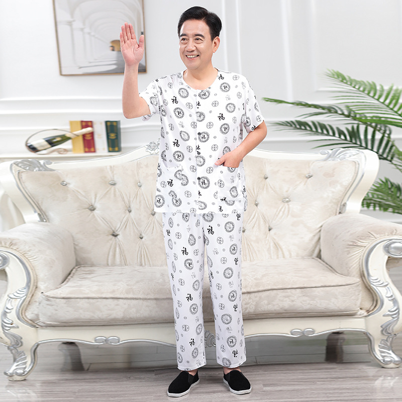 中老年人男士棉绸睡衣爸爸装短袖长裤家居服爷爷人造棉开衫套装薄