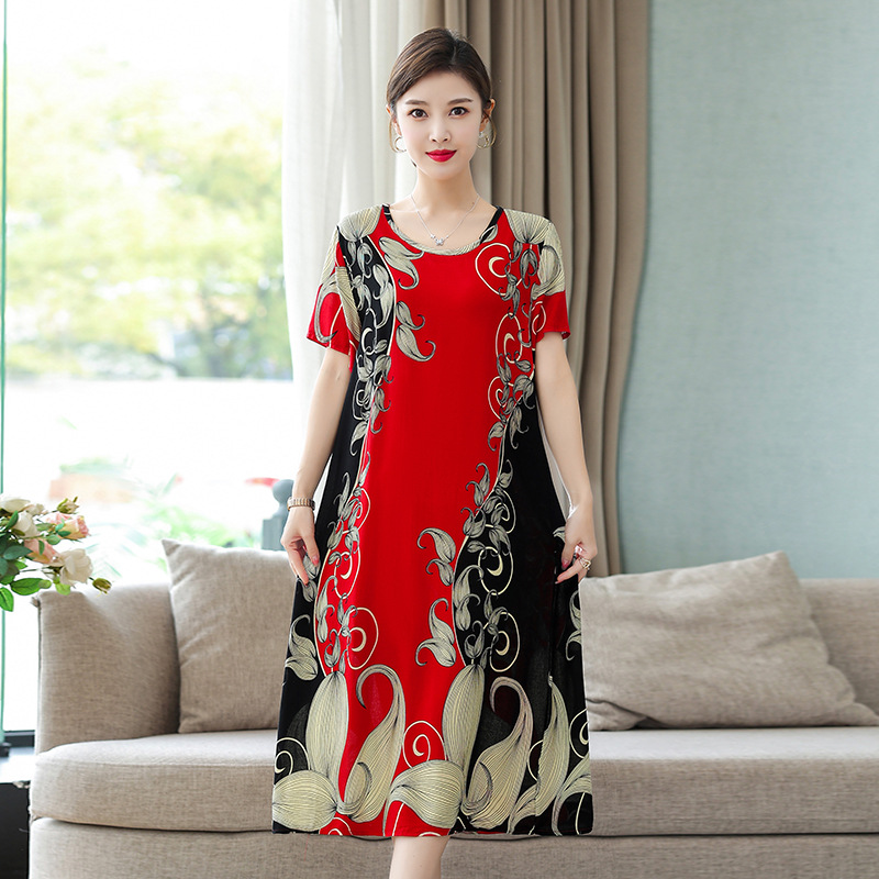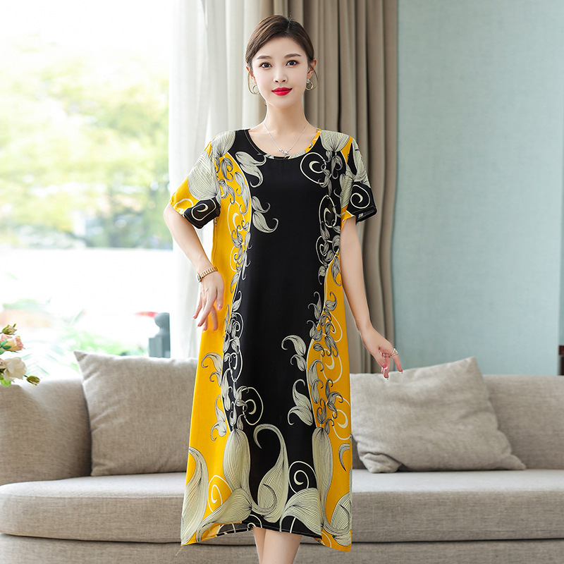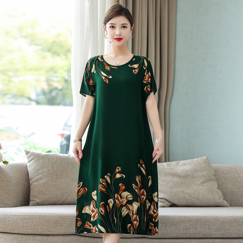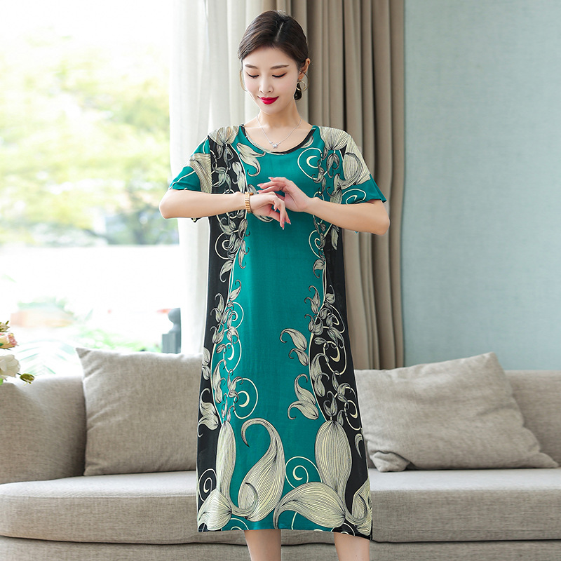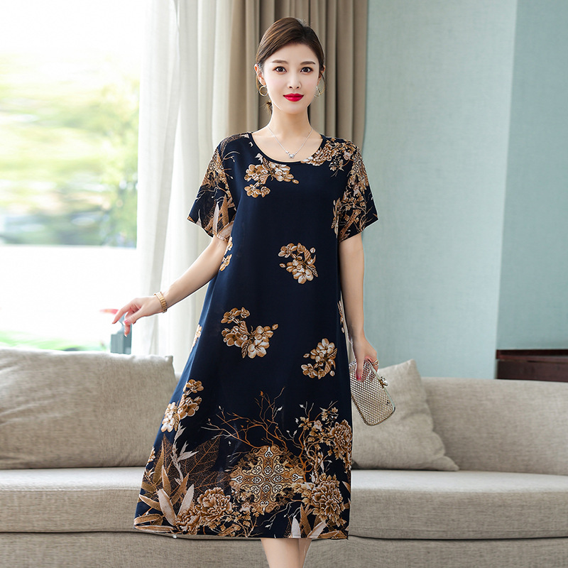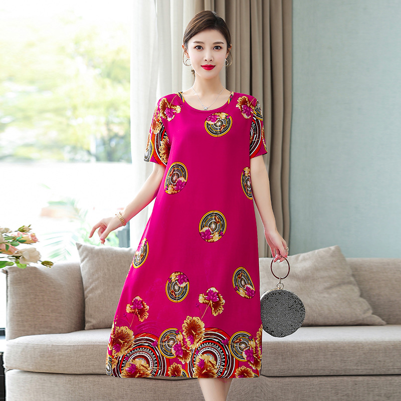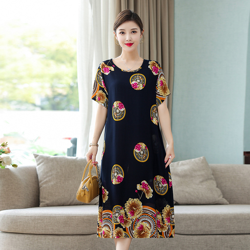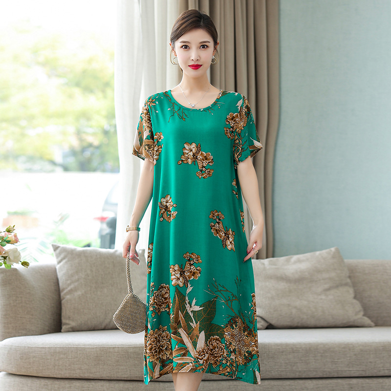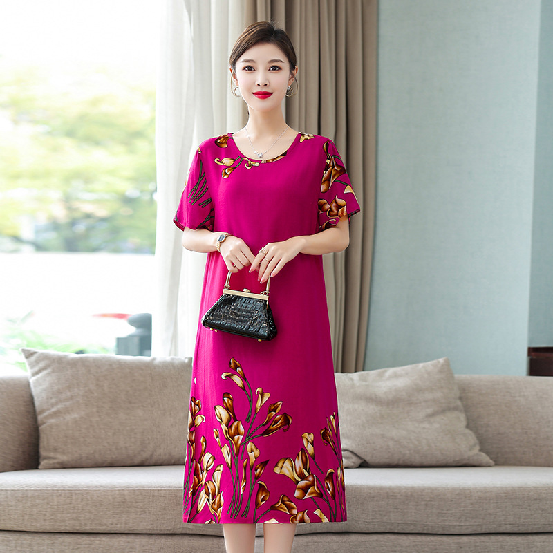 中年妈妈夏装连衣裙新款中老年女棉绸中长款宽松裙子人造棉沙滩裙