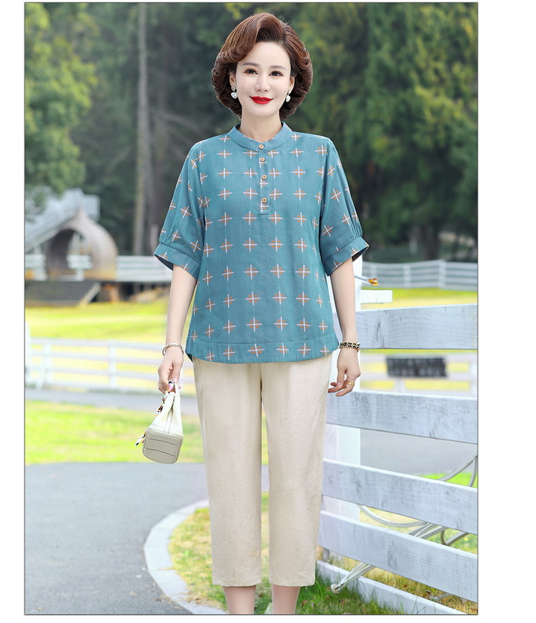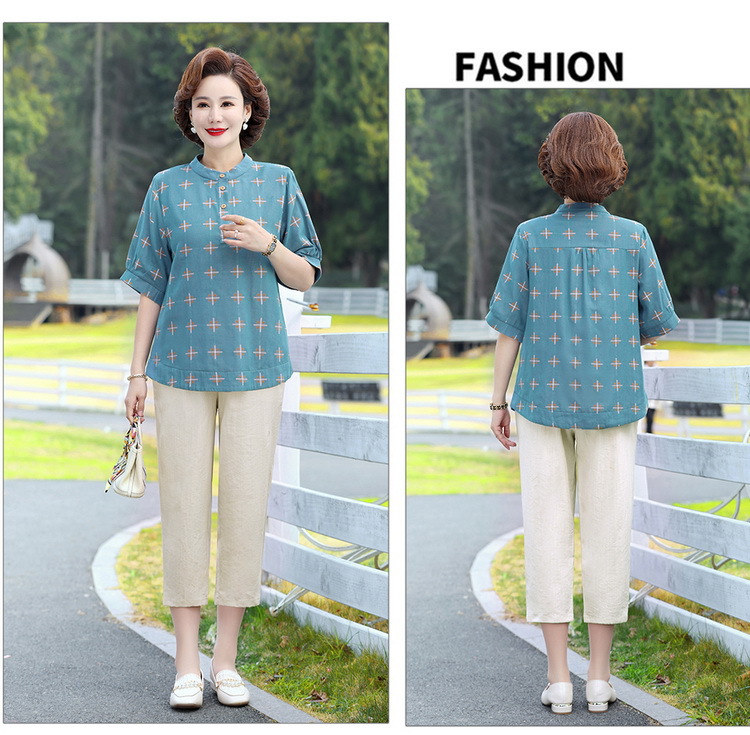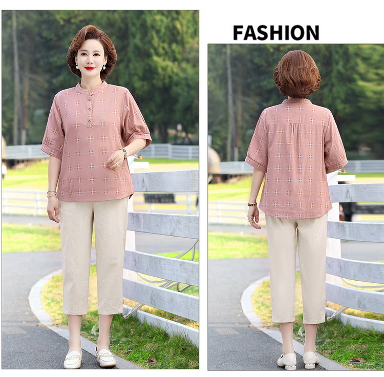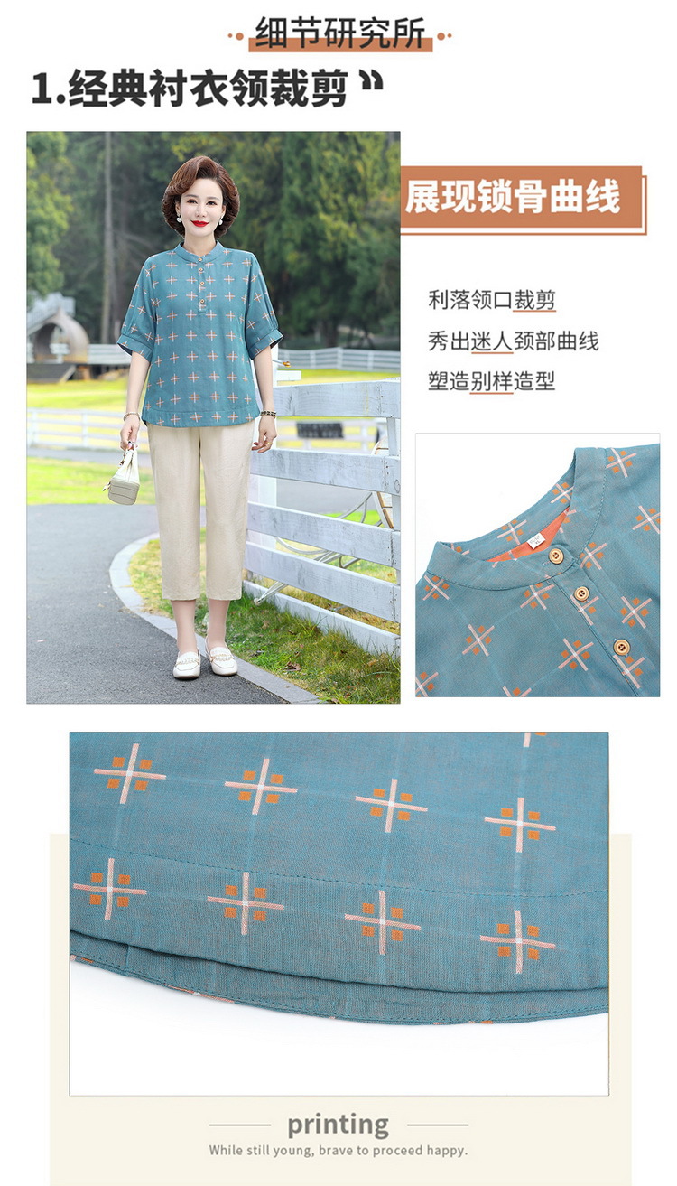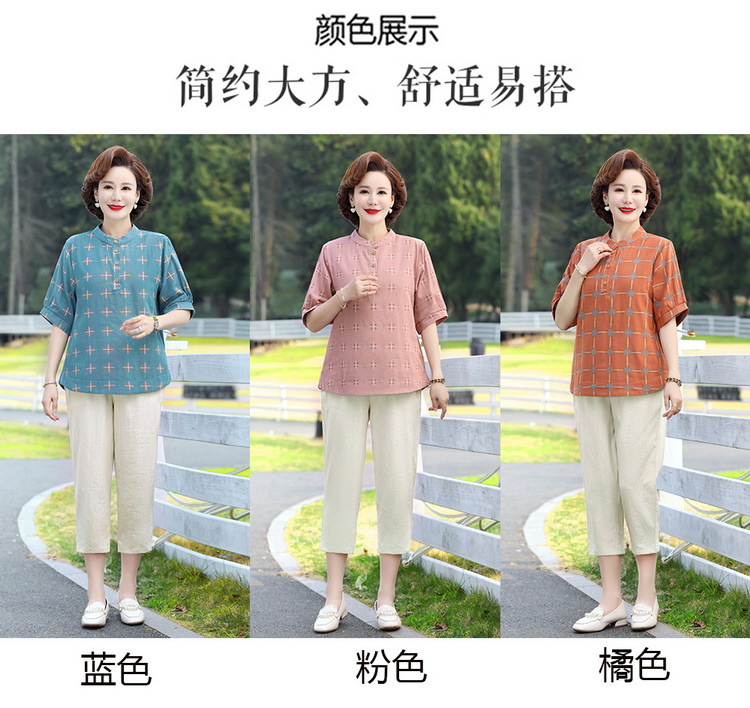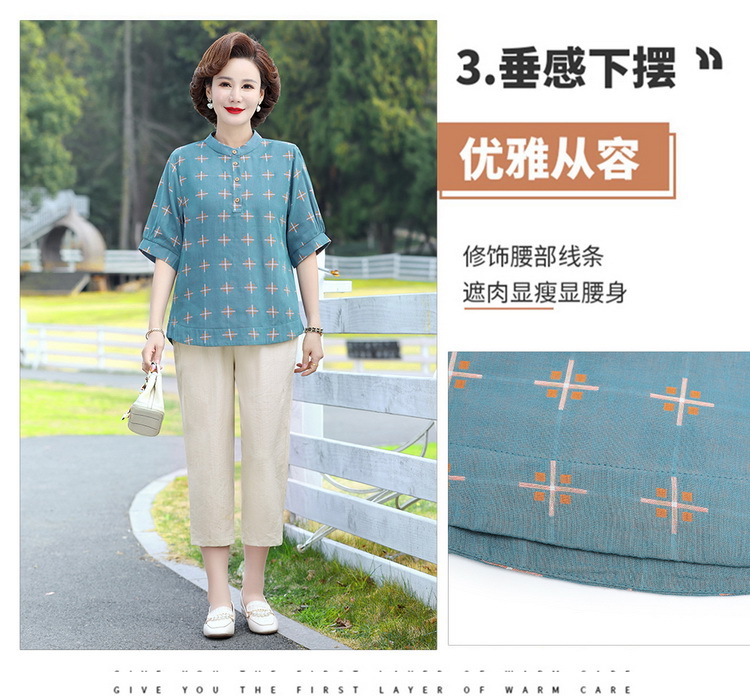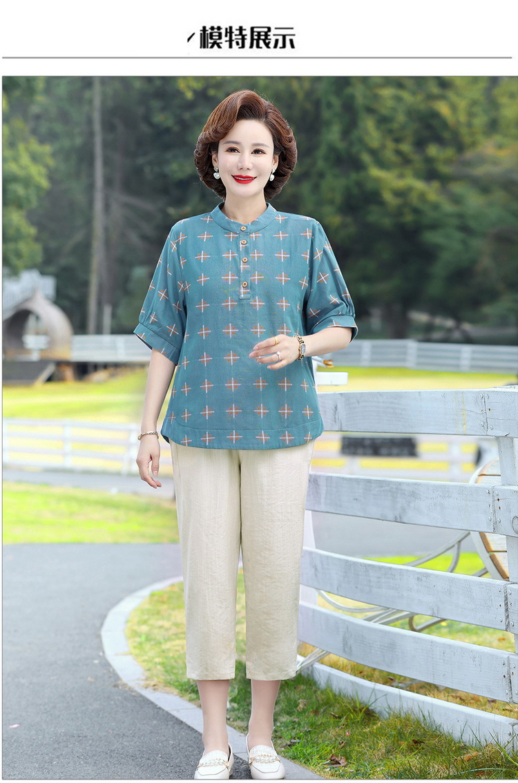 妈妈夏装时尚两件套中年妇女中袖全棉T恤中老年透气纯棉小衫上衣