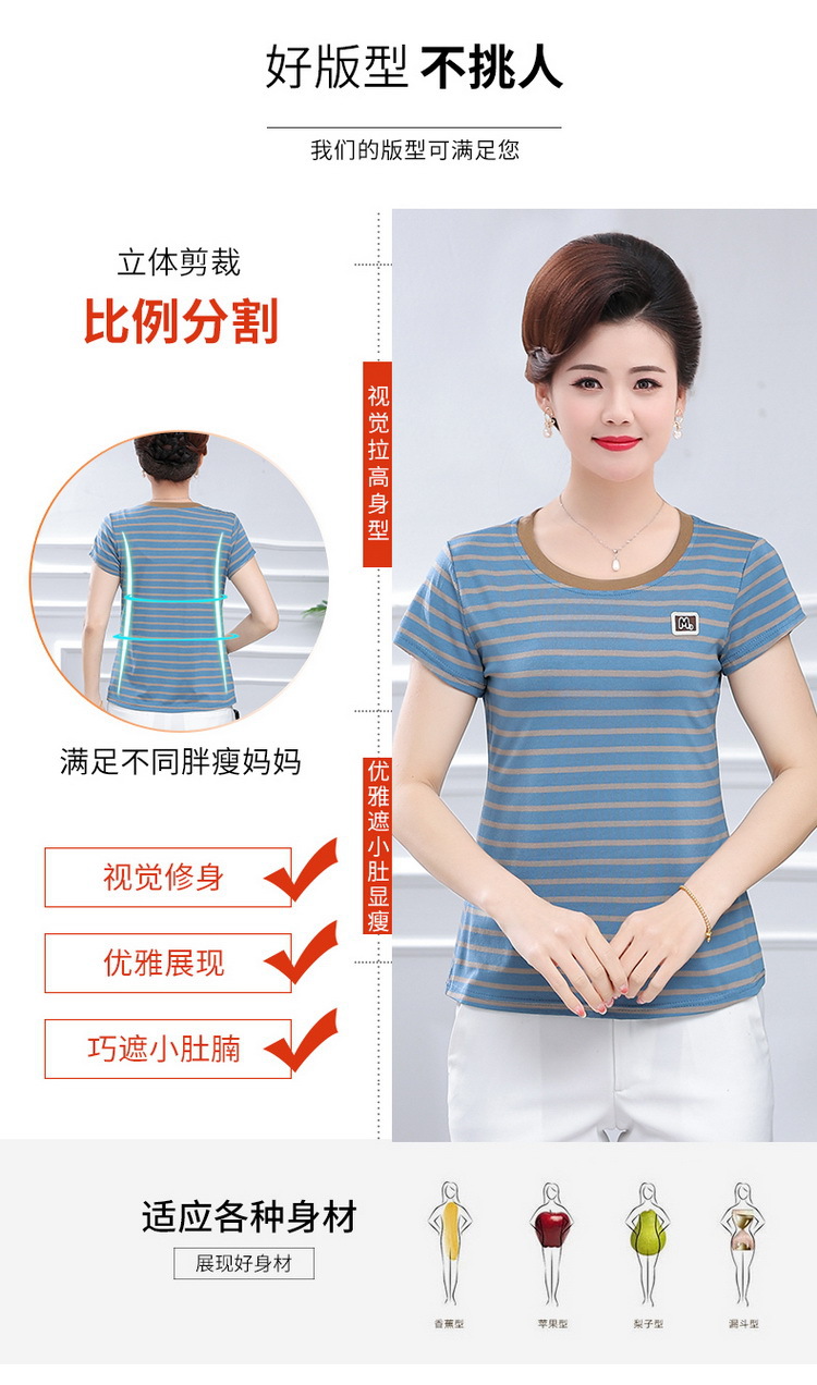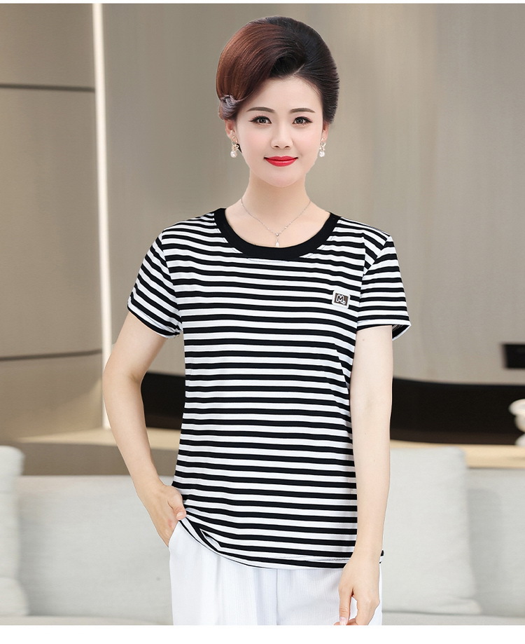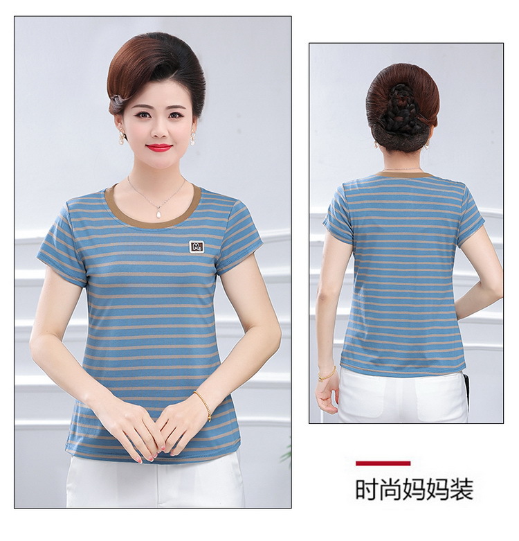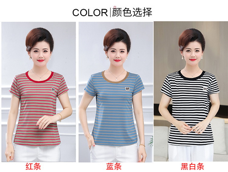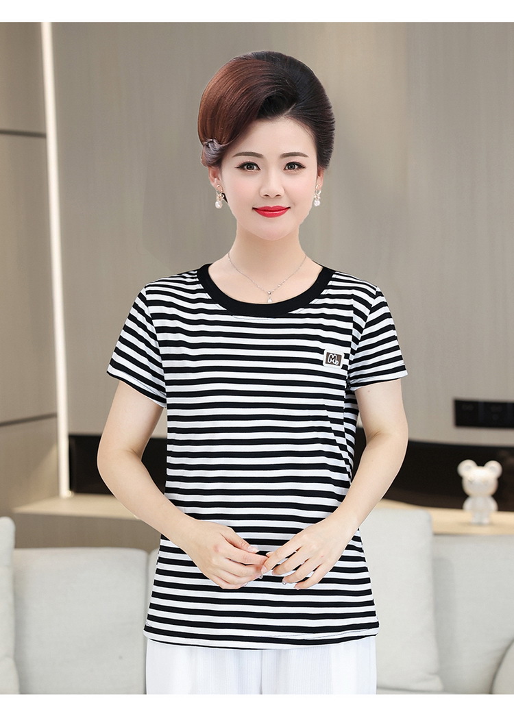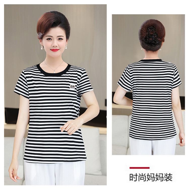中老年夏装短袖棉t恤女装新款妈妈装圆领小衫黑白条纹T恤百搭上衣